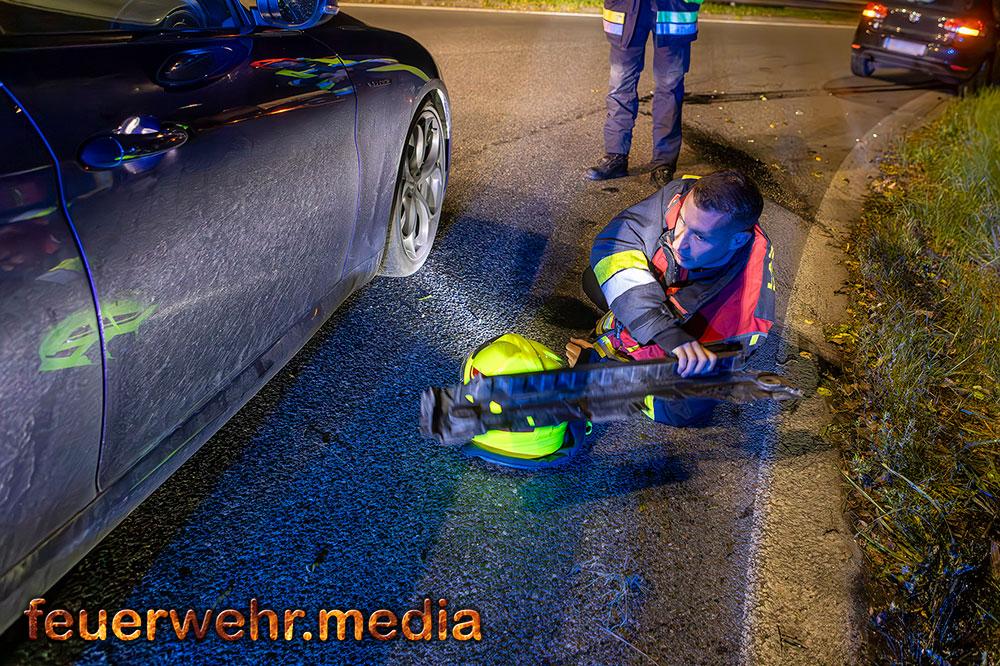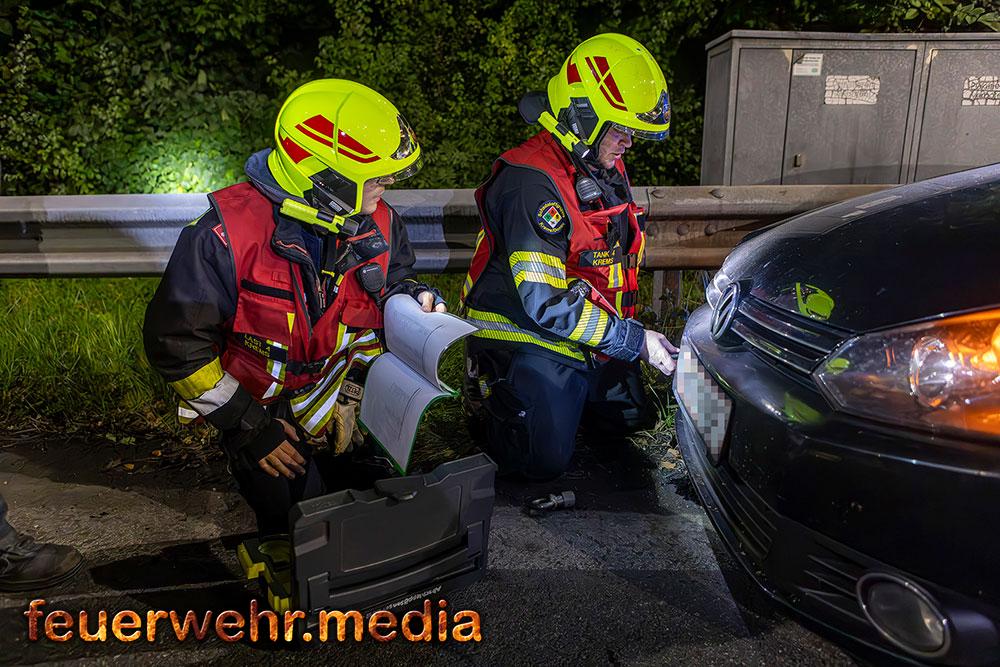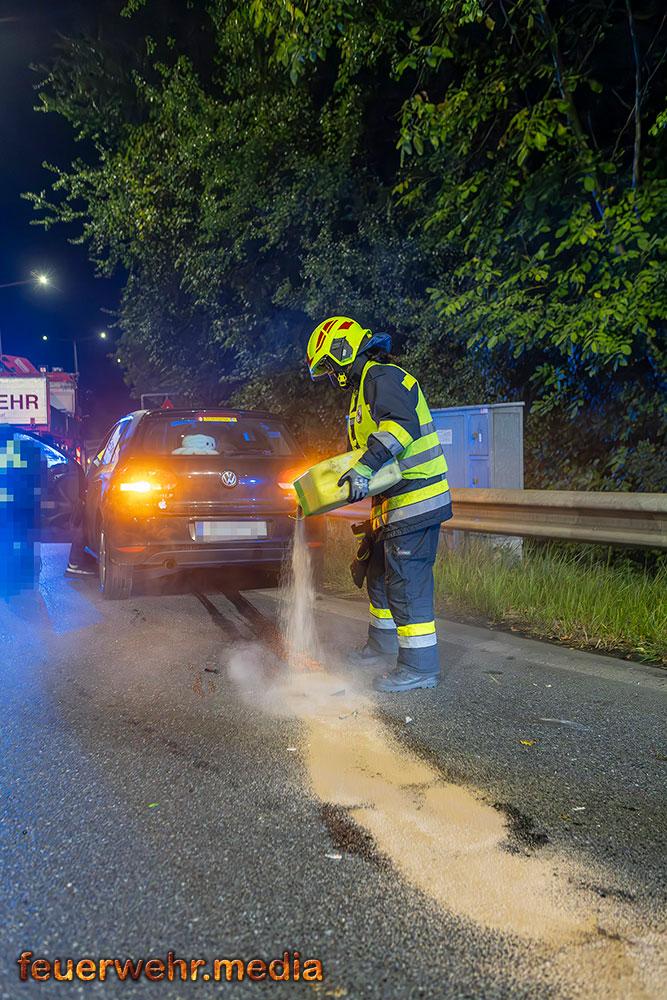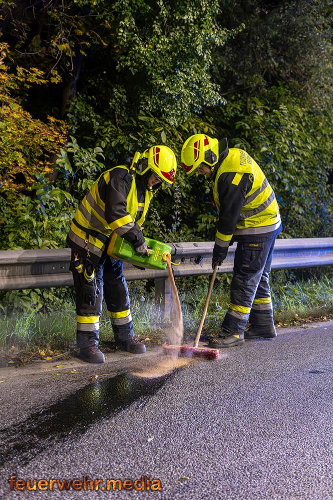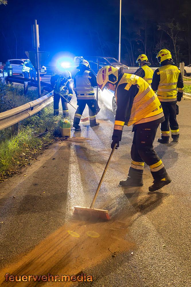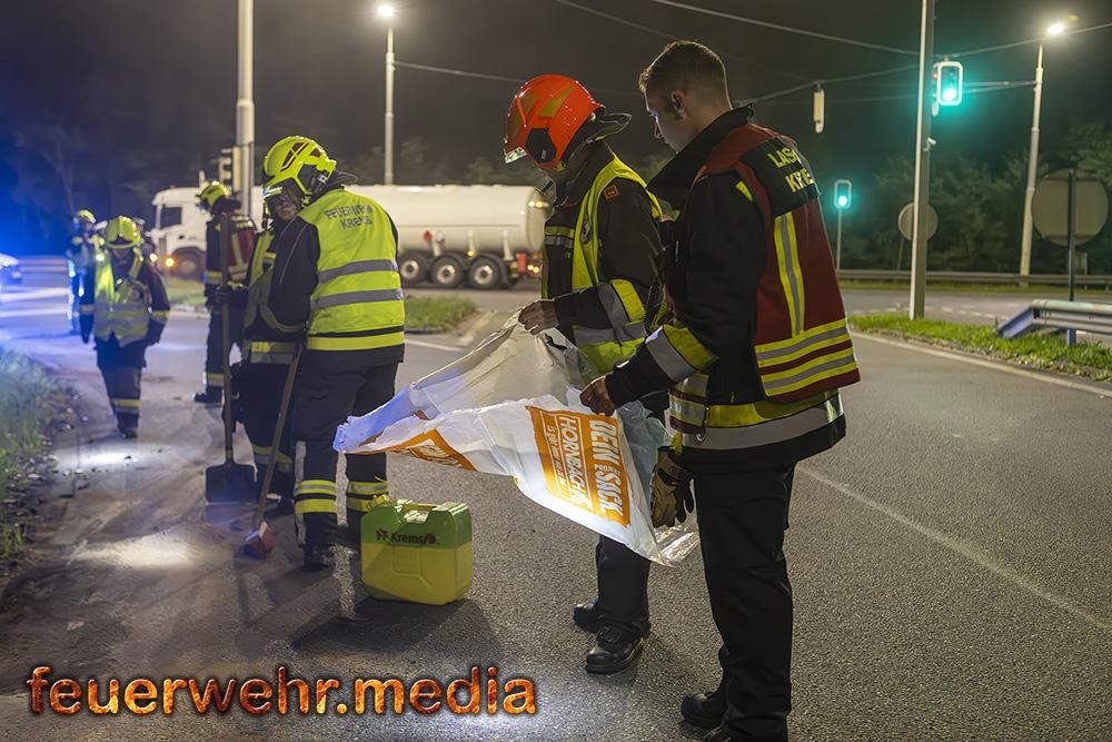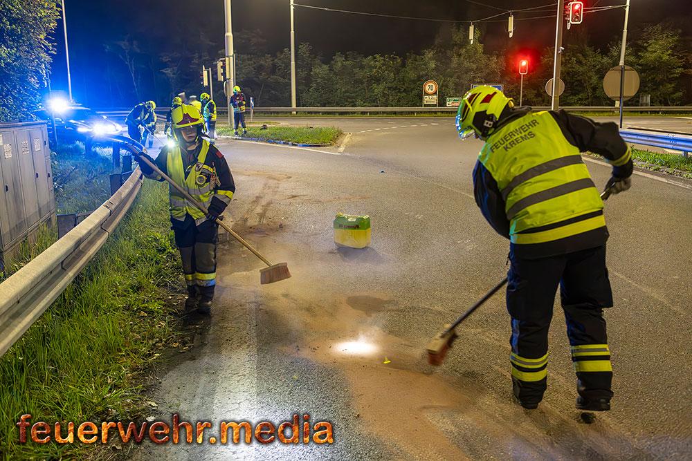 Beim Eintreffen der Feuerwehr am Einsatzort war die Unfallstelle bereits durch Beamte der Autobahnpolizei Krems abgesichert. Die Hauptaufgabe der Feuerwehr bestand zunächst darin, die Unfallstelle weiträumig zusätzlich abzusichern und sofort mit der Bindung der ausgelaufenen Betriebsmittel zu beginnen, um die Umwelt und weitere Verkehrsteilnehmer nicht zu gefährden.