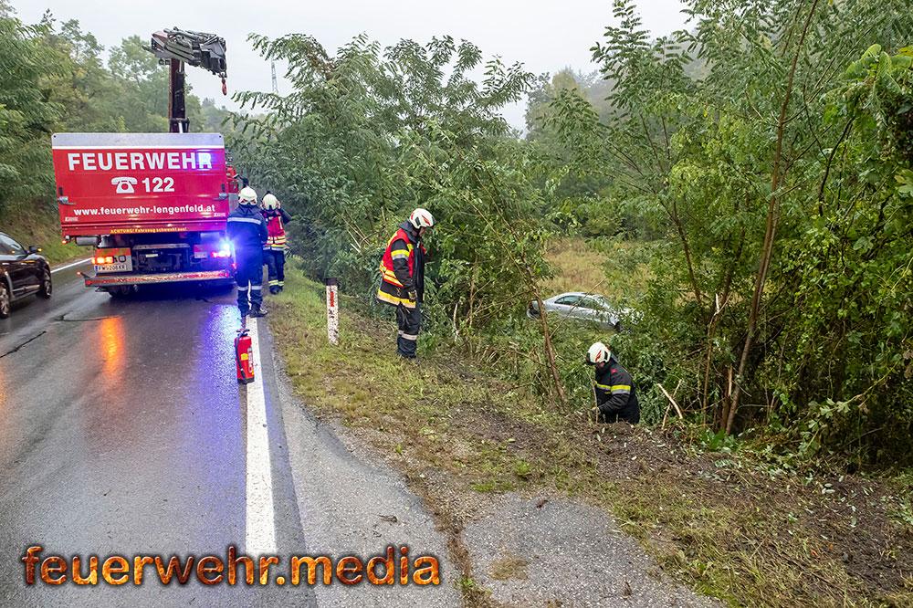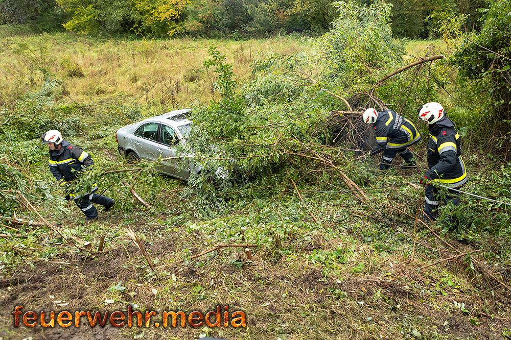 Gegen 7.30 Uhr wurde die Freiwillige Feuerwehr Lengenfeld zu dem Verkehrsunfall alarmiert. Die Fahrerin einer Limousine hatte in einer Schreckreaktion versucht, das plötzlich auf der Fahrbahn auftauchende Wildtier zu umfahren. Durch die regennasse Fahrbahn verlor sie die Kontrolle über ihr Fahrzeug, geriet ins Schleudern und stürzte in der Folge durch mehrere Bäume in den Straßengraben, bevor der Wagen auf der angrenzenden Wiese zum Stillstand kam. Die Fahrerin konnte sich glücklicherweise selbst aus dem stark beschädigten Fahrzeug befreien.