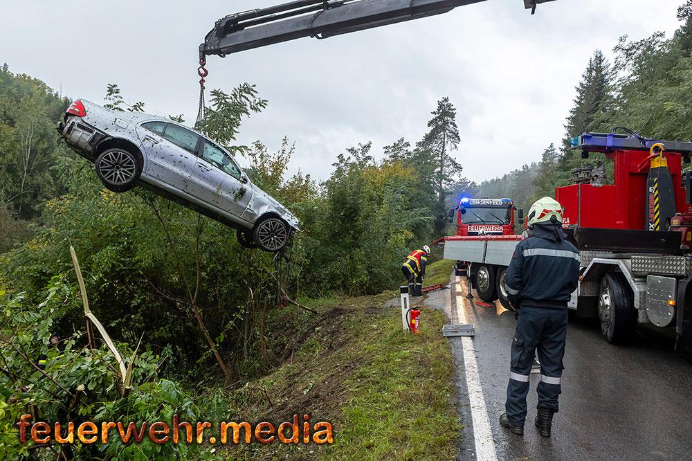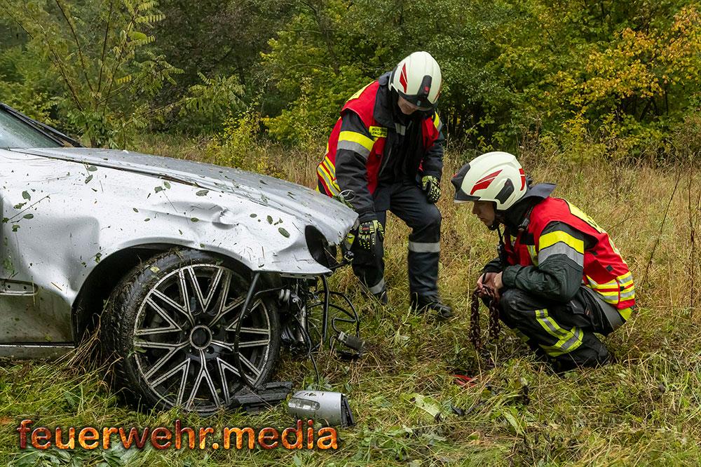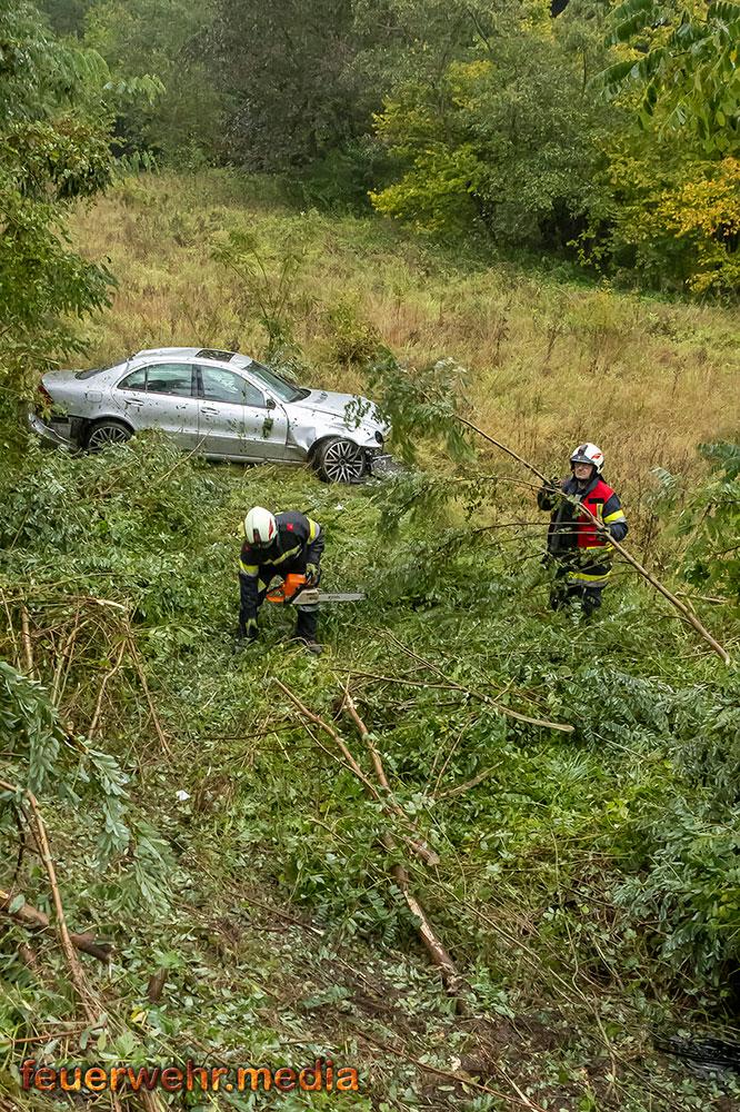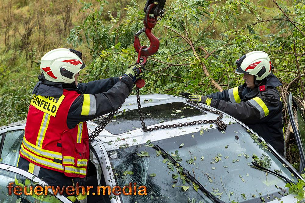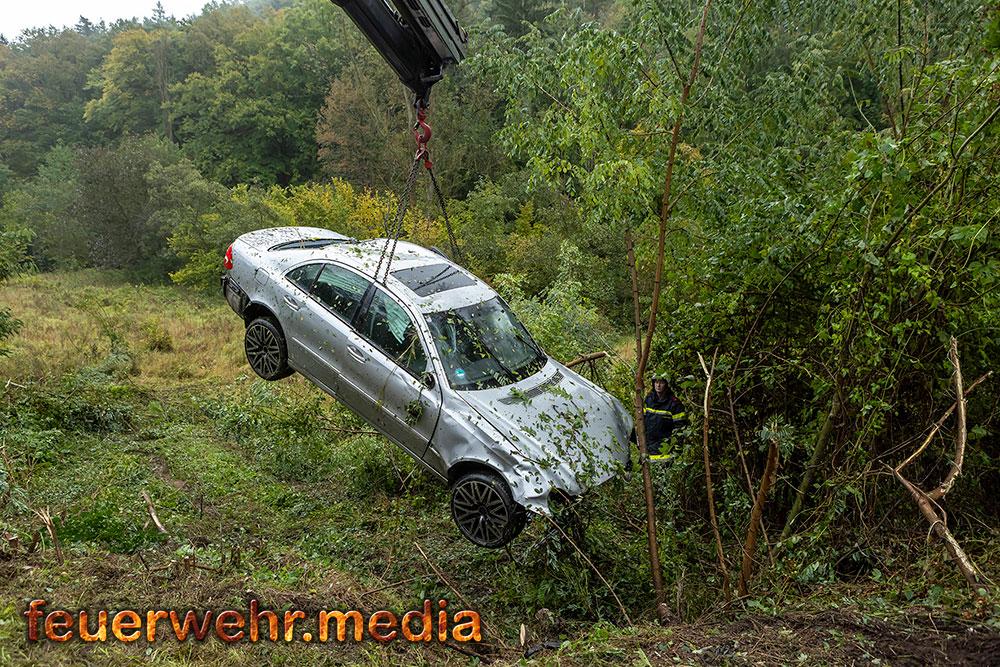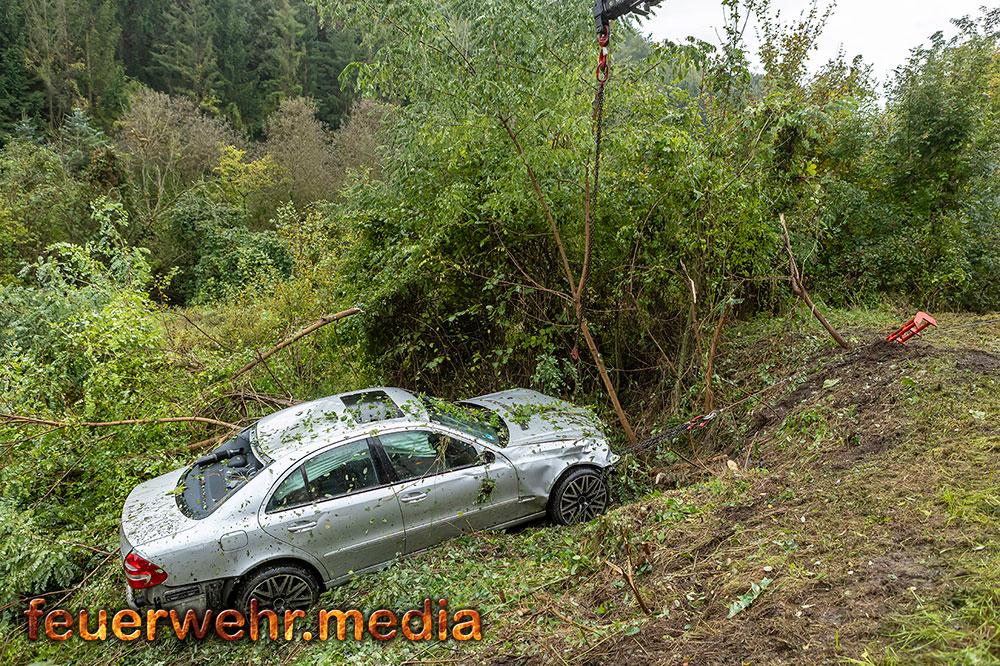Um das Fahrzeug überhaupt erreichen und bergen zu können, mussten zunächst mehrere Bäume am Straßenrand mittels Motorkettensäge gefällt werden. Erst dann konnte die Seilwinde des Rüstlöschfahrzeuges in Stellung gebracht werden, um die Limousine die steile Böschung hinaufzuziehen.