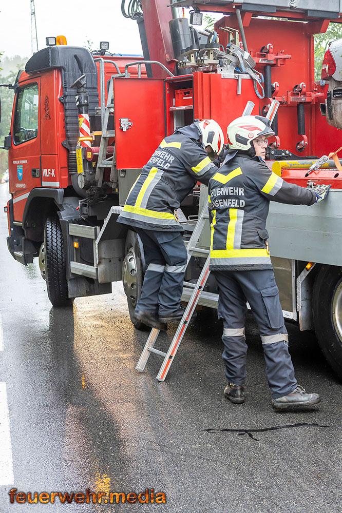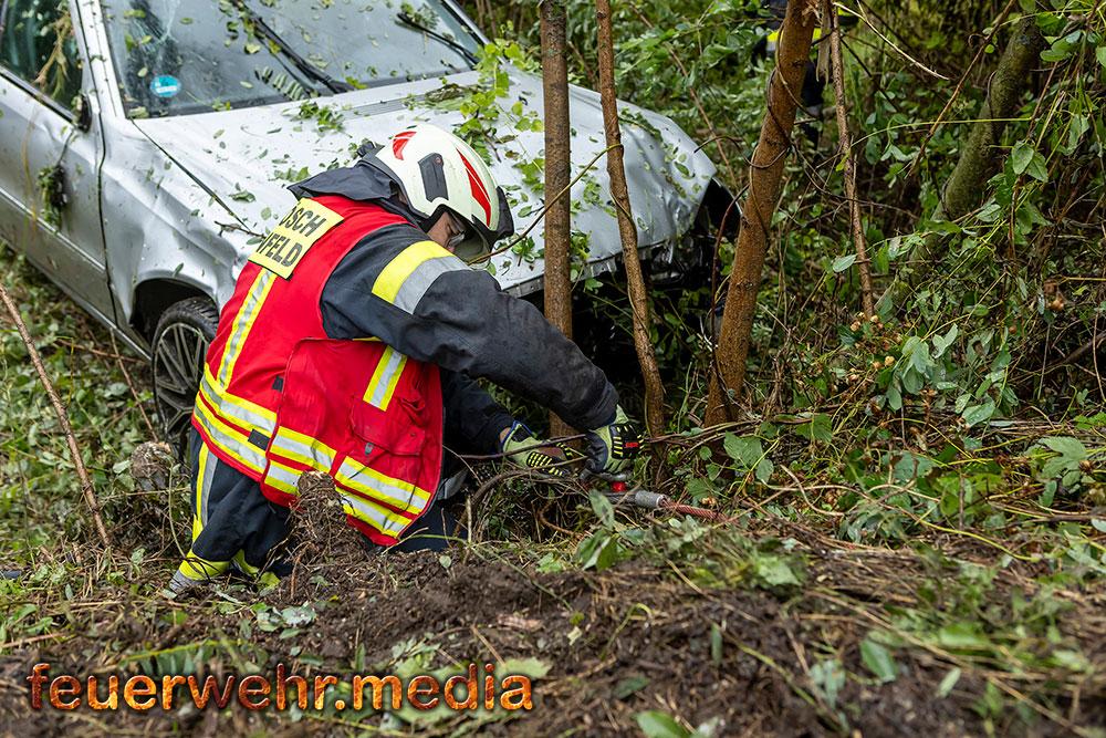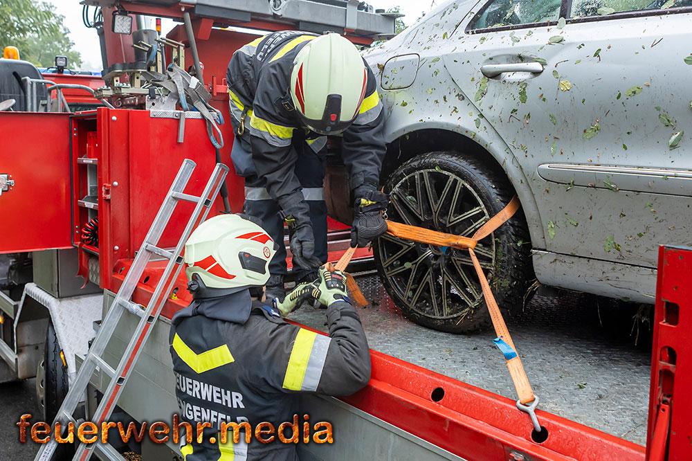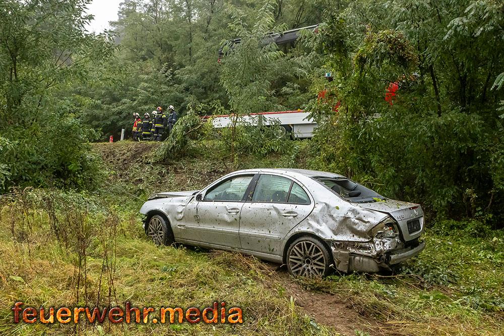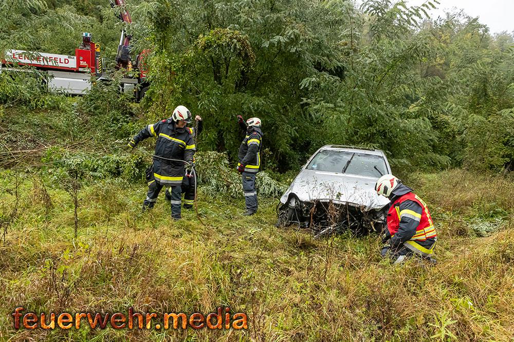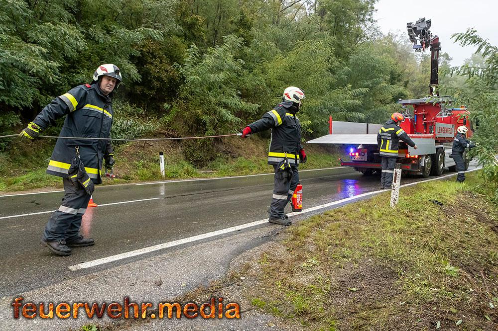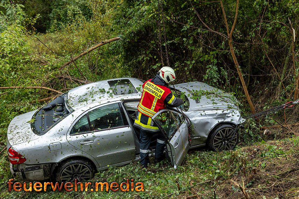 Um das Fahrzeug überhaupt erreichen und bergen zu können, mussten zunächst mehrere Bäume am Straßenrand mittels Motorkettensäge gefällt werden. Erst dann konnte die Seilwinde des Rüstlöschfahrzeuges in Stellung gebracht werden, um die Limousine die steile Böschung hinaufzuziehen.