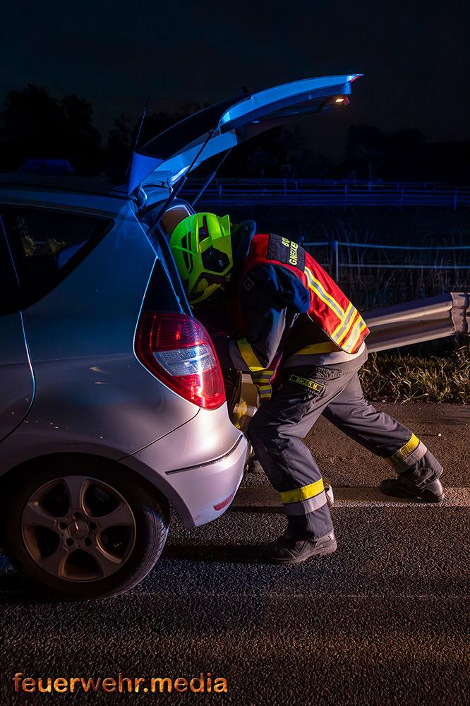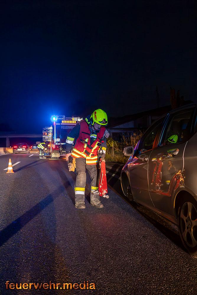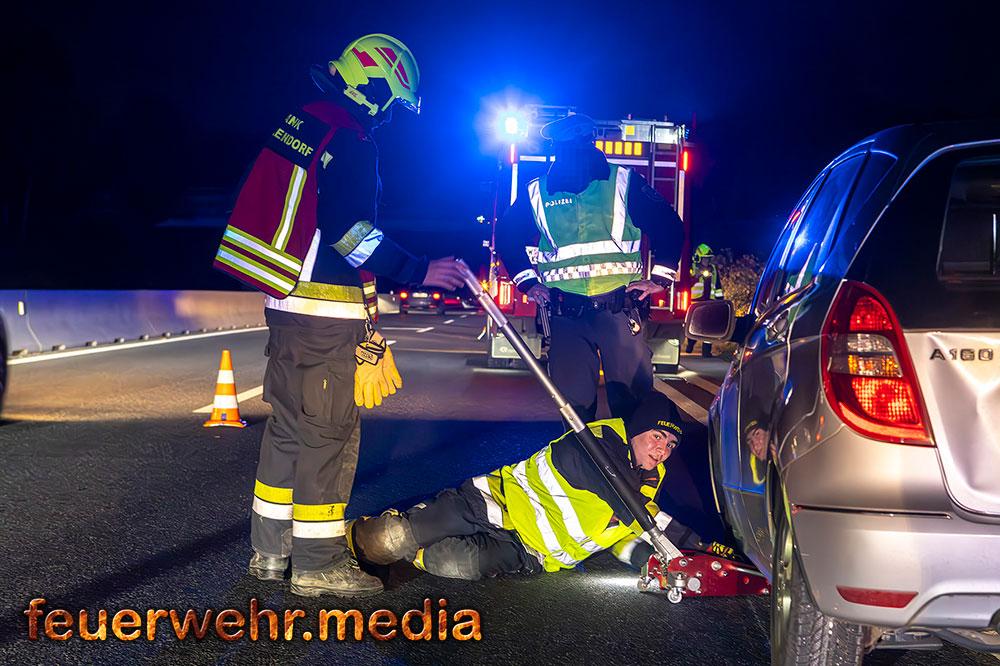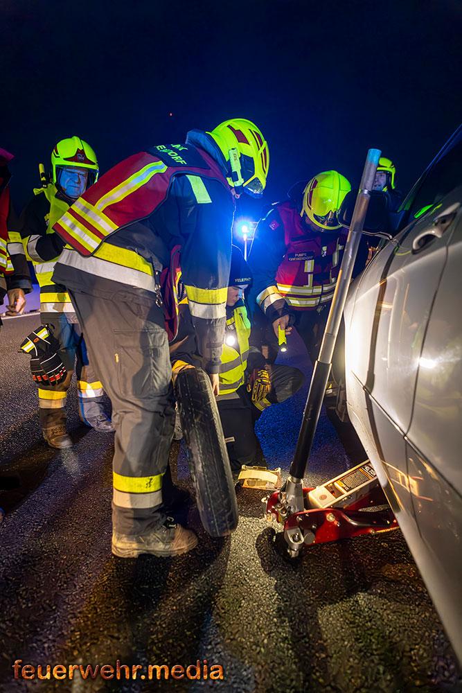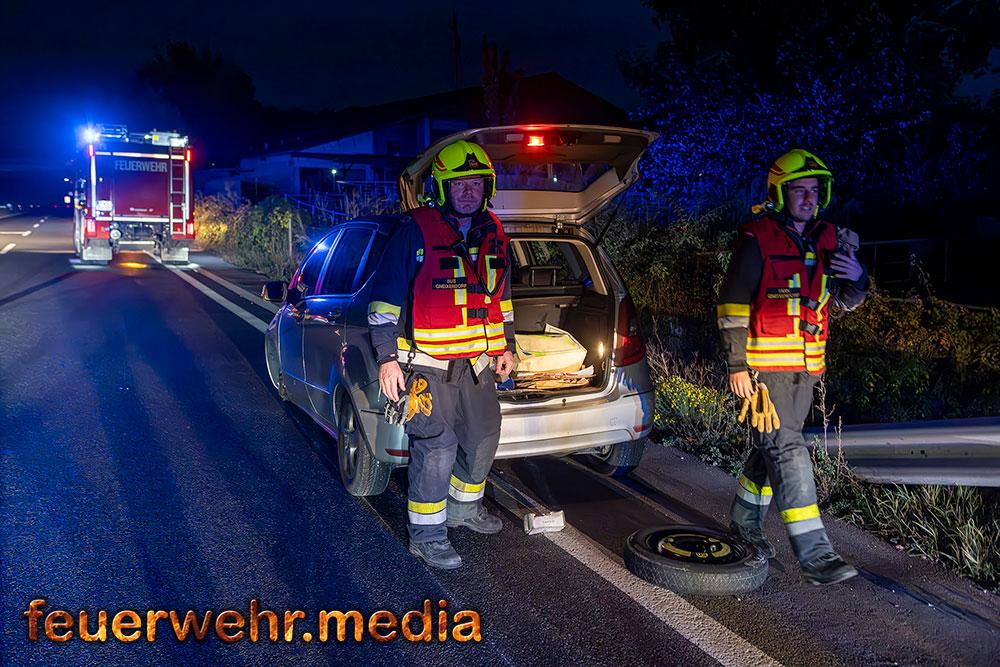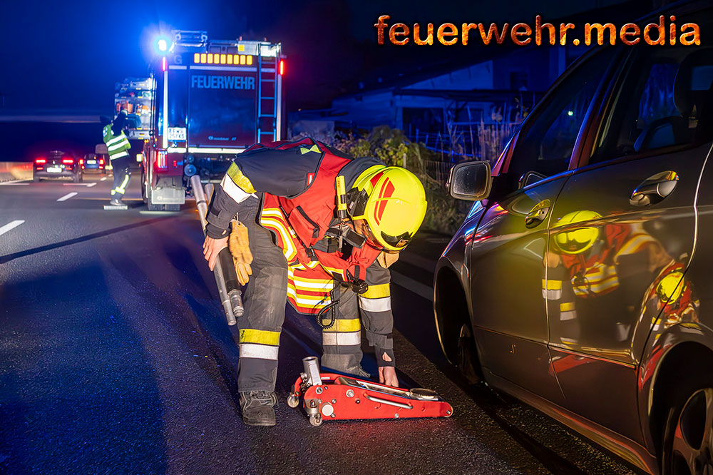 Nach dem Eintreffen der Einsatzkräfte wurde die Einsatzstelle gemeinsam mit der Autobahnpolizei großzügig abgesichert. Im Kofferraum des Fahrzeugs konnte ein Notrad aufgefunden werden, das in Absprache mit der Polizei montiert wurde. Anschließend wurde der Pkw von der Fahrbahn entfernt und bei einer nahegelegenen Park-&-Ride-Anlage sicher abgestellt.