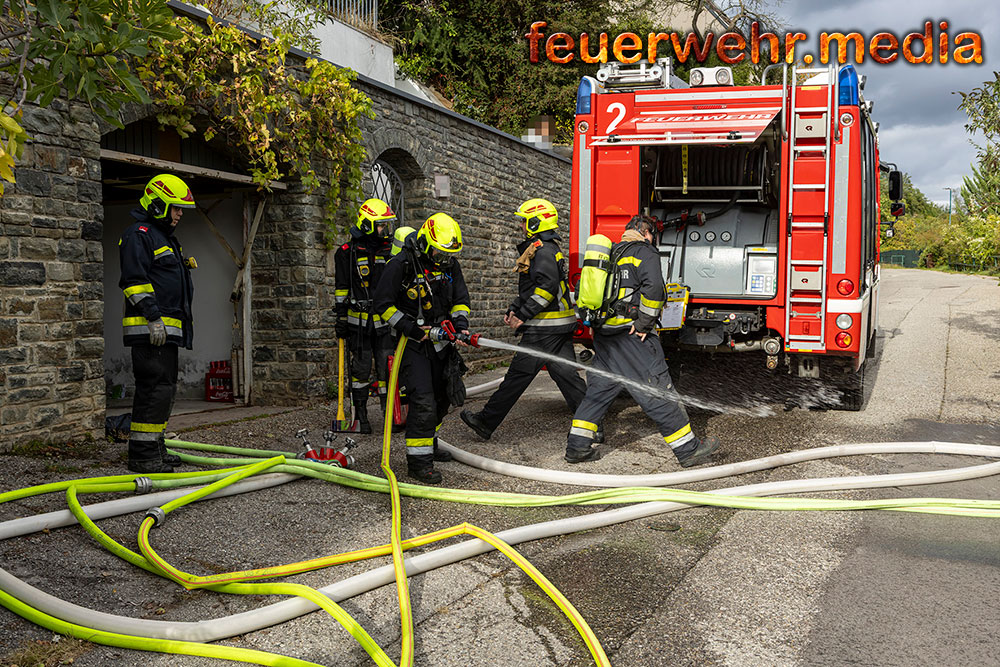 Noch bevor die Feuerwehr eintraf, versuchte der Hausbesitzer, die Flammen mit einem Pulverlöscher einzudämmen. Vor Ort eingetroffen, wies der Anrufer die Einsatzkräfte ein. Während der Fahrzeugkommandant die Lage erkundete, bereitete die Mannschaft bereits eine Löschleitung vor, um sofort eingreifen zu können.