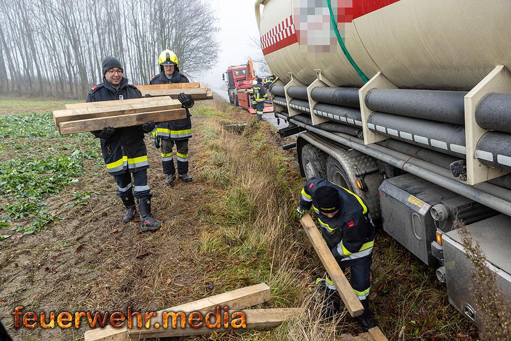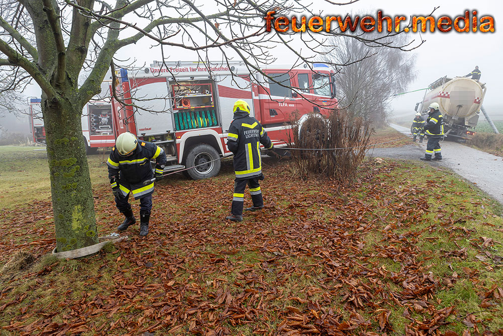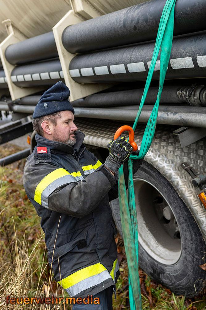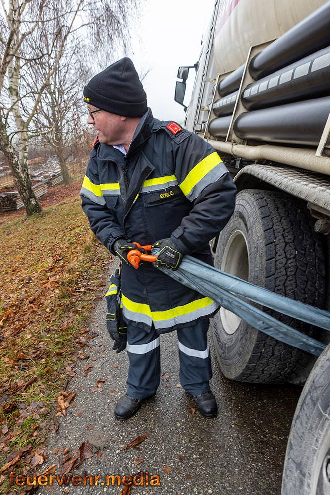 Nach dem Eintreffen der Verstärkung wurde die Seilwinde der FF Lichtenau mittels Umlenkrolle an der Anhängerkupplung des verunfallten Lkw angeschlagen. Nachdem die Einsatzkräfte den Entwässerungsgraben mithilfe der Holzstaffeln aus dem Kranbegleitcontainer aufgefüllt hatten, konnte das Schwerfahrzeug rasch und ohne Beschädigungen aus seiner misslichen Lage befreit werden.