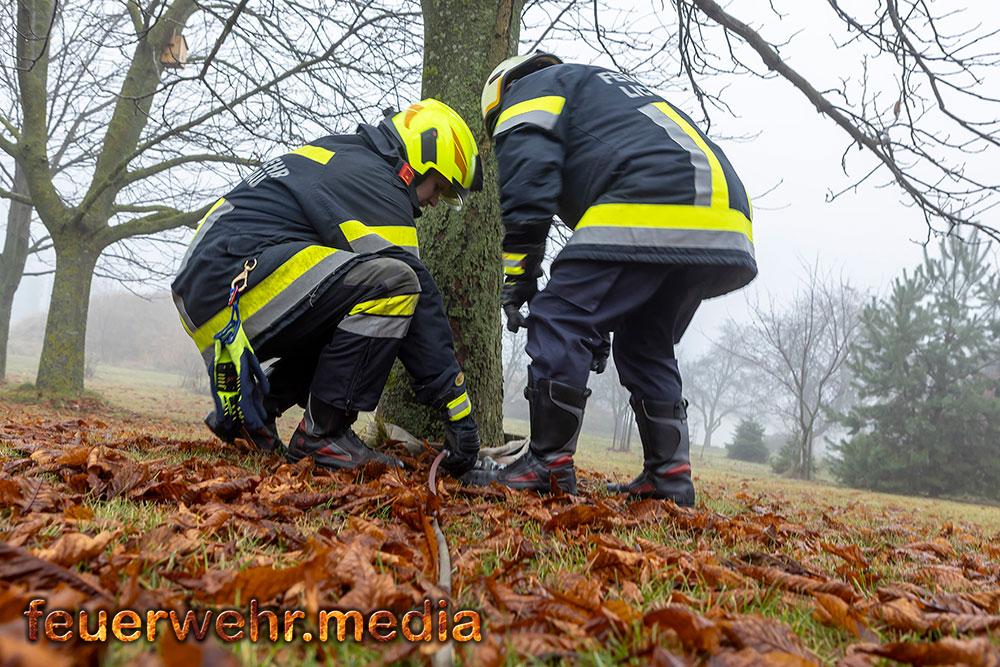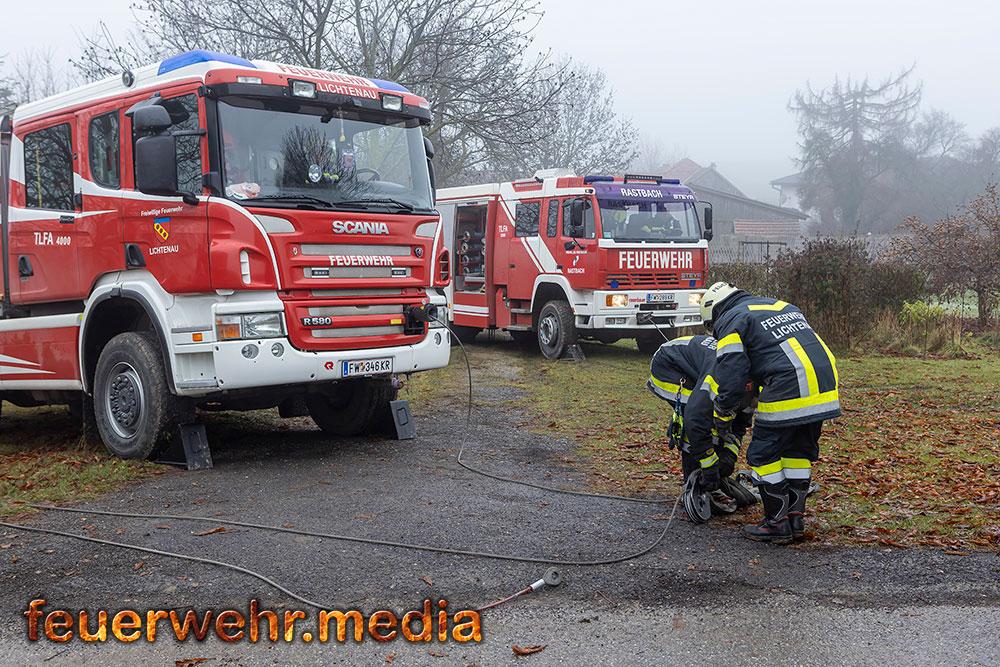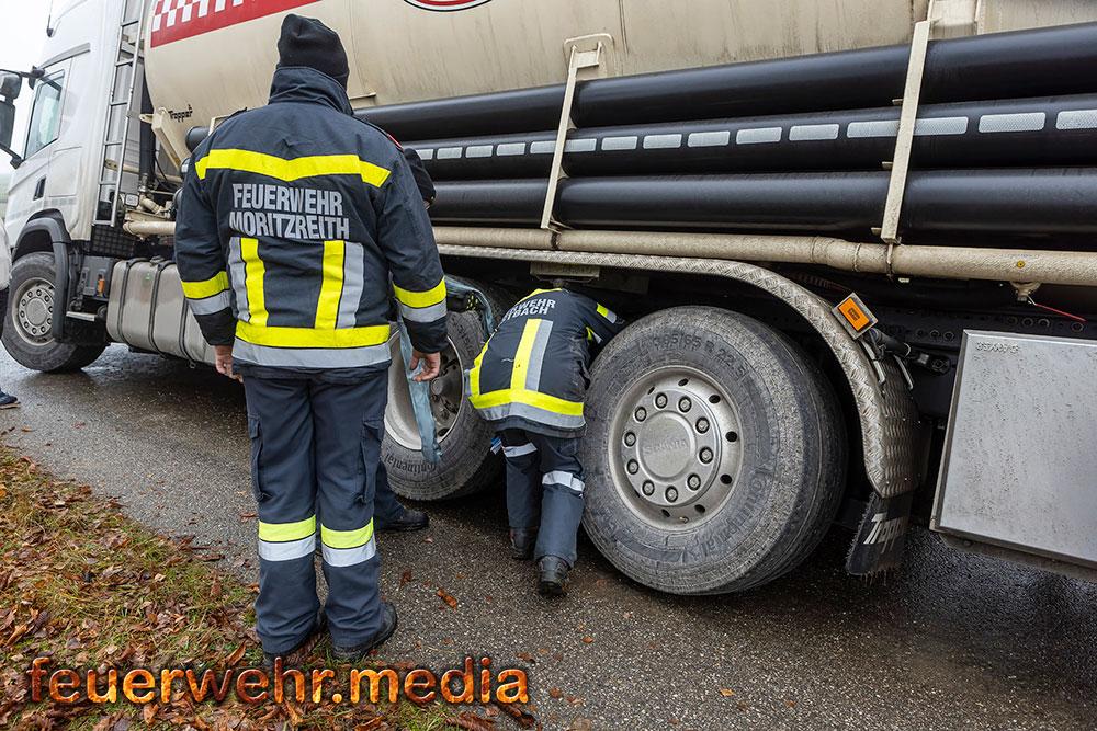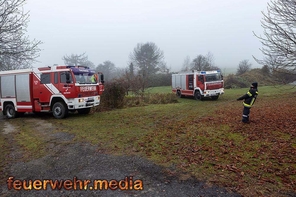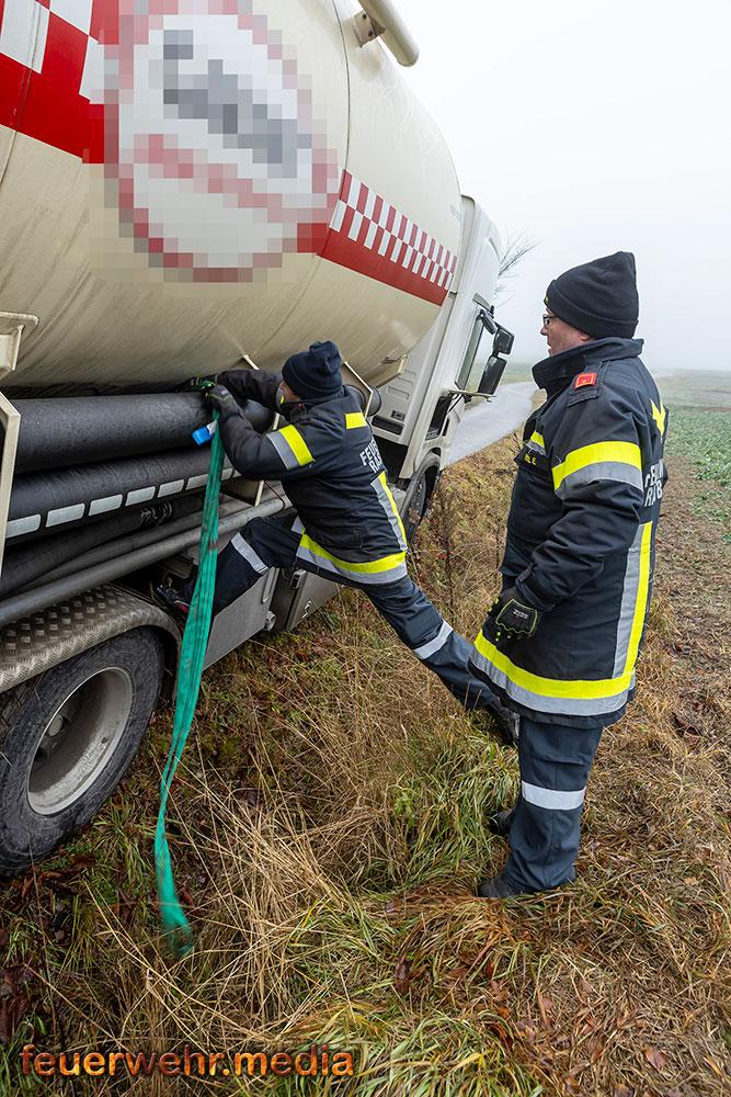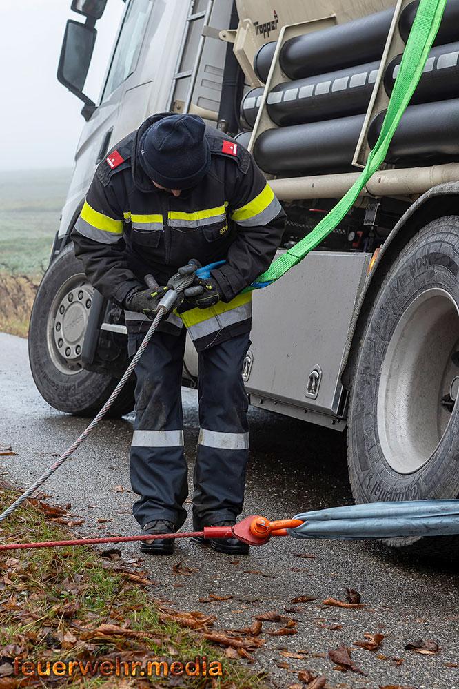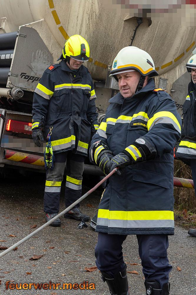 Nach einer ersten Erkundung positionierte die FF Moritzreith ihr Tanklöschfahrzeug in einer angrenzenden Wiese, um eine erste Sicherung mit der Einbauseilwinde vorzunehmen. Parallel dazu wurde das Fahrzeug der FF Rastbach in Stellung gebracht, um den Lkw zusätzlich gegen ein weiteres Abrutschen abzusichern.