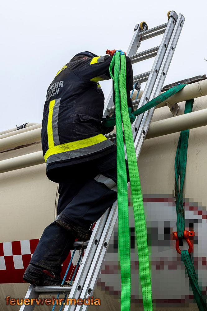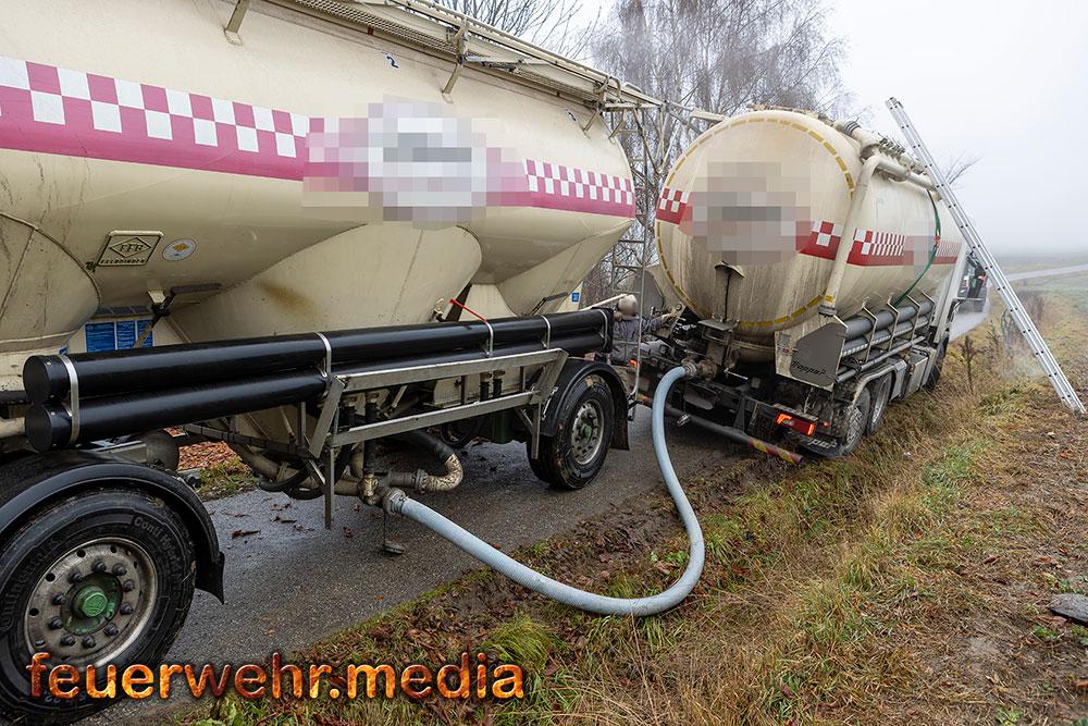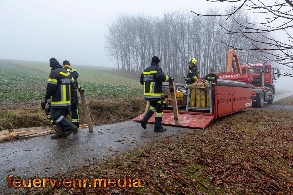 Nachdem die Doppelsicherung stand, begann die aufwendige Umladung der Fracht: Rund 9Tonnen Futtermittel mussten in einen Anhänger transferiert werden. Dieser stand in einer Nachbarortschaft und wurde von einem Feuerwehrmitglied mit dessen privatem Lkw zur Unfallstelle gebracht.
