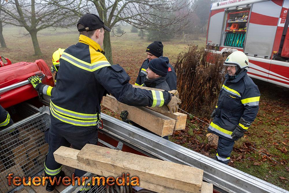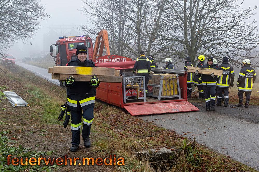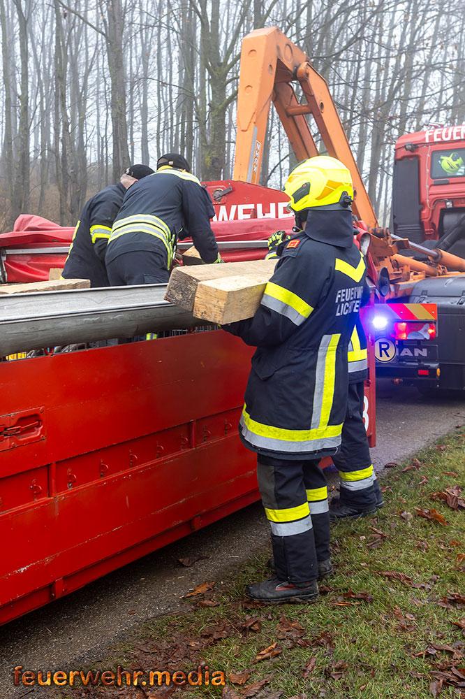 Während der Umladearbeiten wurden zur finalen Bergung weitere Kräfte nachalarmiert: Die FF Lichtenau mit einer zusätzlichen Seilwinde sowie der Kranbegleitcontainer der FF Krems an der Donau. Dieser Wechselaufbau lieferte dringend benötigte, große Mengen an Holzstaffeln, die zum Unterbauen des Lkw im Graben notwendig waren.