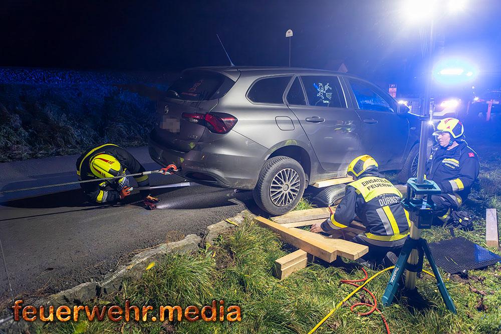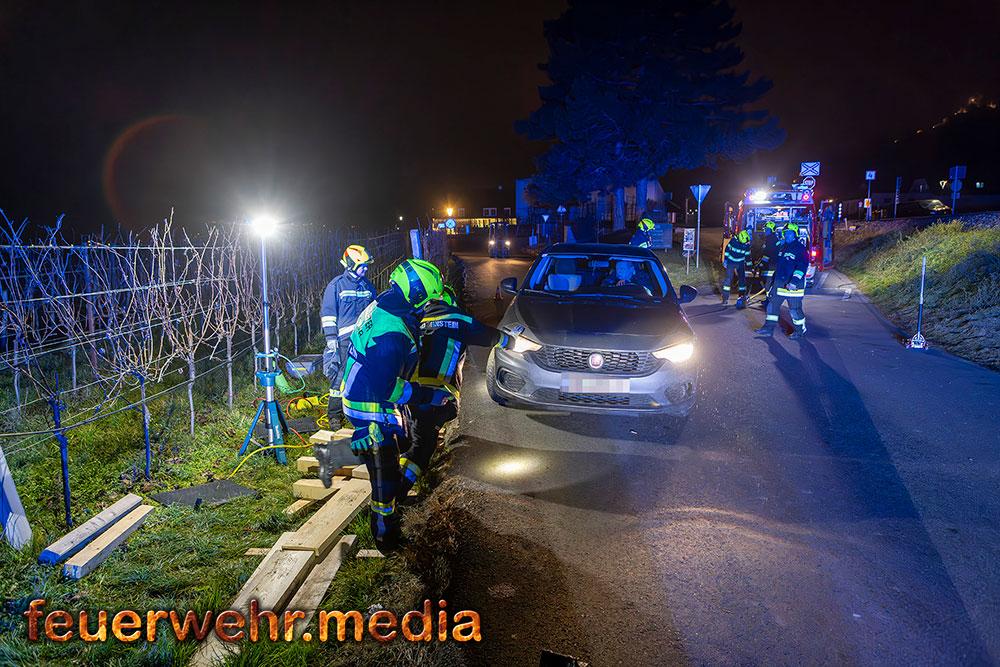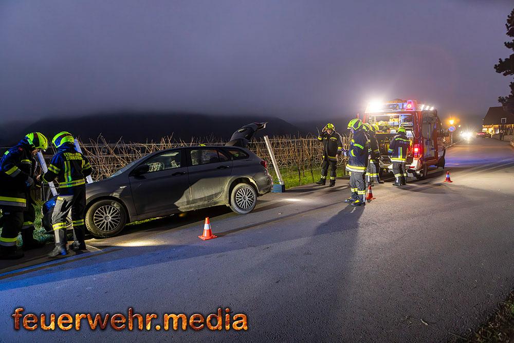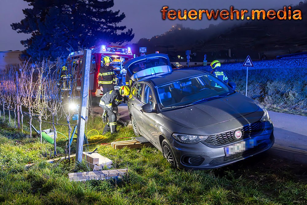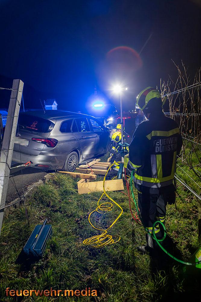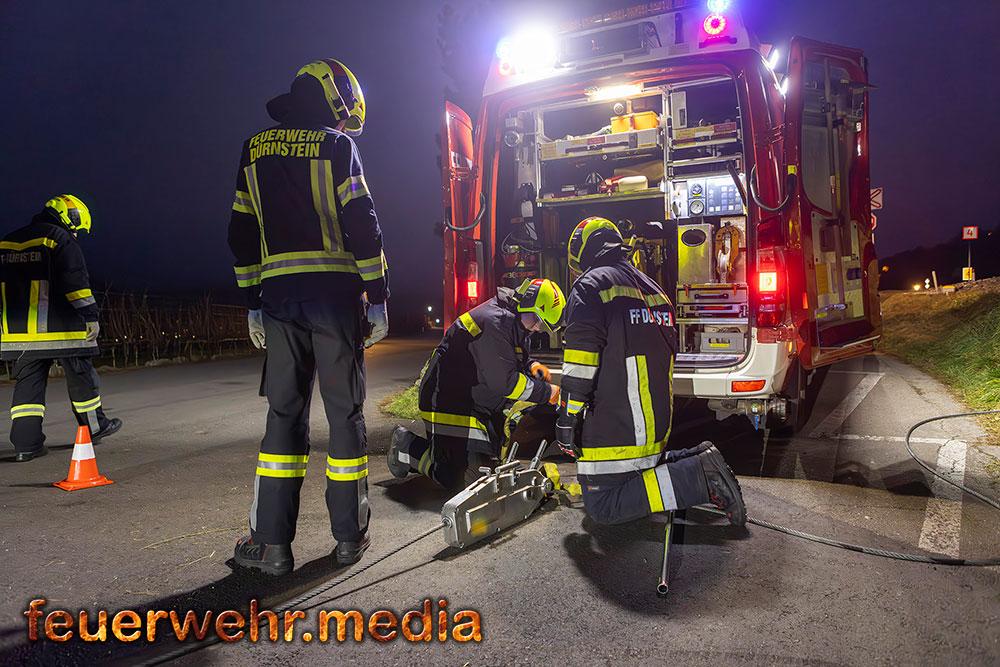 Die von der Bezirksalarmzentrale Krems alarmierte Freiwillige Feuerwehr Dürnstein rückte umgehend zum nahegelegenen Einsatzort aus. Nach der Lageerkundung wurde die Einsatzstelle abgesichert. In weiterer Folge entschied der Einsatzleiter, das Fahrzeug anzuheben und wieder auf die Fahrbahn zurückzuziehen.