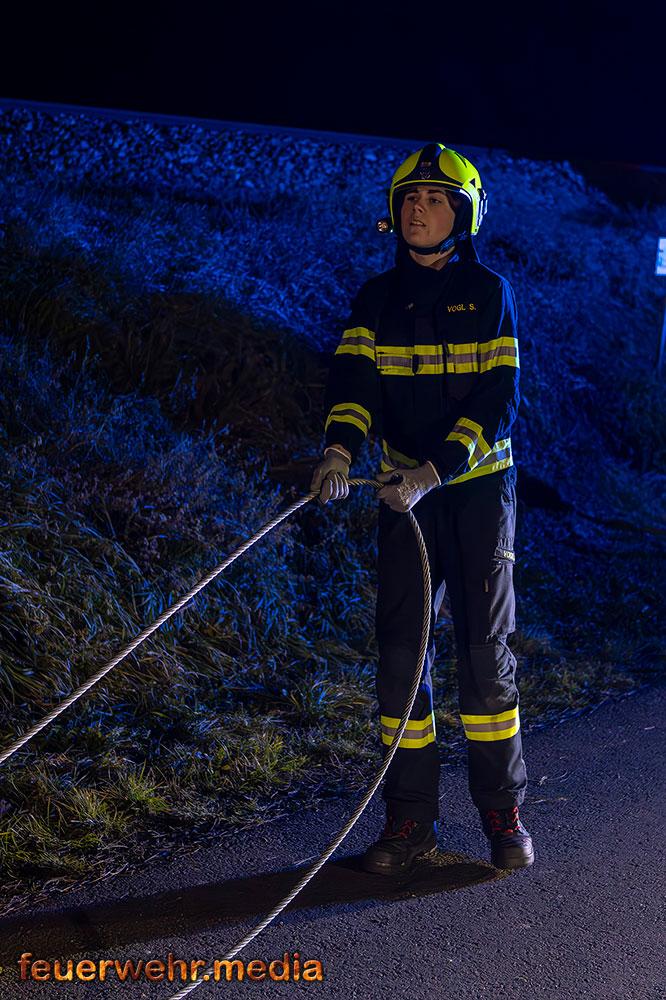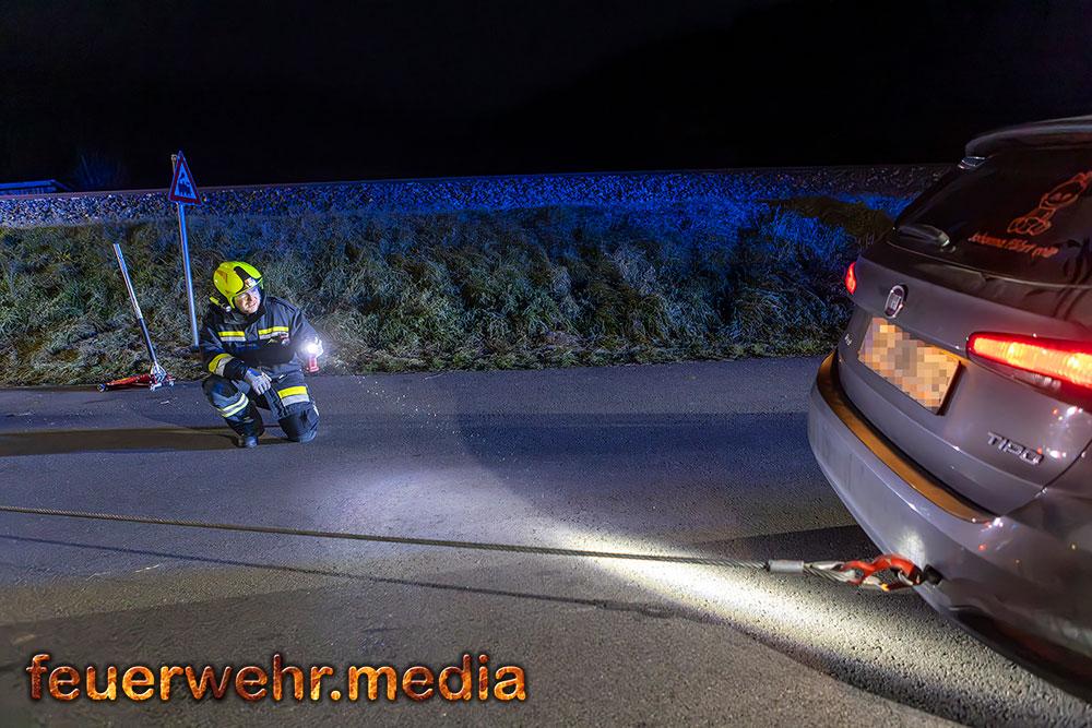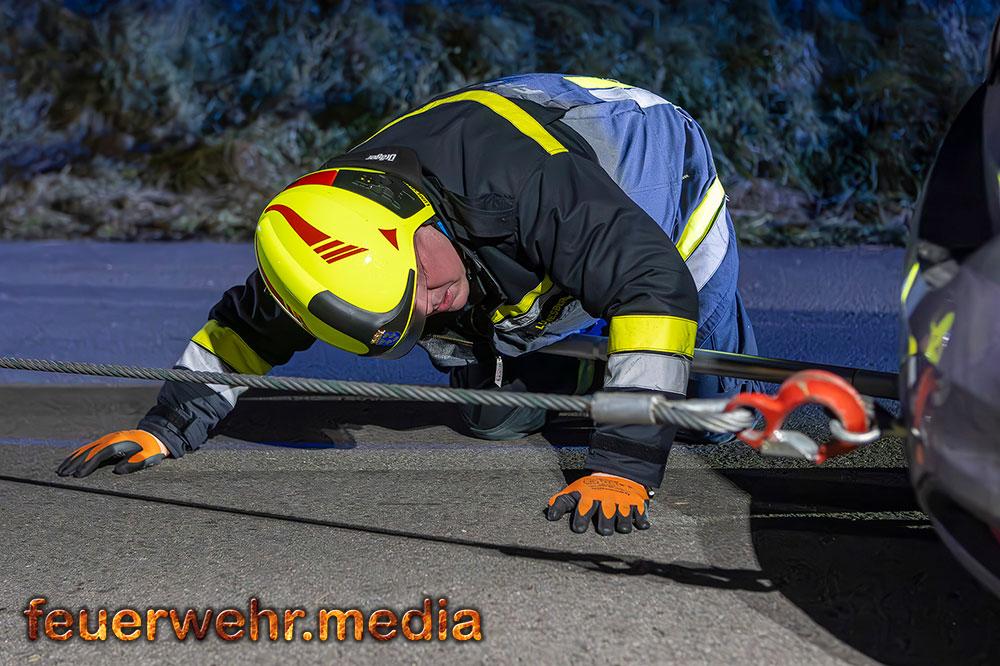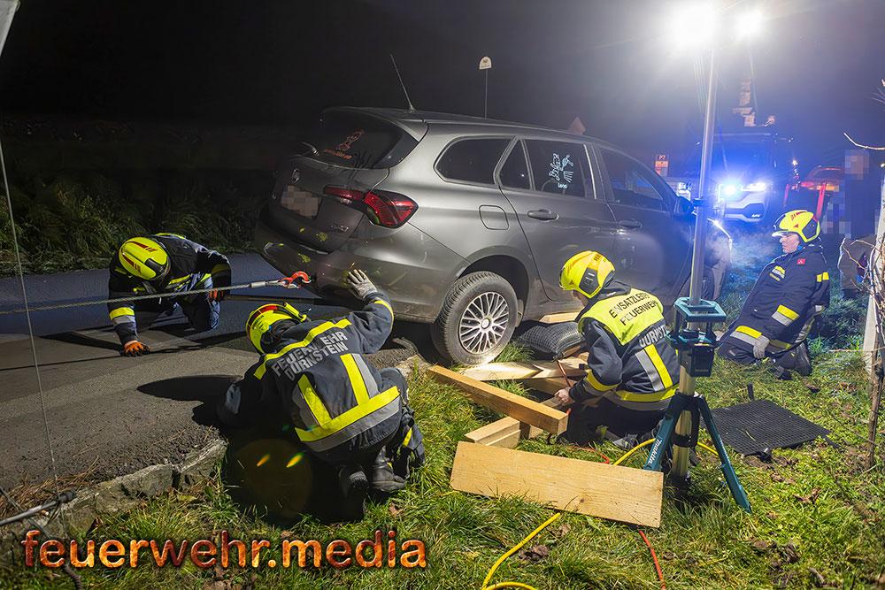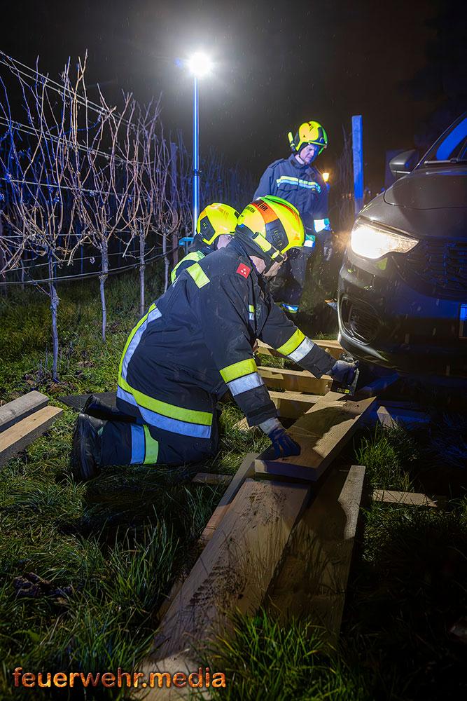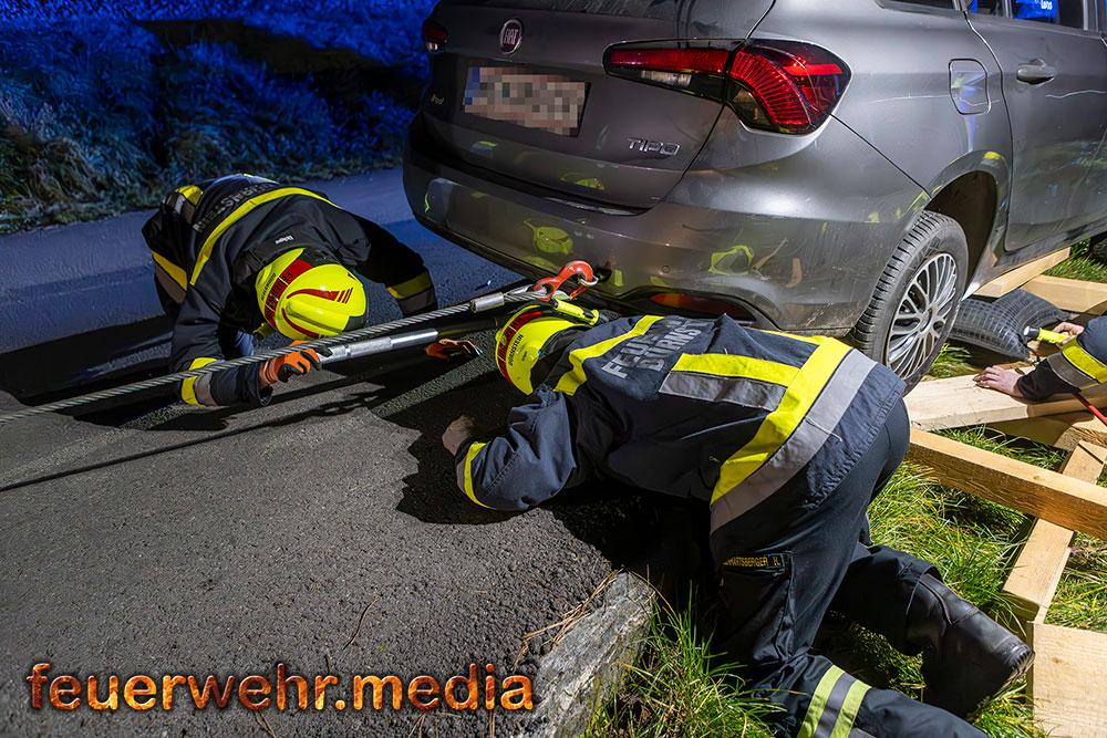 Zur Durchführung der Bergung wurde mithilfe des Gabelstaplers eine Gitterbox mit Unterlegeholz zur Einsatzstelle gebracht. Das Fahrzeug wurde anschließend unterbaut sowie mit einem Hebekissen und einem Wagenheber angehoben um auch die Räder mit Holz unterbauen zu können. Danach konnte der Pkw mittels Greifzug wieder auf die Straße gezogen werden.