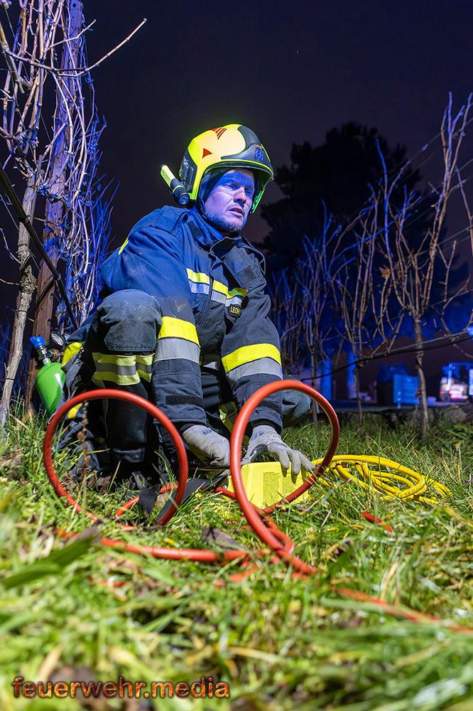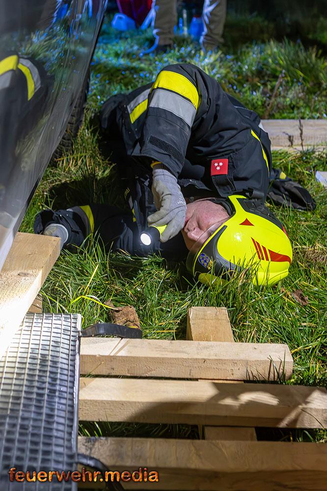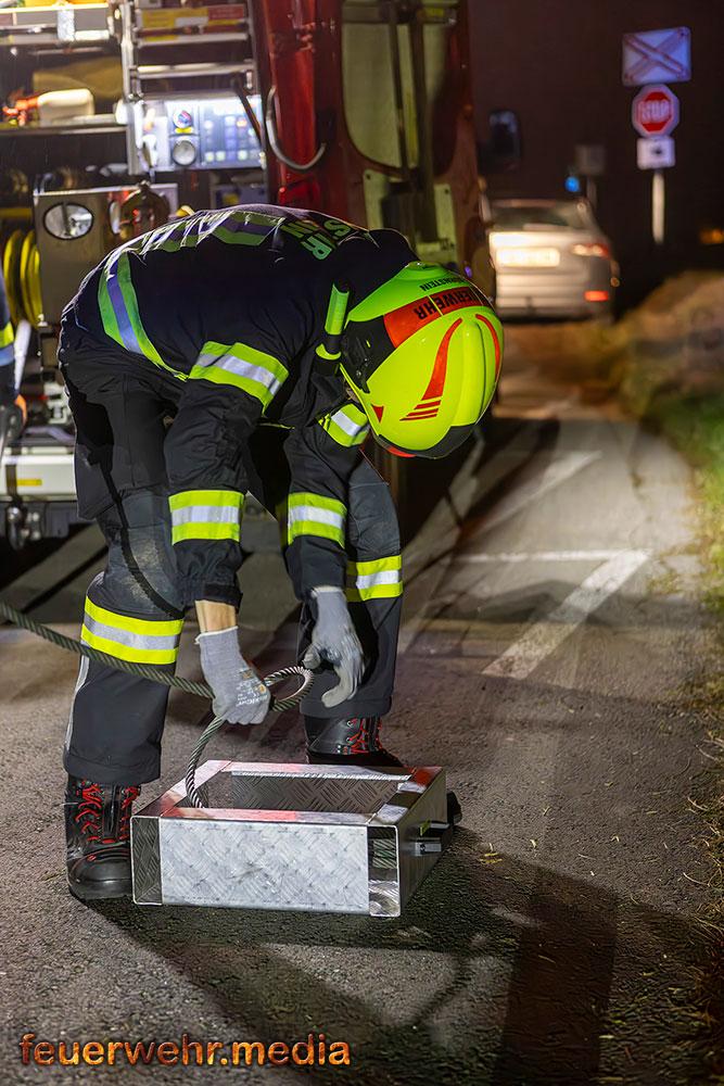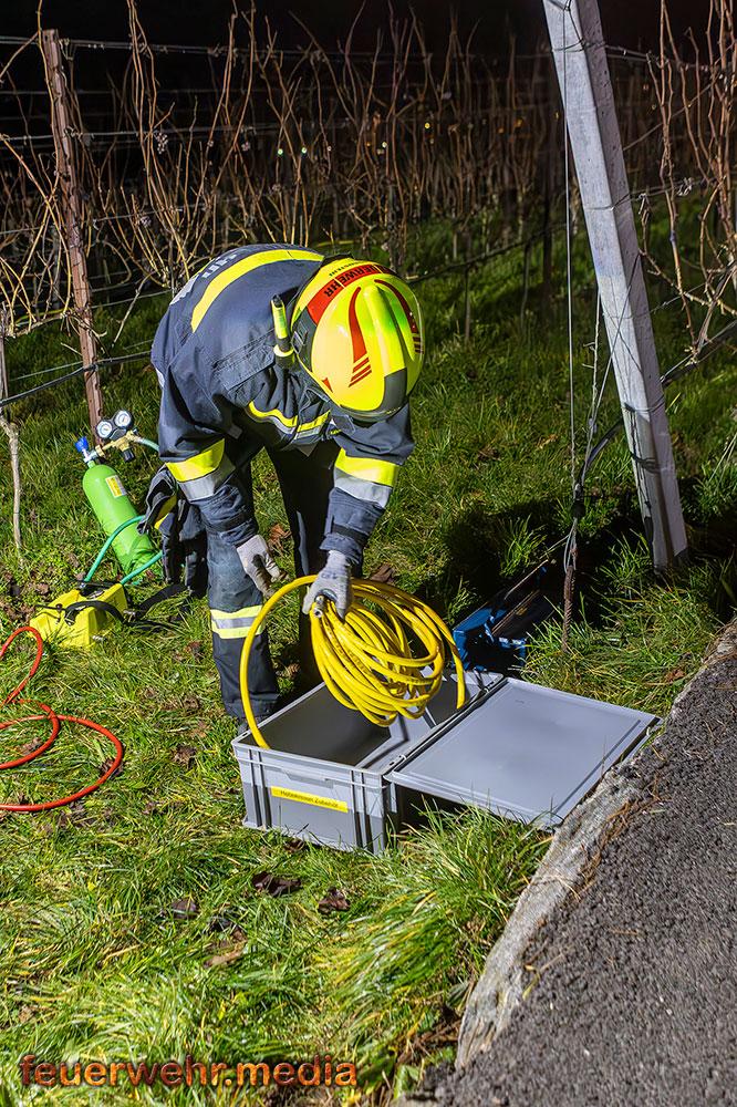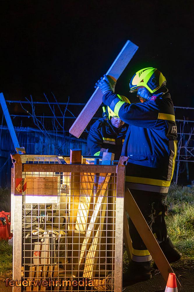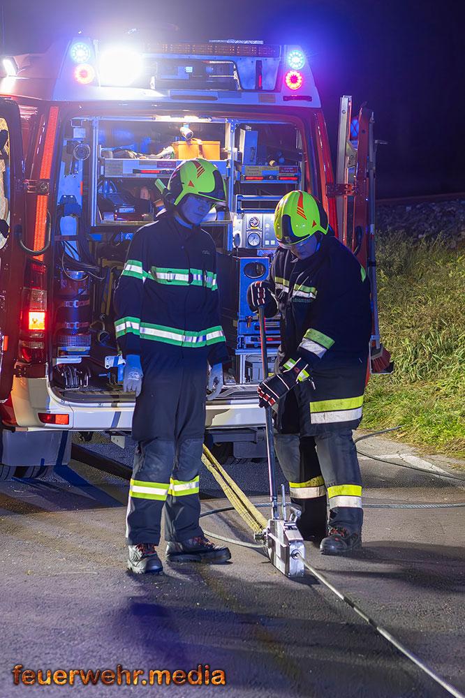Zur Durchführung der Bergung wurde mithilfe des Gabelstaplers eine Gitterbox mit Unterlegeholz zur Einsatzstelle gebracht. Das Fahrzeug wurde anschließend unterbaut sowie mit einem Hebekissen und einem Wagenheber angehoben um auch die Räder mit Holz unterbauen zu können. Danach konnte der Pkw mittels Greifzug wieder auf die Straße gezogen werden.
