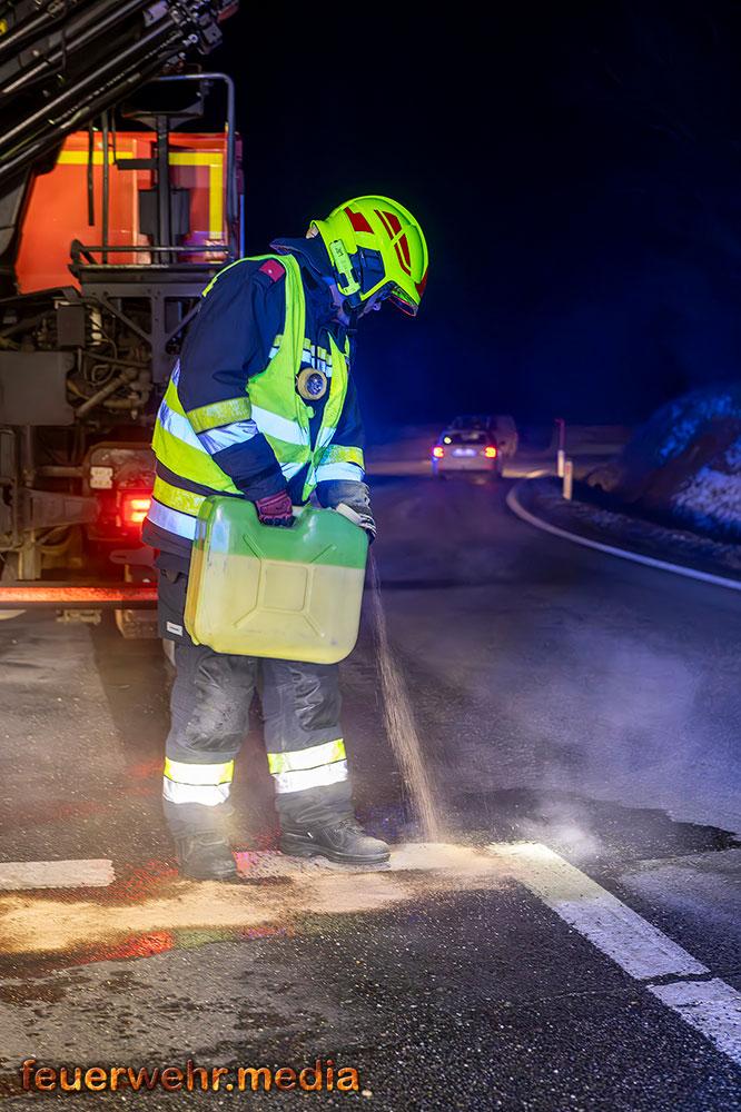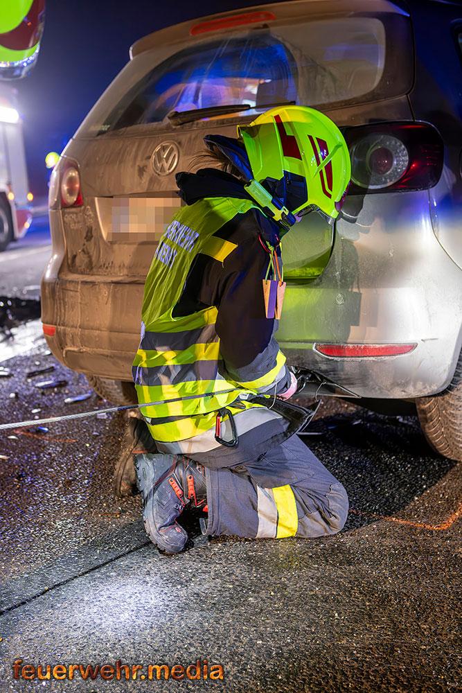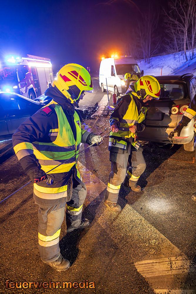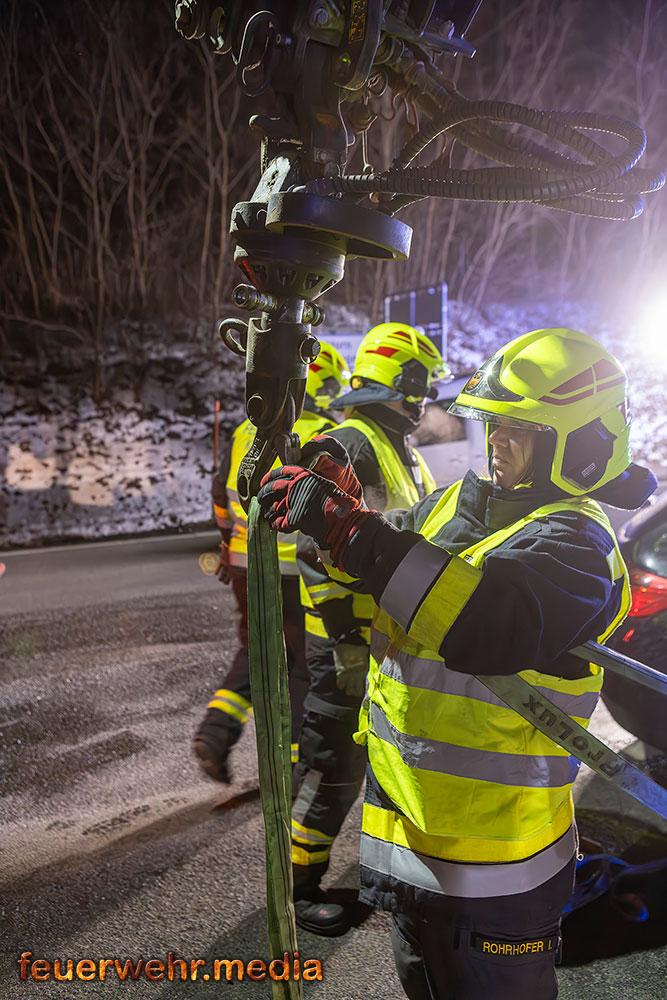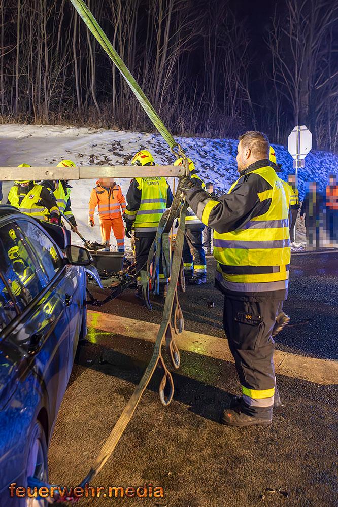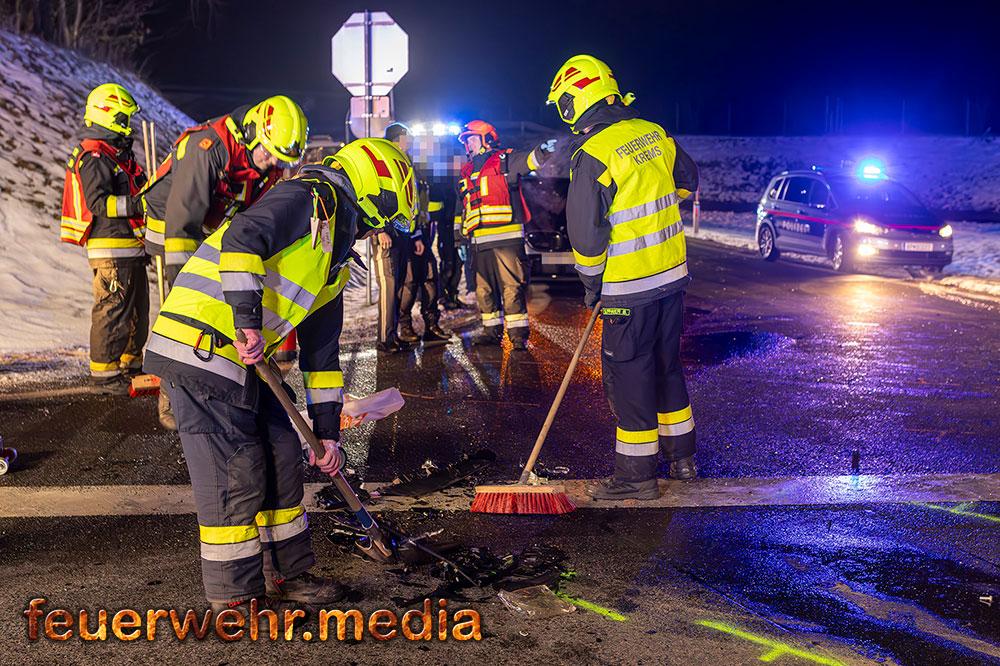 In weiterer Folge sicherten die Einsatzkräfte die Unfallstelle großräumig ab und stellten den Brandschutz sicher. Mittels Last 4 Krems, ein Wechselladefahrzeug mit Kran, wurde eines der Unfallfahrzeuge verladen und gesichert abgestellt. Der Abtransport des zweiten Fahrzeugs erfolgte durch ein privates Abschleppunternehmen.