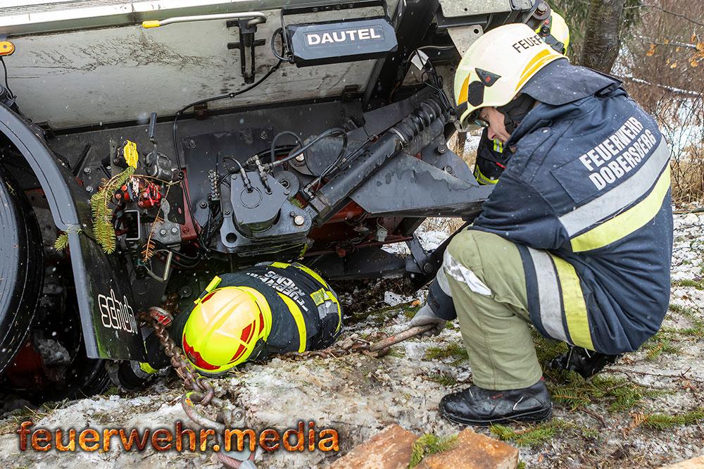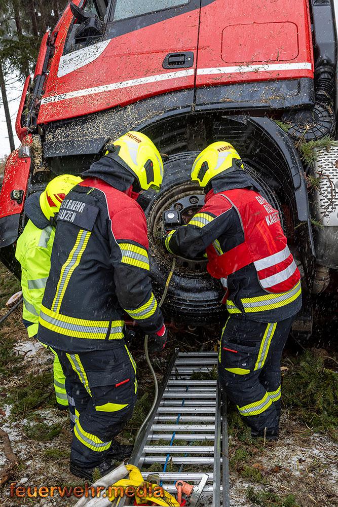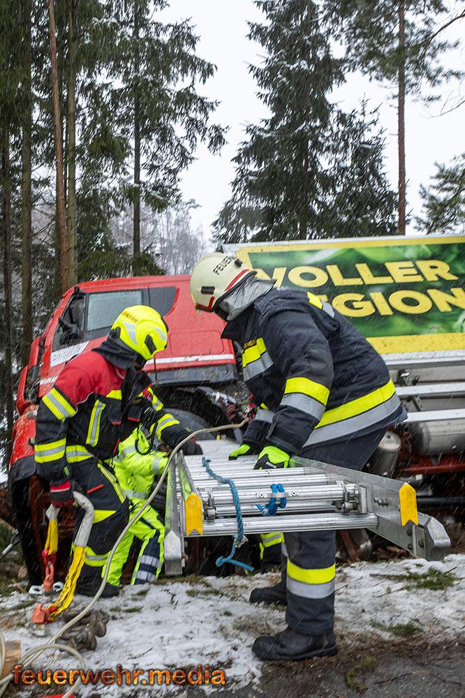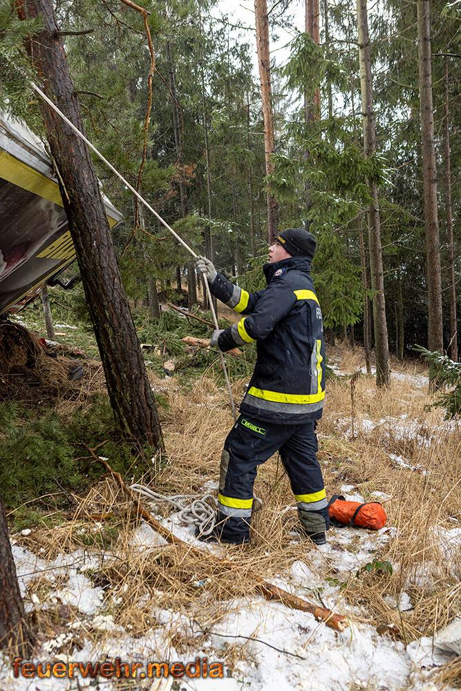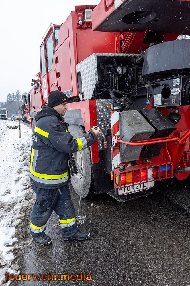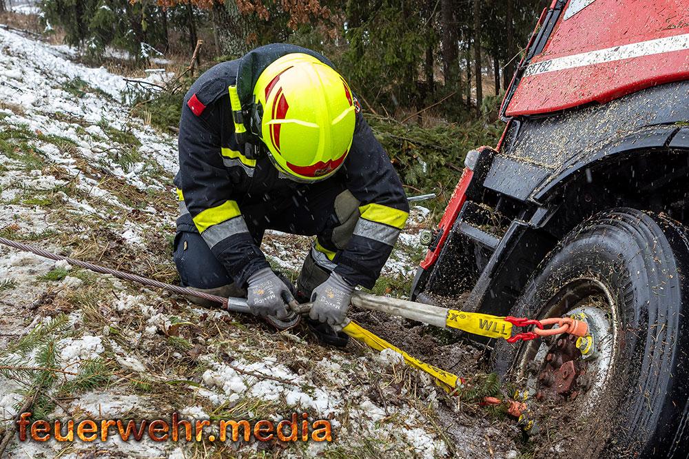 Nachdem die Menschenrettung abgeschlossen war, galt die volle Aufmerksamkeit der Bergung des Fahrzeugs. Aufgrund der exponierten Lage und der Gefahr eines weiteren Abrutschens forderte die Einsatzleitung vor Ort das Kranfahrzeug der Feuerwehr Krems an. Bis zum Eintreffen des Kranfahrzeuges wurde der Lkw mit einer Seilwinde gegen einen weiteren Absturz gesichert.