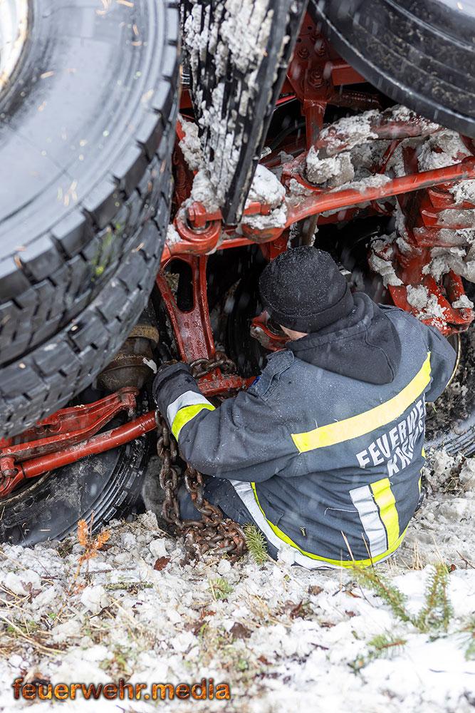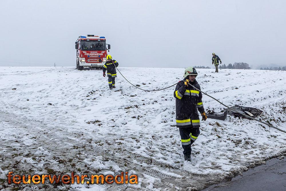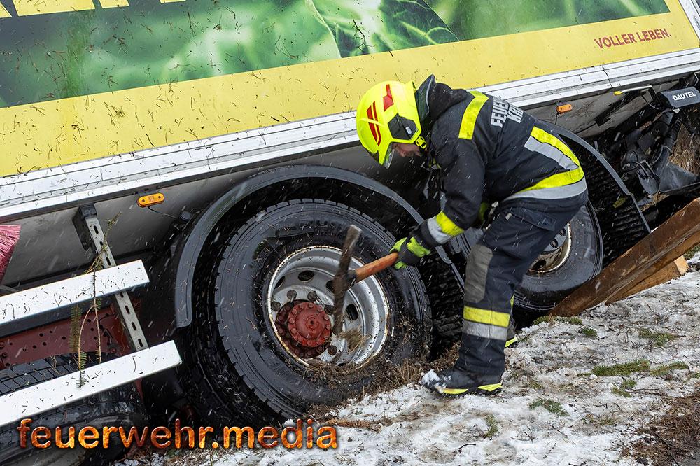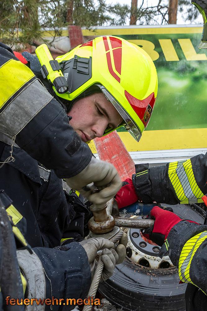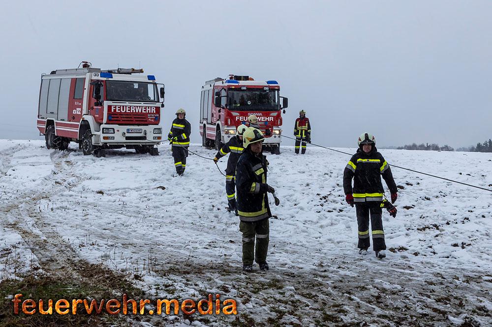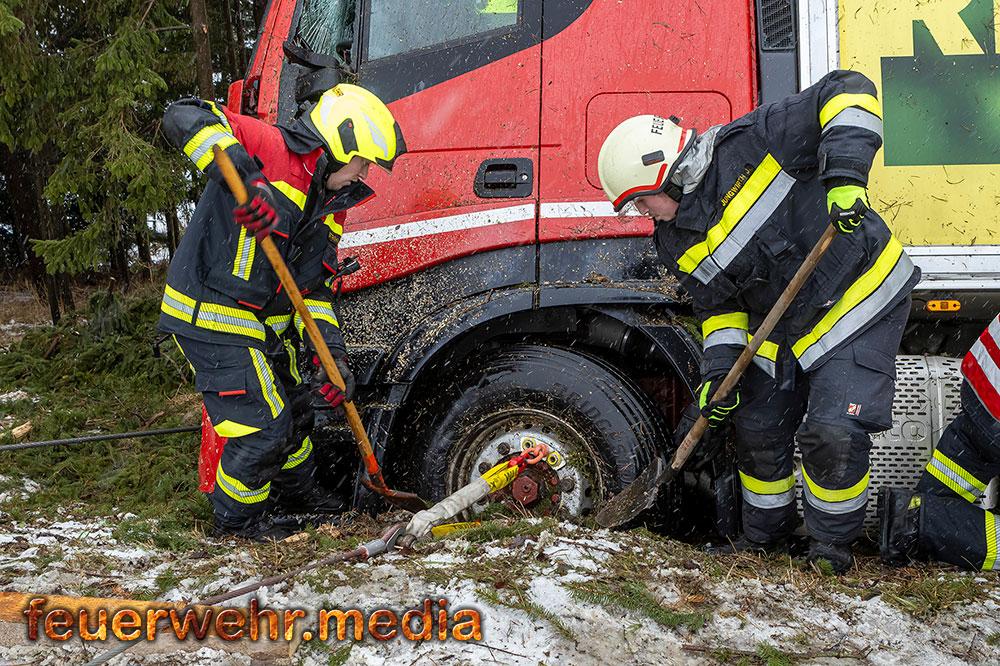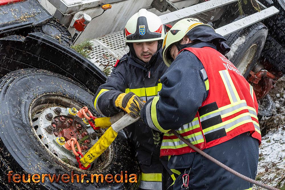 Nachdem die Menschenrettung abgeschlossen war, galt die volle Aufmerksamkeit der Bergung des Fahrzeugs. Aufgrund der exponierten Lage und der Gefahr eines weiteren Abrutschens forderte die Einsatzleitung vor Ort das Kranfahrzeug der Feuerwehr Krems an. Bis zum Eintreffen des Kranfahrzeuges wurde der Lkw mit einer Seilwinde gegen einen weiteren Absturz gesichert.