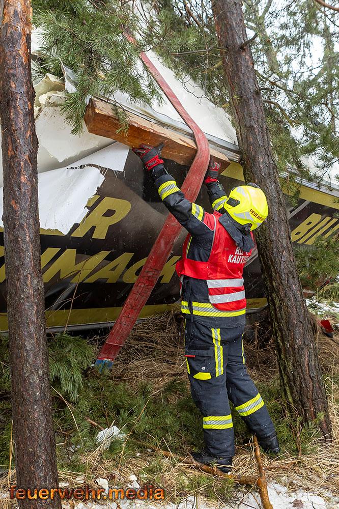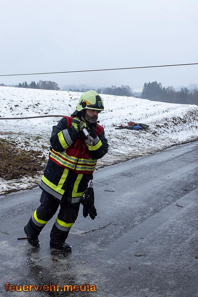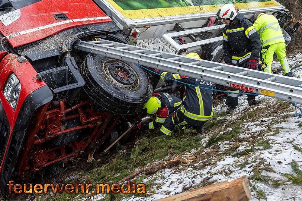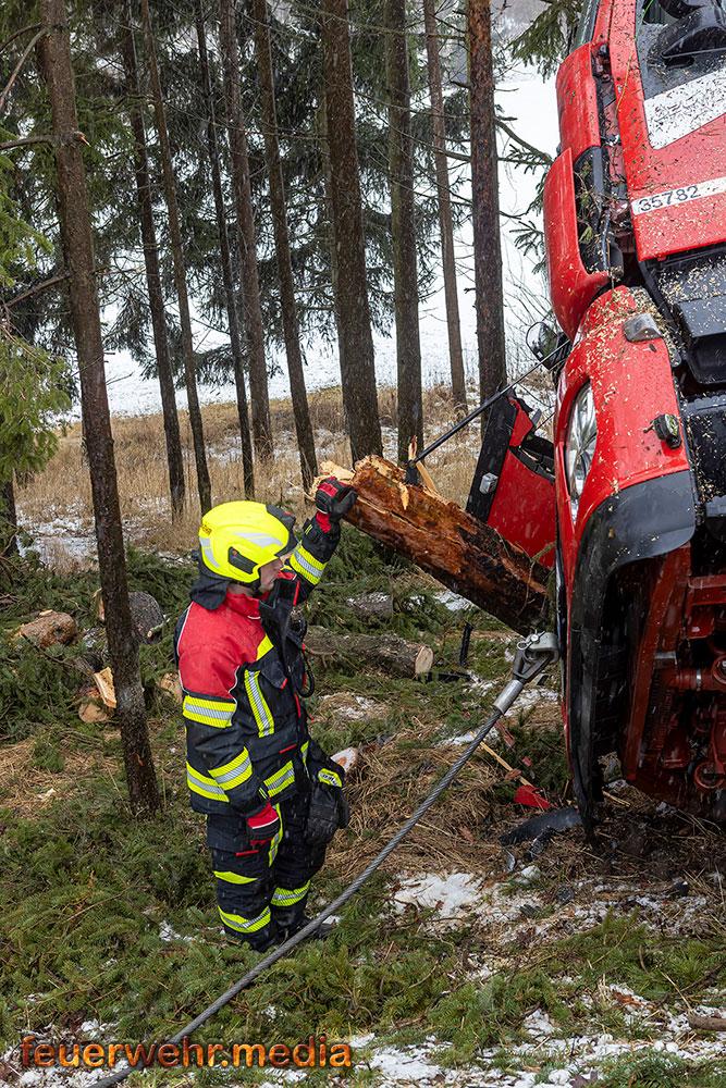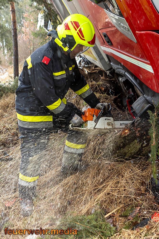 Die erste Phase des Einsatzes konzentrierte sich vollständig auf die Rettung des Fahrers. Die Fahrerkabine war durch die umgerissenen Bäume massiv blockiert, was den Zugang zum Verunfallten erschwerte. Die Einsatzkräfte mussten die Stämme zunächst mittels Kettensägen zerkleinern und die Teile händisch beiseite schaffen, um den Weg zum Fahrerhaus freizumachen.