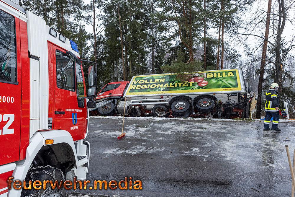 Zuvor waren bereits die Freiwilligen Feuerwehren Gastern, Kautzen und Dobersberg zu einem schweren Verkehrsunfall mit eingeklemmter Person auf die L63 gerufen worden. Ein Lastwagen war in einer abschüssigen Linkskurve von der Fahrbahn abgekommen, hatte zwei Bäume gefällt und war in gefährlicher Schräglage zum Stillstand gekommen. Nur das Glück und einige noch stehende Bäume verhinderten den vollständigen Absturz des Schwerfahrzeugs.