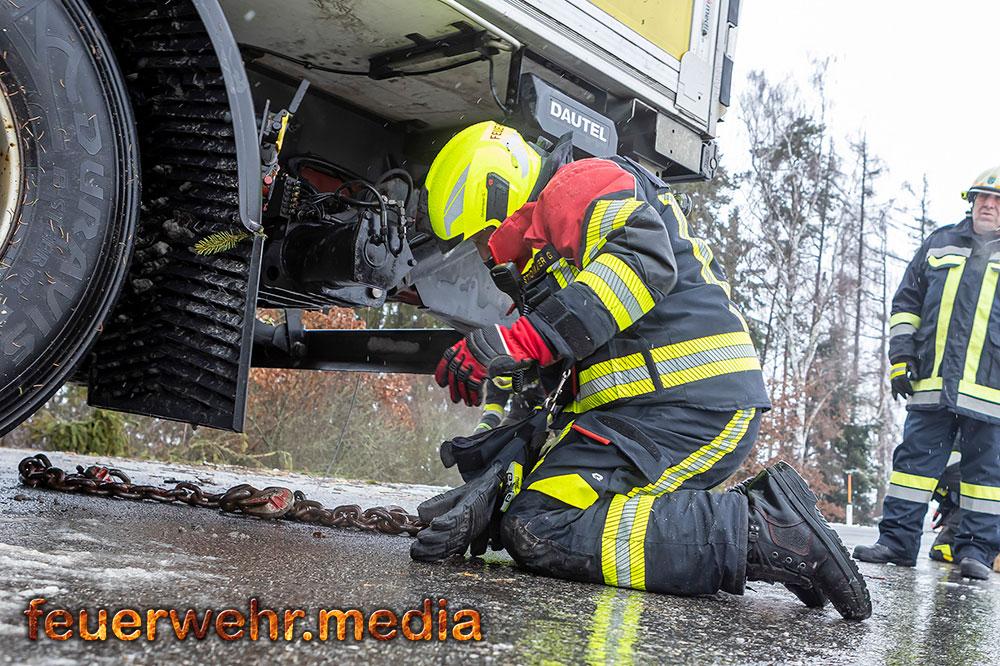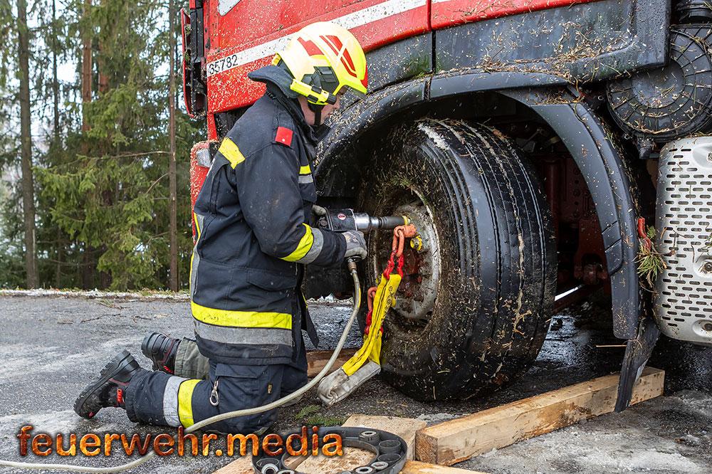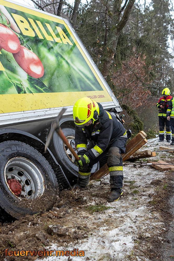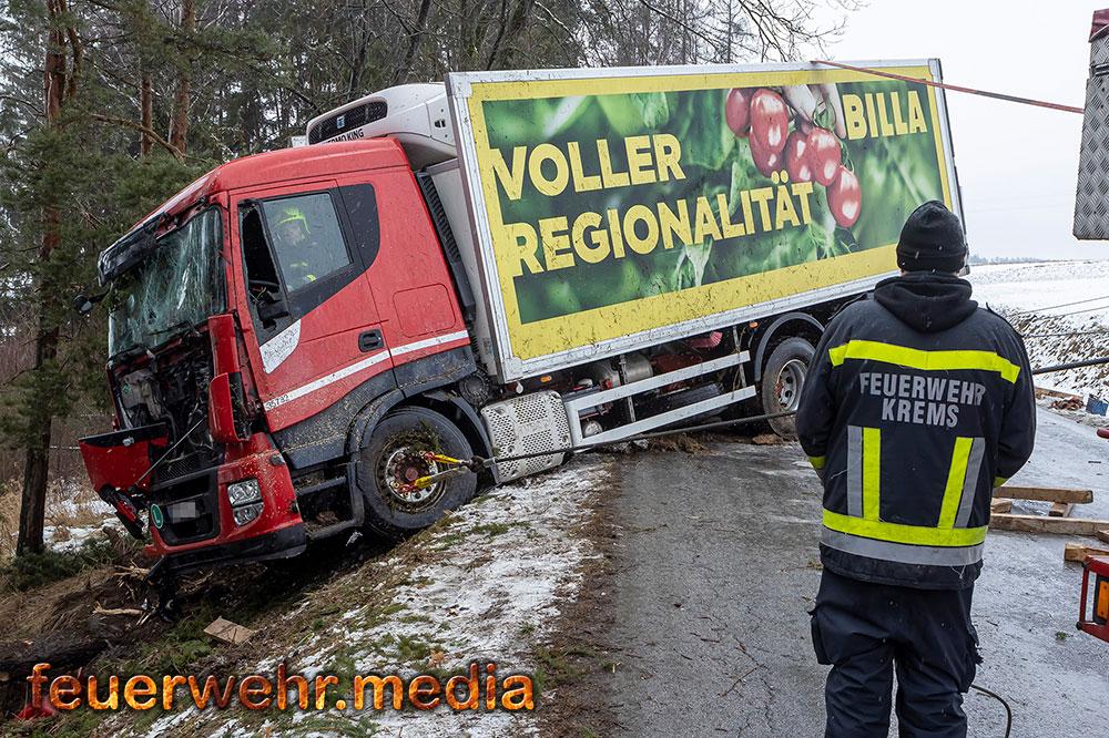 Nachdem die Menschenrettung abgeschlossen war, galt die volle Aufmerksamkeit der Bergung des Fahrzeugs. Aufgrund der exponierten Lage und der Gefahr eines weiteren Abrutschens forderte die Einsatzleitung vor Ort das Kranfahrzeug der Feuerwehr Krems an. Bis zum Eintreffen des Kranfahrzeuges wurde der Lkw mit einer Seilwinde gegen einen weiteren Absturz gesichert.
