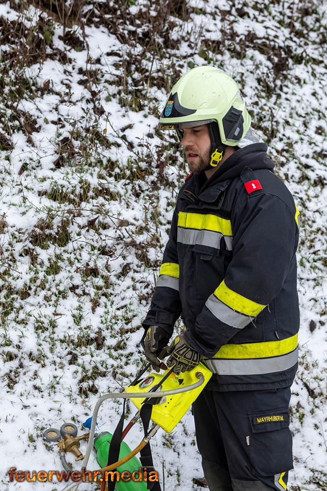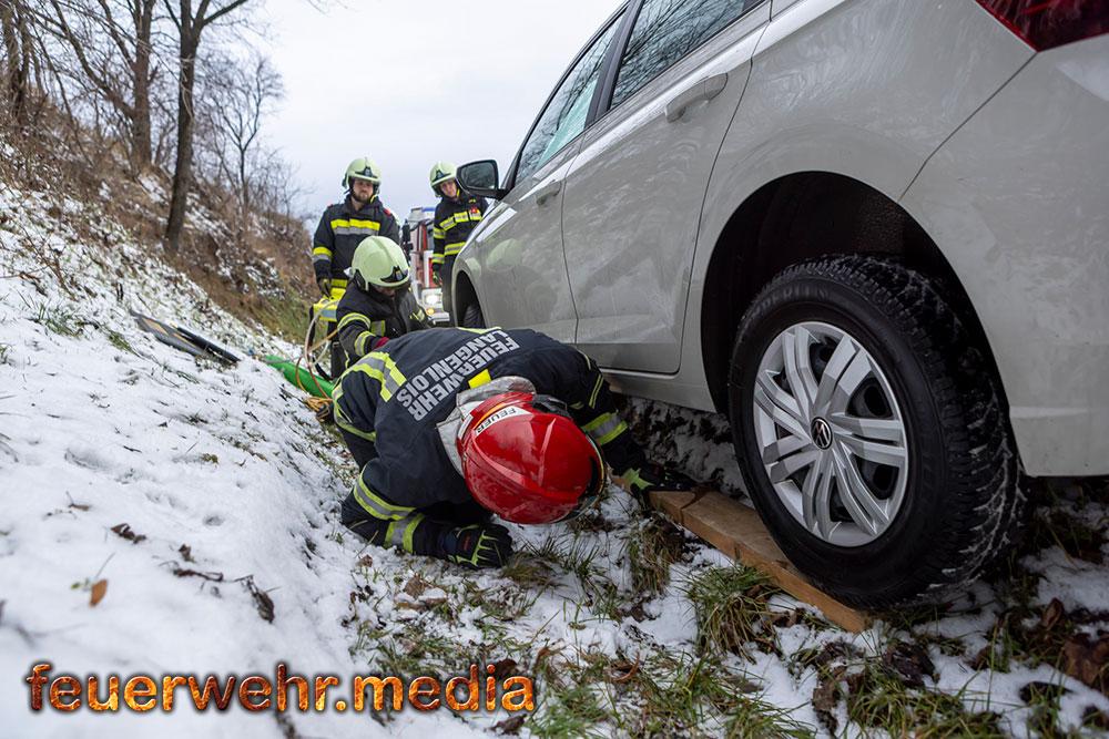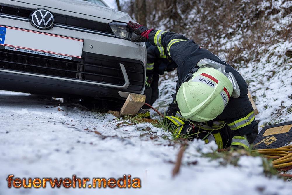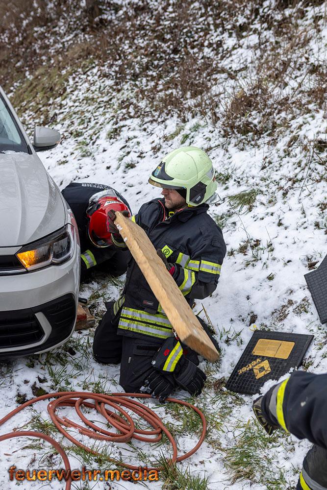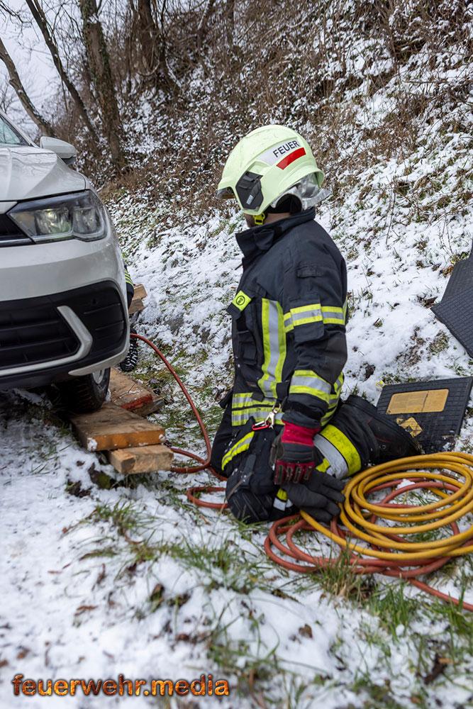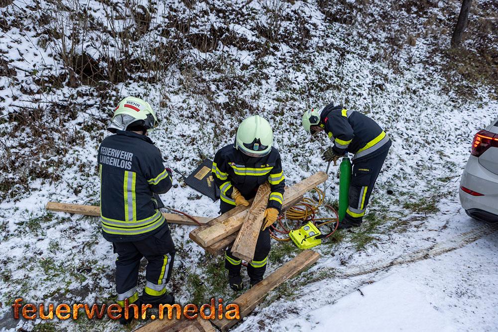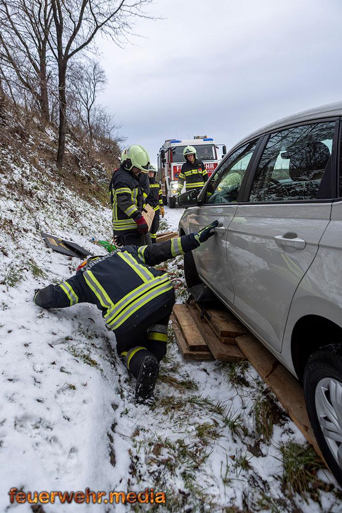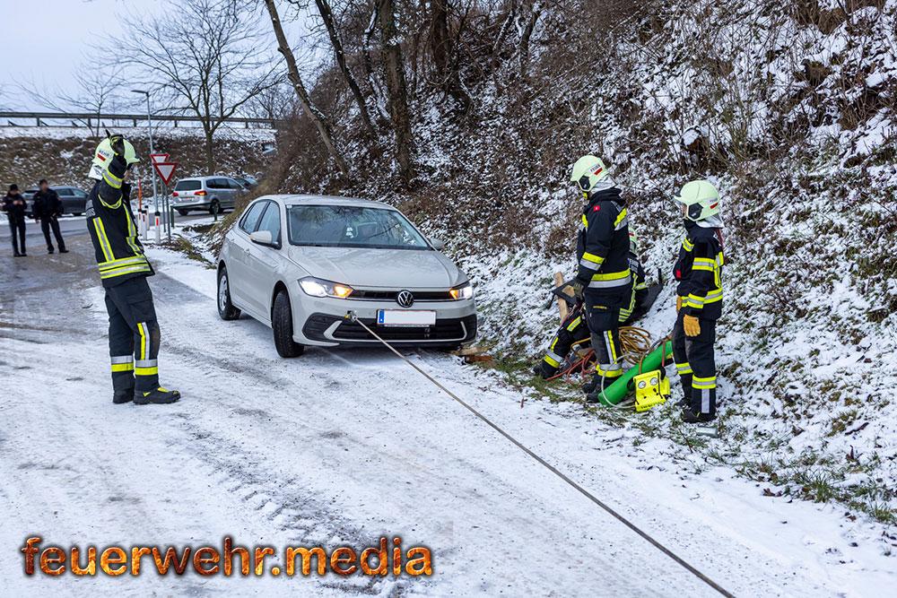 Sobald das Fahrzeug ausreichend angehoben und gesichert war, kam die Seilwinde des Rüstlöschfahrzeuges zum Einsatz. Mit Fingerspitzengefühl wurde der Pkw zurück auf die befestigte Fahrbahn gezogen.