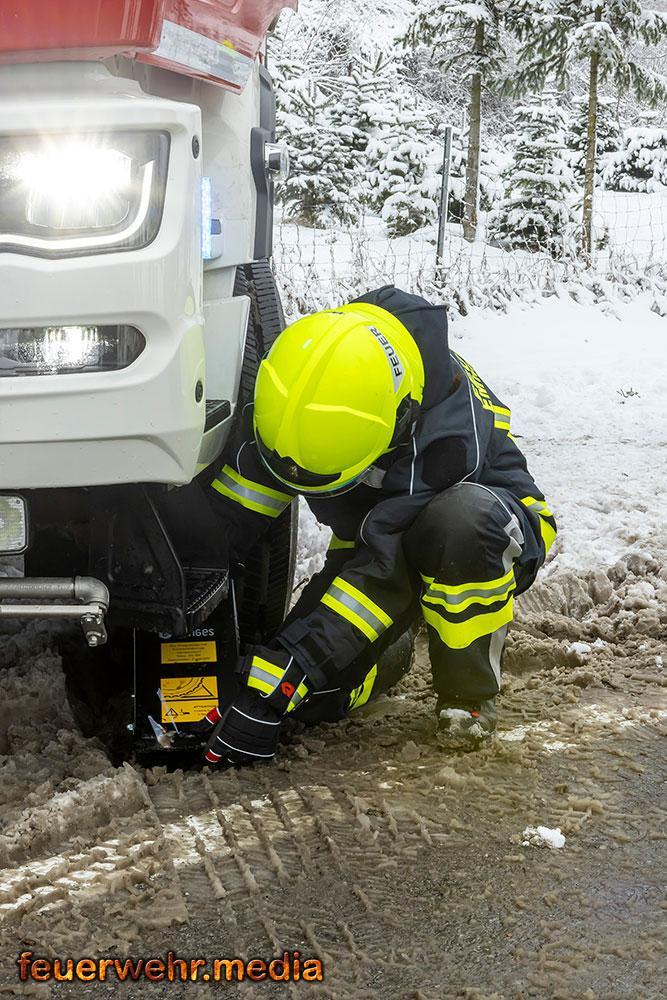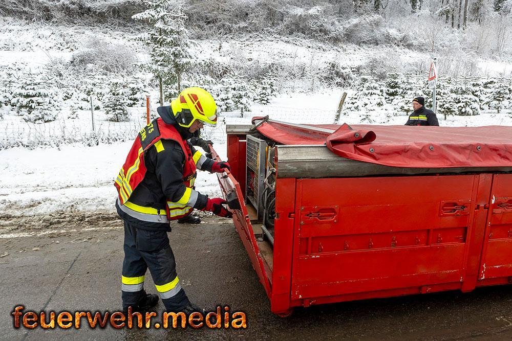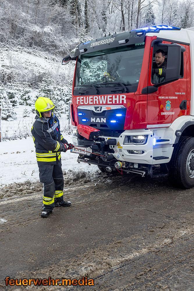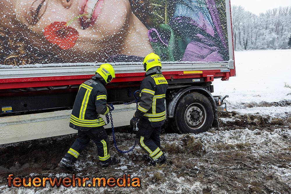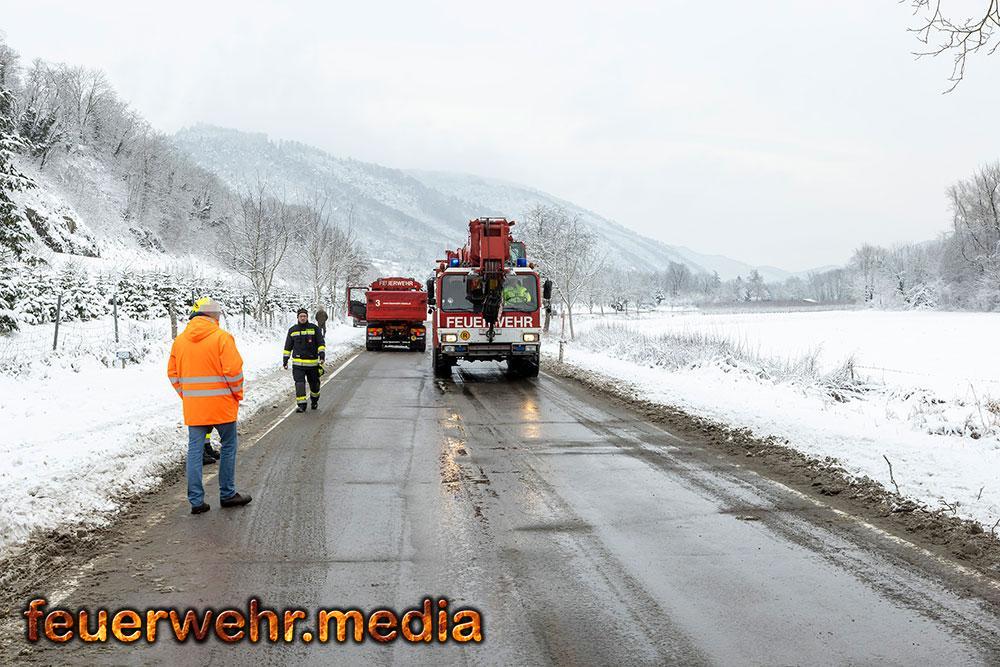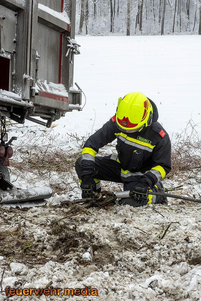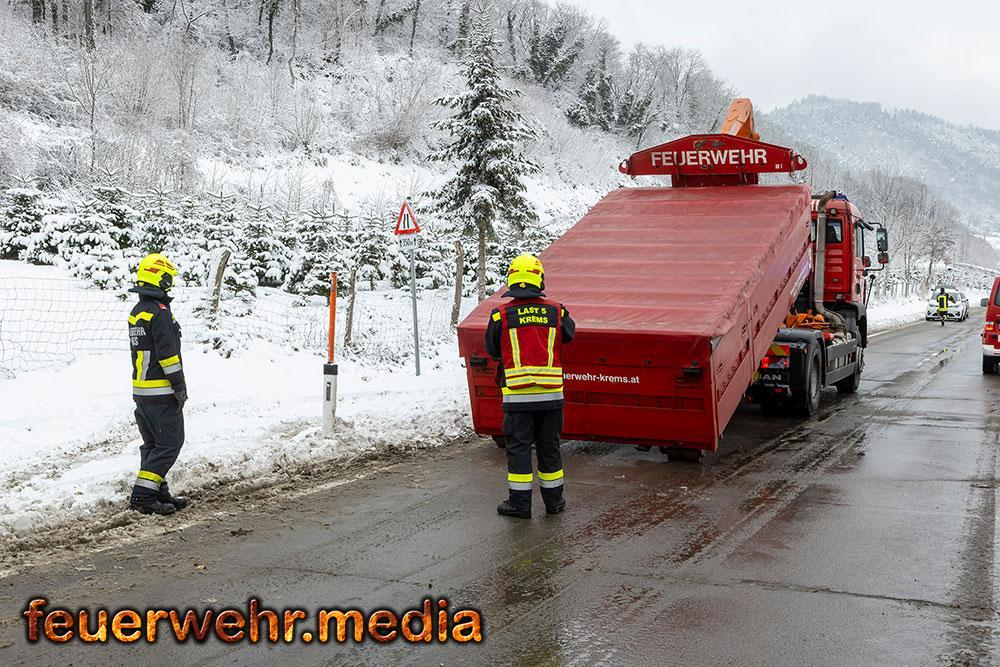 Der Schneefall der Nacht wurde zum größten Hindernis. Das Bankett war völlig aufgeweicht, die Straße durch Schneematsch extrem rutschig. Da ein Umladen der 24 Tonnen Ware vermieden werden wollte bzw. ein Trennen des Gespanns unmöglich war, forderte der Einsatzleiter ein Räumfahrzeug der Straßenmeisterei Spitz an. Erst nachdem die Fahrbahn geräumt und gesalzen war, konnten die Bergefahrzeuge den nötigen Grip aufbauen.