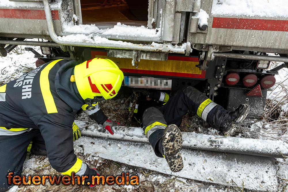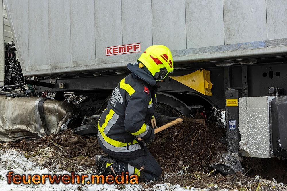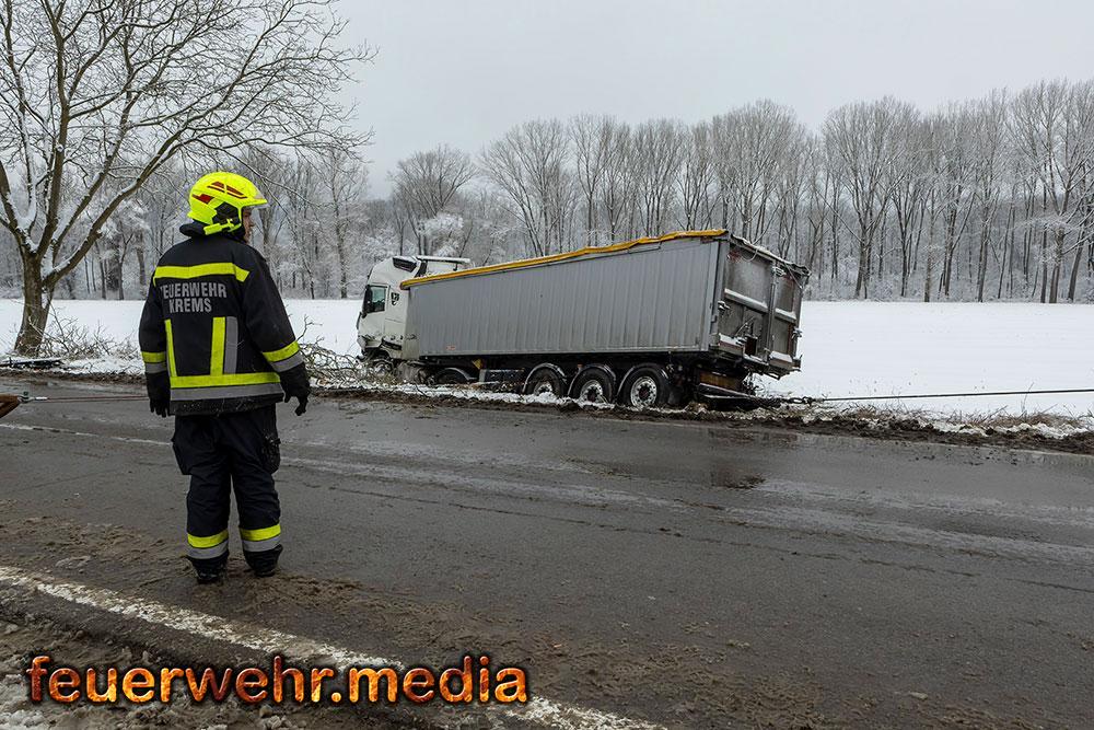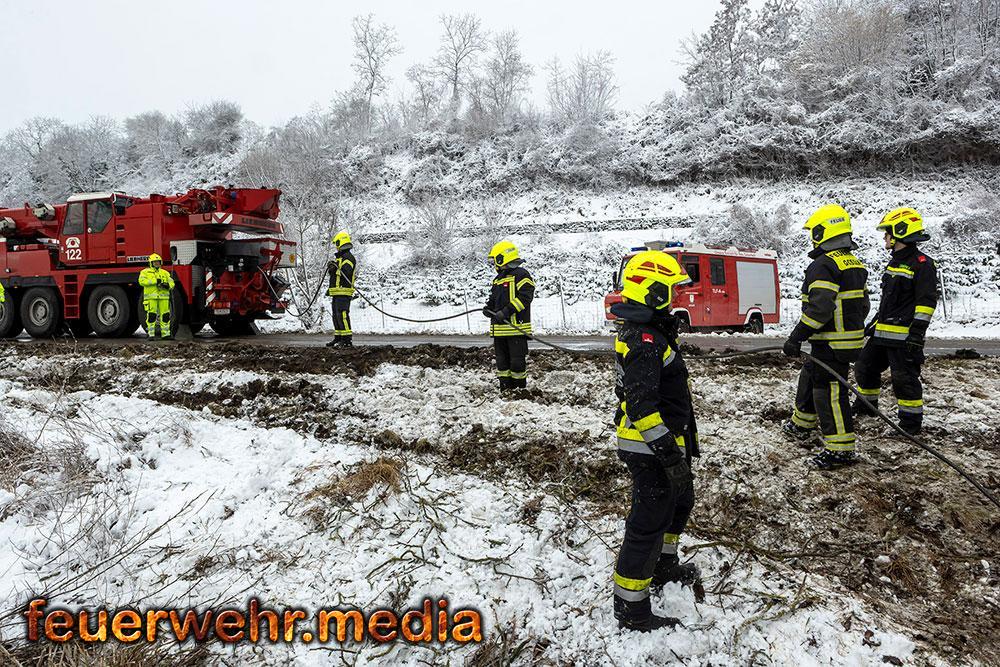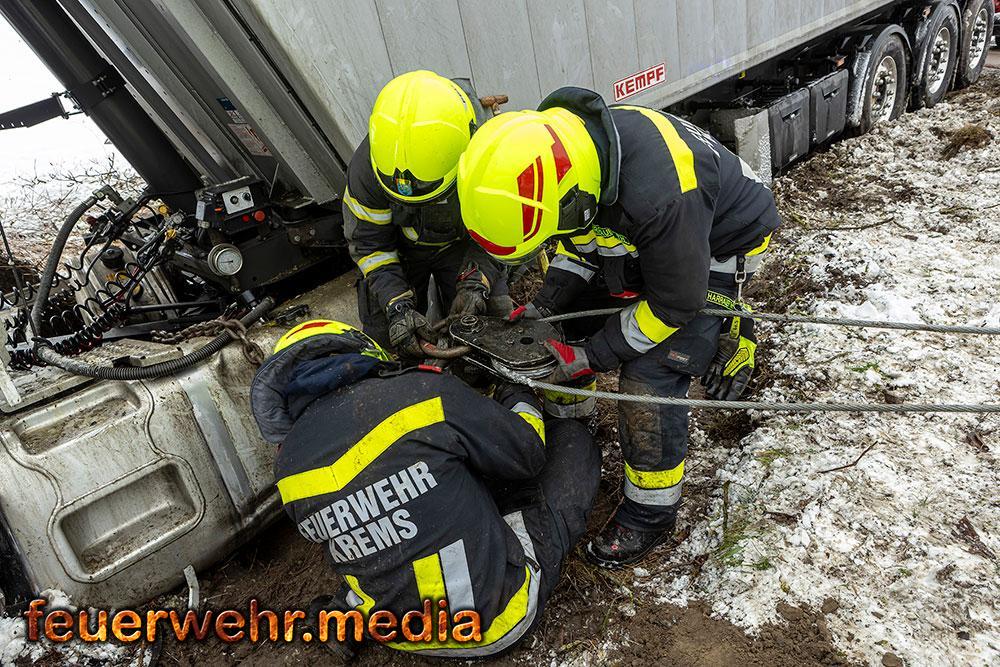 Während der Anhänger des Ersthelfers durch die Kräfte aus Emmersdorf und Gossam zügig und unbeschädigt aus dem Graben befreit werden konnte, gestaltete sich die Lage beim verunfallten Sattelzug deutlich schwieriger. Dieser war mit 24 Tonnen Ladung beladen und drohte in der Schräglage weiter abzurutschen. Da die Mittel vor Ort nicht ausreichten, wurde die Hauptwache der Feuerwehr Krems mit dem dort stationierten 50-Tonnen-Kranfahrzeug sowie dem Begleitfahrzeug nachalarmiert.