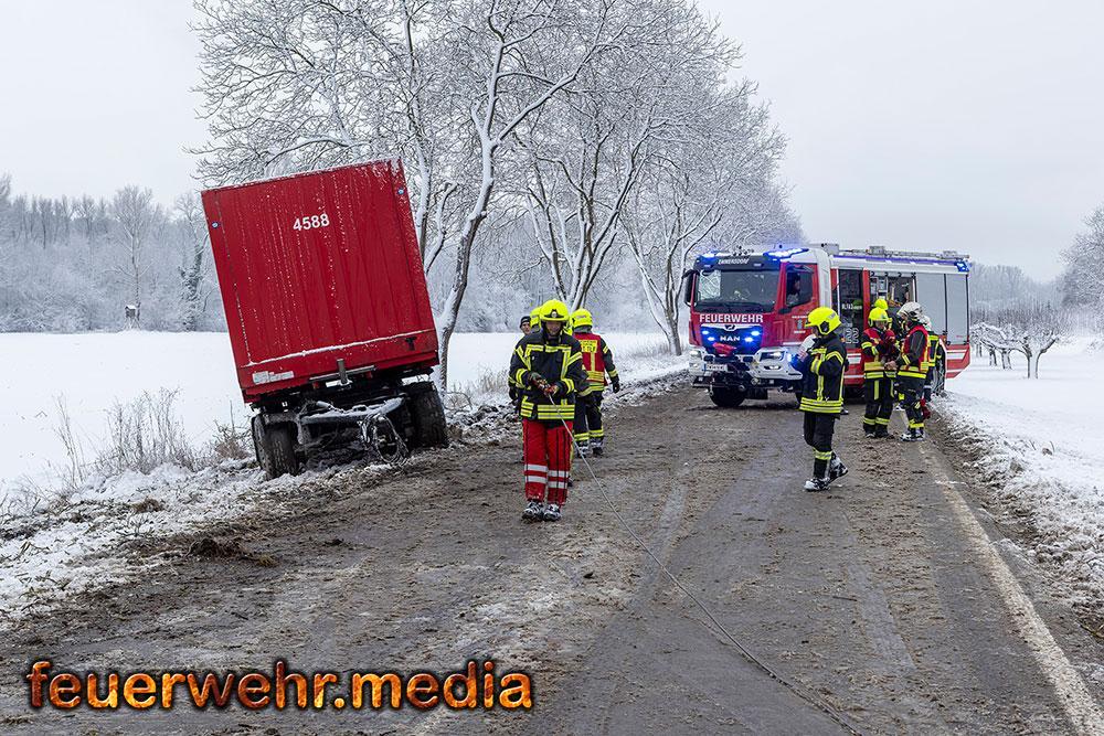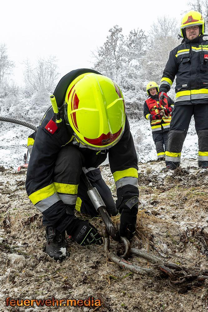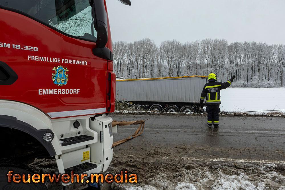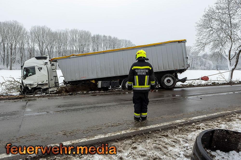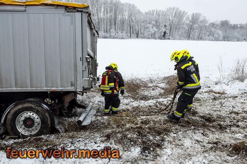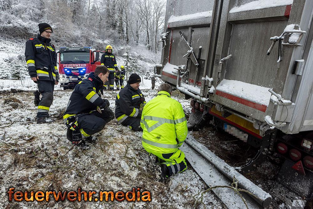 Während der Anhänger des Ersthelfers durch die Kräfte aus Emmersdorf und Gossam zügig und unbeschädigt aus dem Graben befreit werden konnte, gestaltete sich die Lage beim verunfallten Sattelzug deutlich schwieriger. Dieser war mit 24 Tonnen Ladung beladen und drohte in der Schräglage weiter abzurutschen. Da die Mittel vor Ort nicht ausreichten, wurde die Hauptwache der Feuerwehr Krems mit dem dort stationierten 50-Tonnen-Kranfahrzeug sowie dem Begleitfahrzeug nachalarmiert.