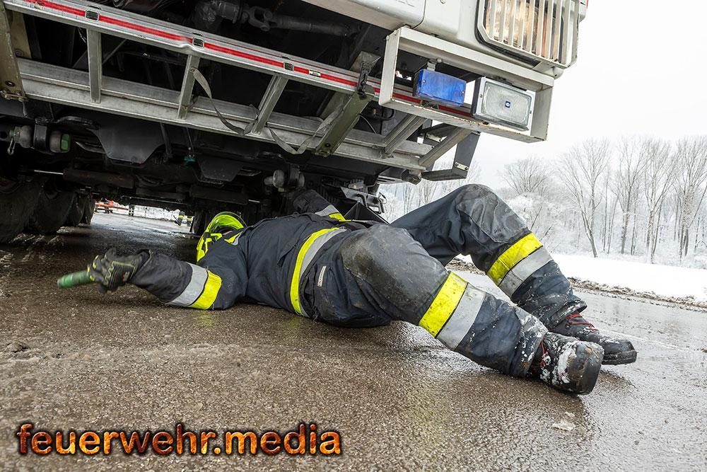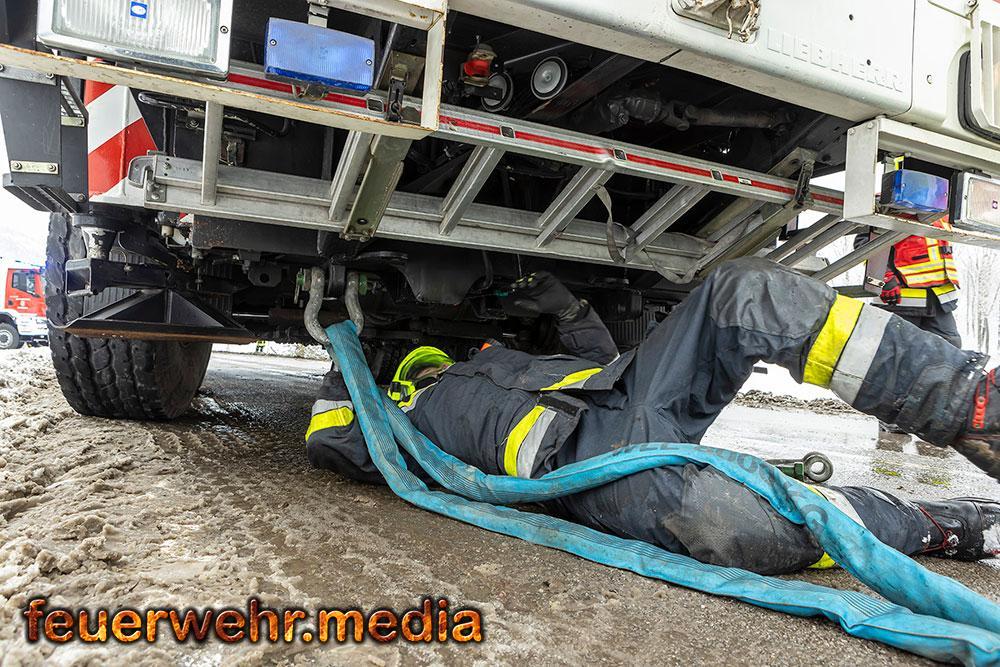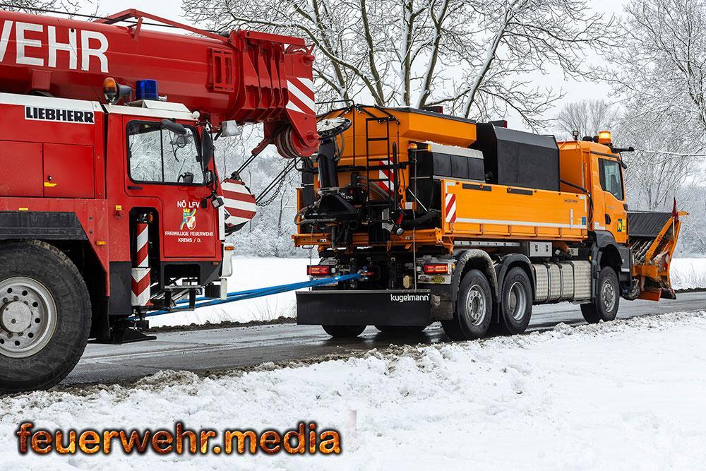 Ein besonderer Moment der Improvisation folgte während der Bergung des verunfallten Sattelkraftfahrzeuges. Da selbst der schwere Kran der FF Krems auf dem matschigen Untergrund wegzurutschen drohte, entschied der Kranführer, das Räumfahrzeug der Straßenmeisterei als zusätzliche Masse vor den Kran zu spannen.