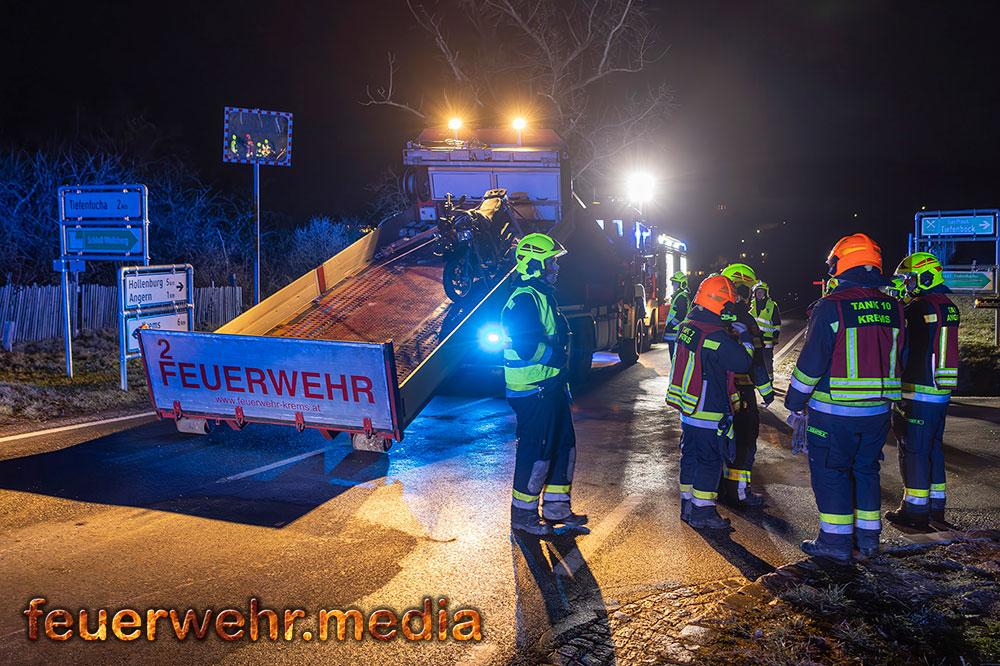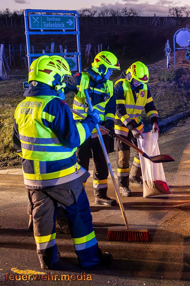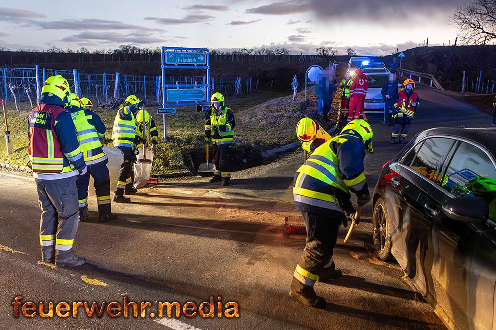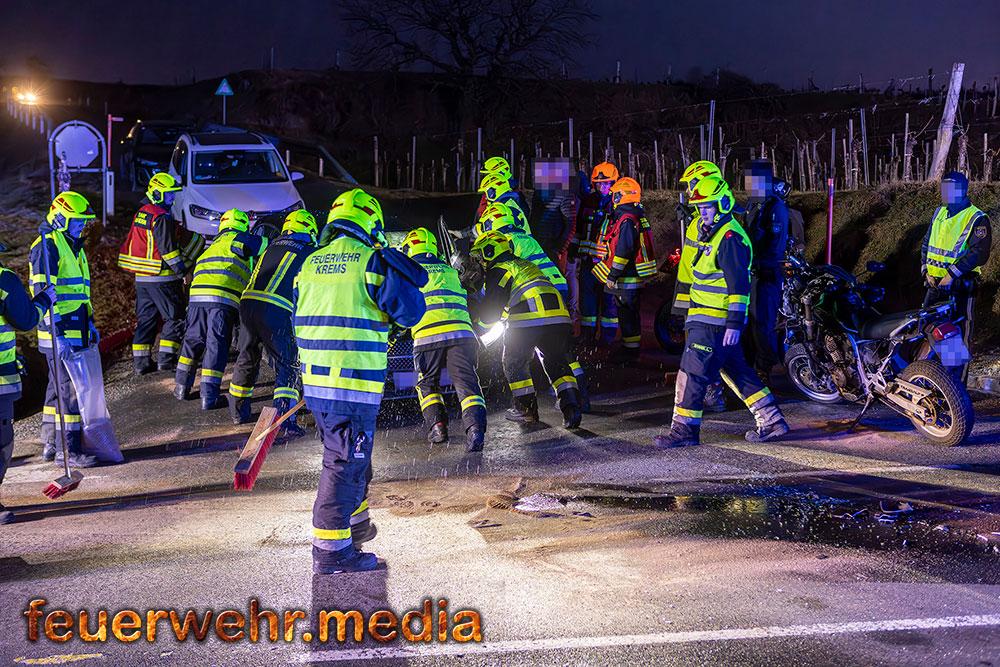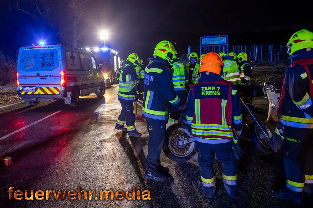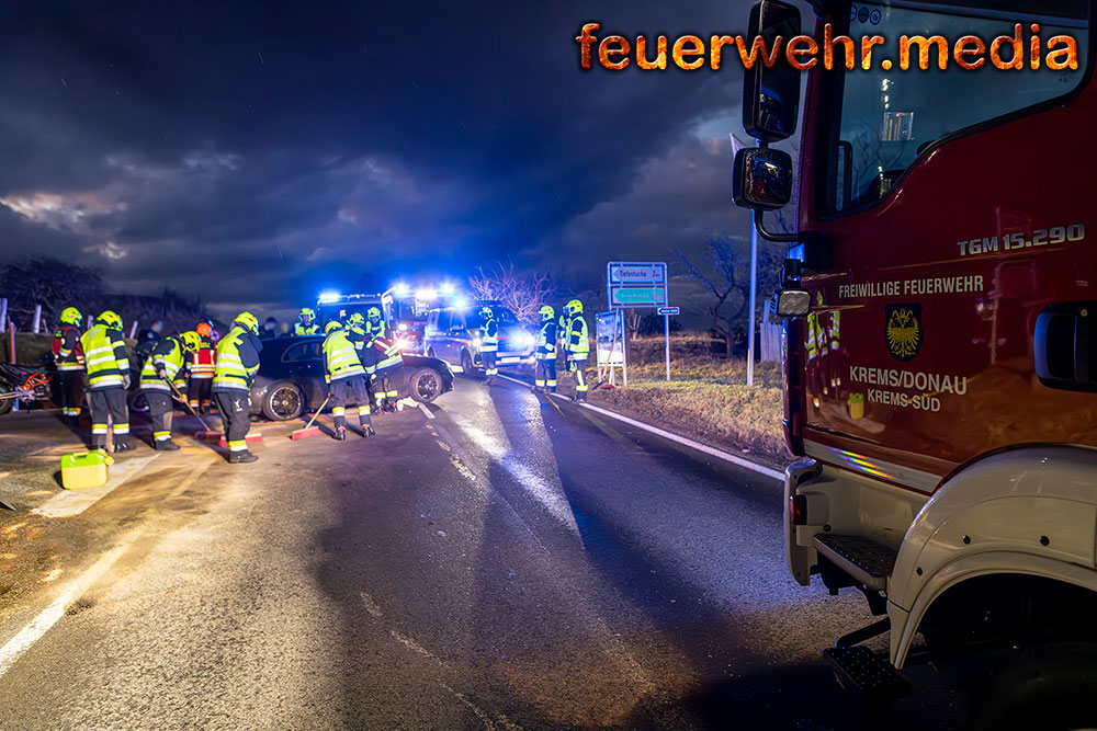 Zu einem Zusammenstoß zwischen einem Pkw und einem Motorrad kam es am frühen Abend des 24. Februar 2026 im Kreuzungsbereich der L114 mit der Tiefenfuchastraße, L7097. Zwei Feuerwachen der Freiwilligen Feuerwehr Krems standen über drei Stunden im Einsatz, um die Unfallstelle zu räumen und ausgetretene Betriebsmittel zu binden.