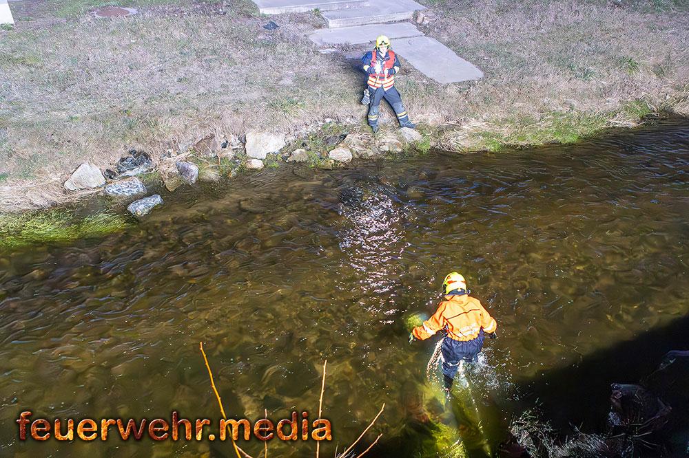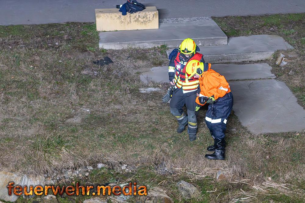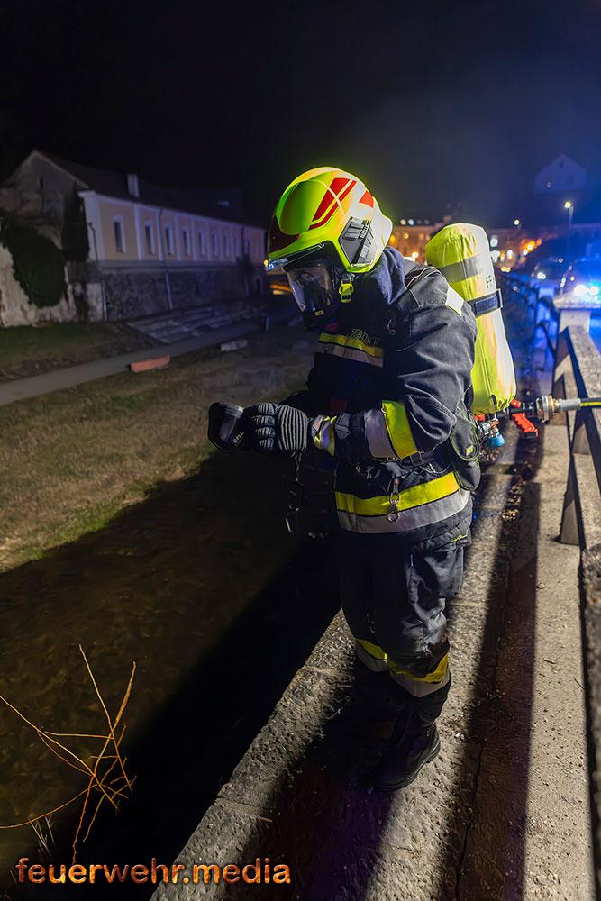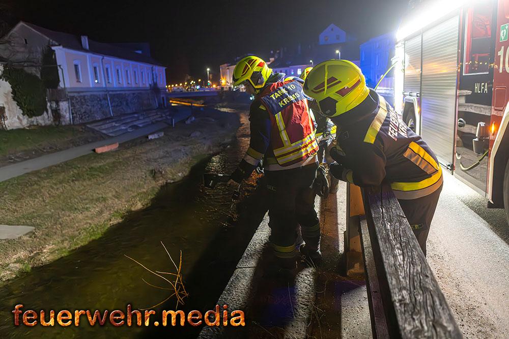 Während der Löschangriff von der Straße lief, begaben sich zwei weitere Einsatzkräfte zu Fuß an das gegenüberliegende Ufer. Um die Brandstelle an der Böschung aus nächster Nähe kontrollieren zu können, rüstete sich eine Einsatzkraft mit einem wasserdichten Anzug aus und watete durch die niederwasserführende Krems.