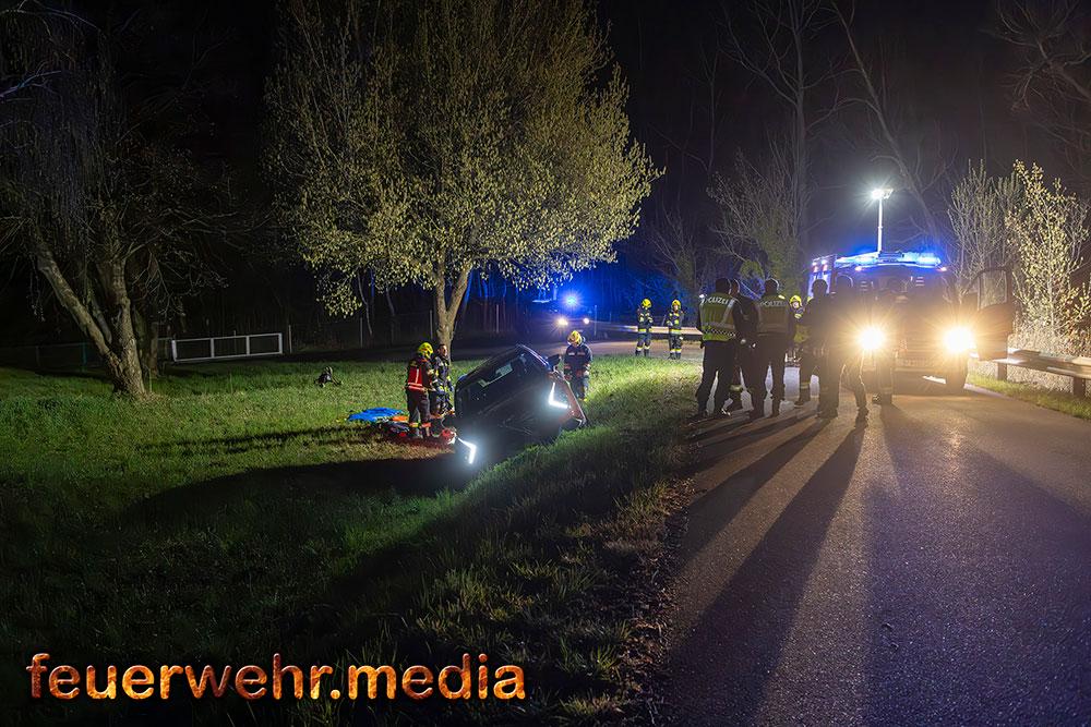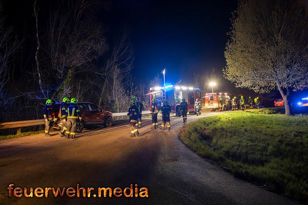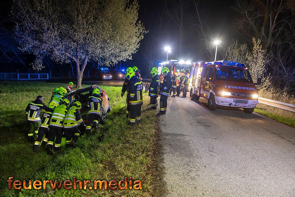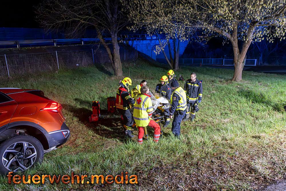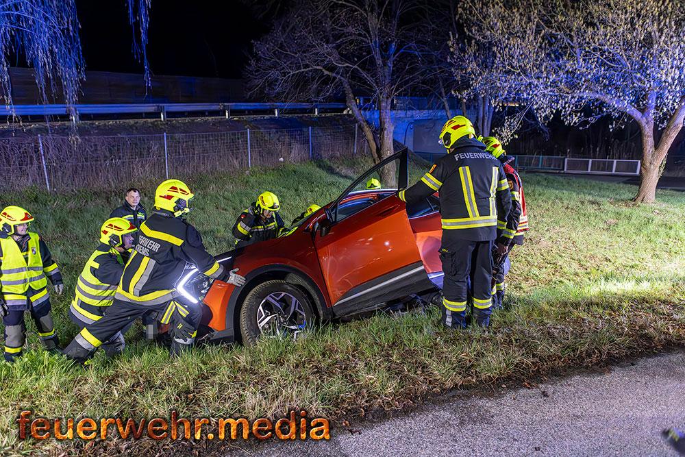Parallel zur Personenrettung sicherten die Feuerwehrkräfte das Fahrzeug gegen ein weiteres Abrutschen. Im Anschluss wurde der Pkw händisch von der Böschung geschoben und in einem gesicherten Bereich der Betriebsabfahrt für die Abholung durch ein Abschleppunternehmen bereitgestellt.