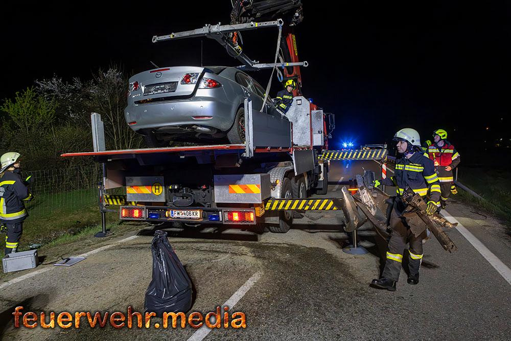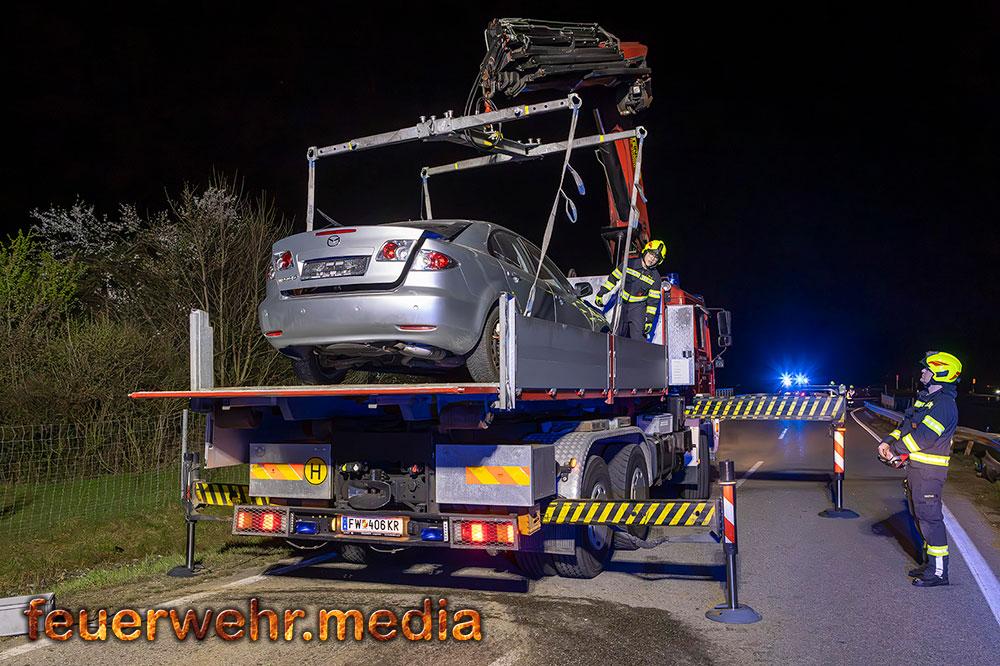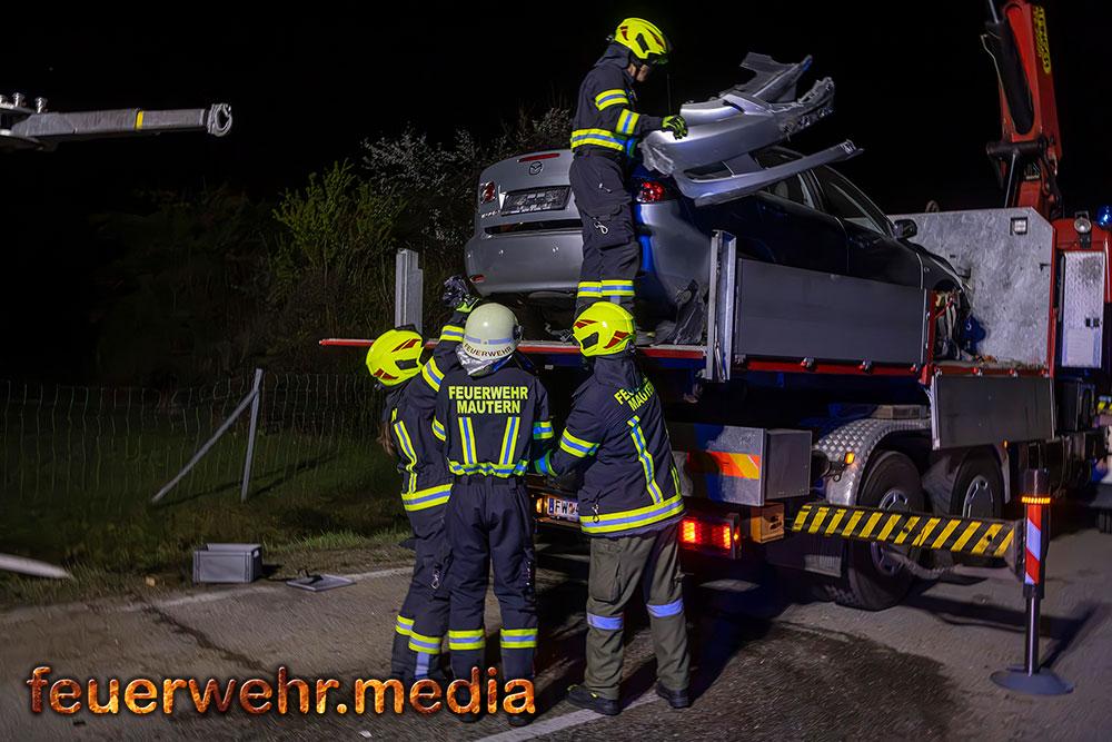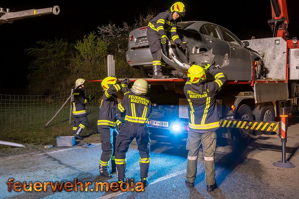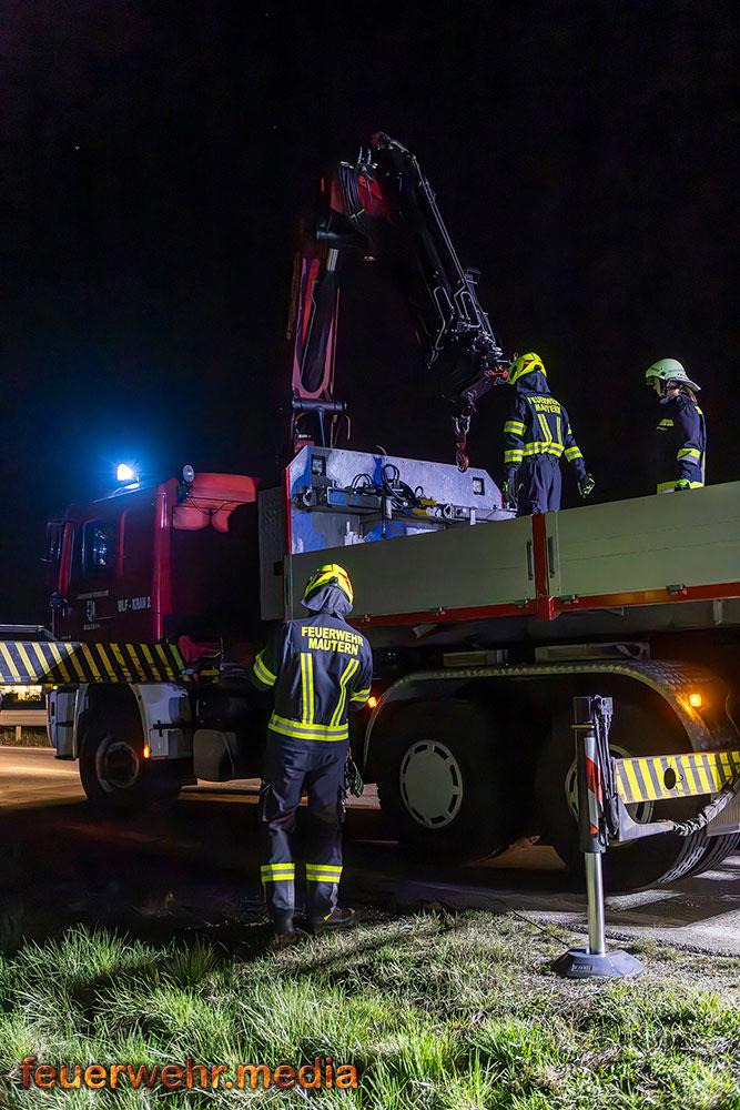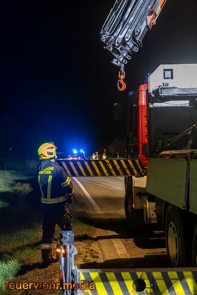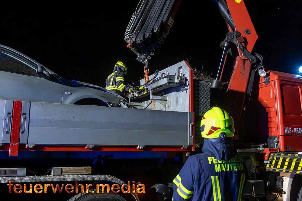 Für die Dauer der Bergungsarbeiten musste die L114 in beiden Fahrtrichtungen komplett gesperrt werden. Nach der polizeilichen Freigabe der Unfallstelle kam das Wechselladefahrzeug der Feuerwehr Mautern zum Einsatz. Mittels Kran und Hebekreuz wurde der schwer beschädigte Pkw behutsam auf das Bergeplateau verladen und anschließend zu einem geeigneten Abstellplatz abtransportiert.