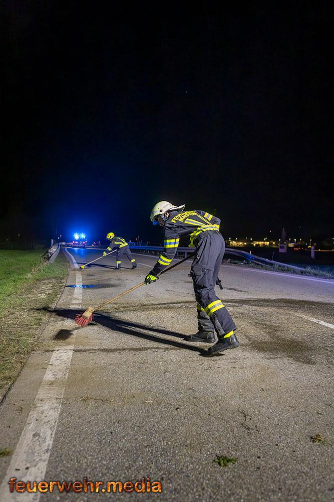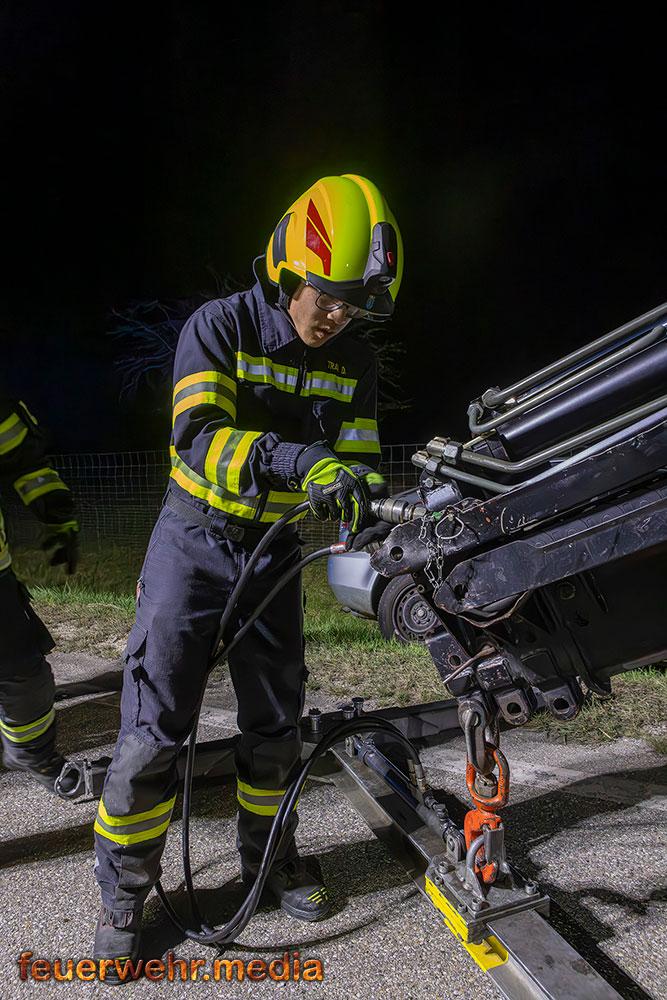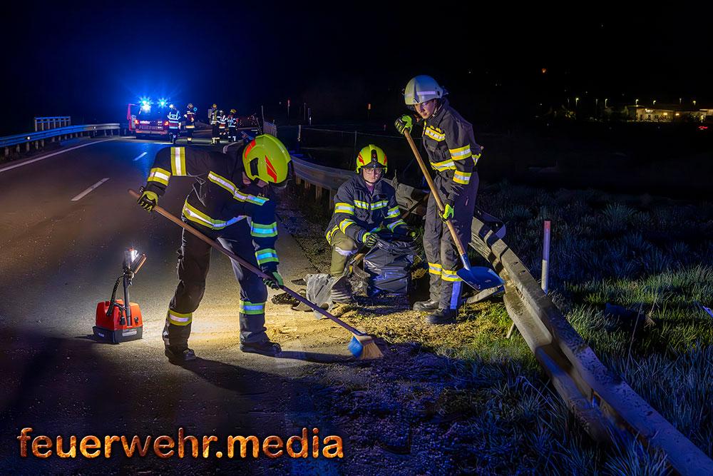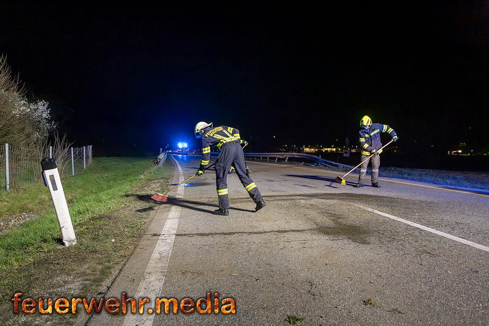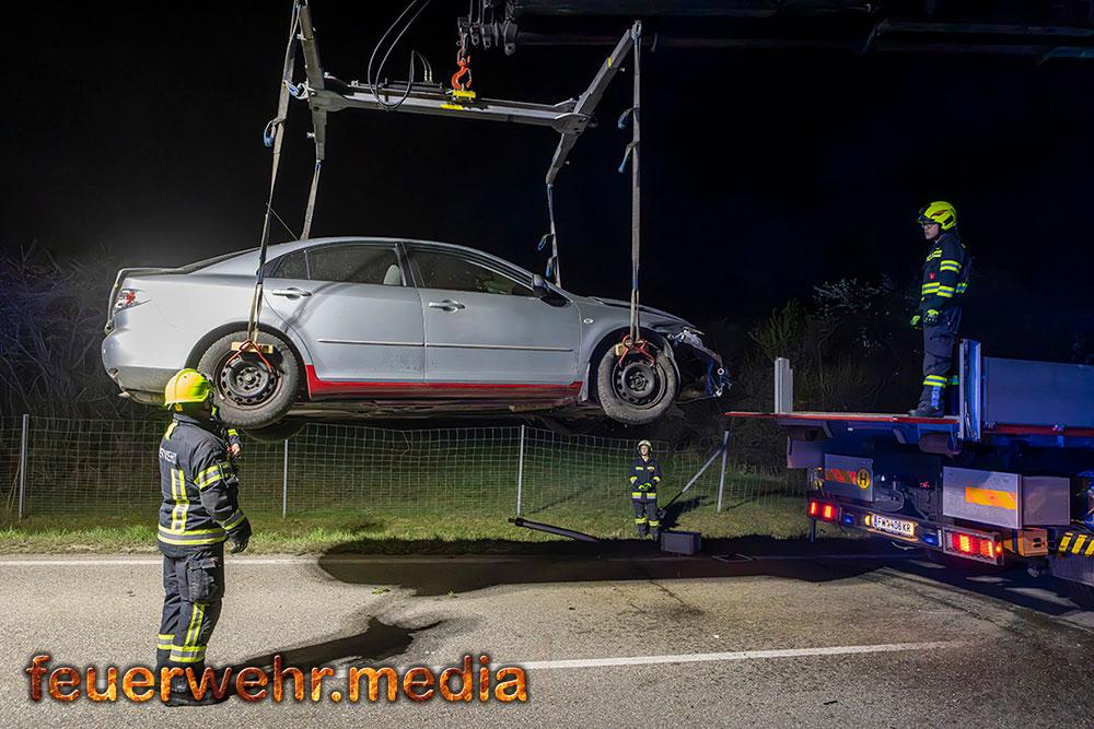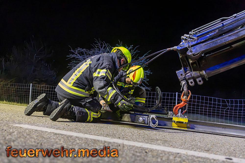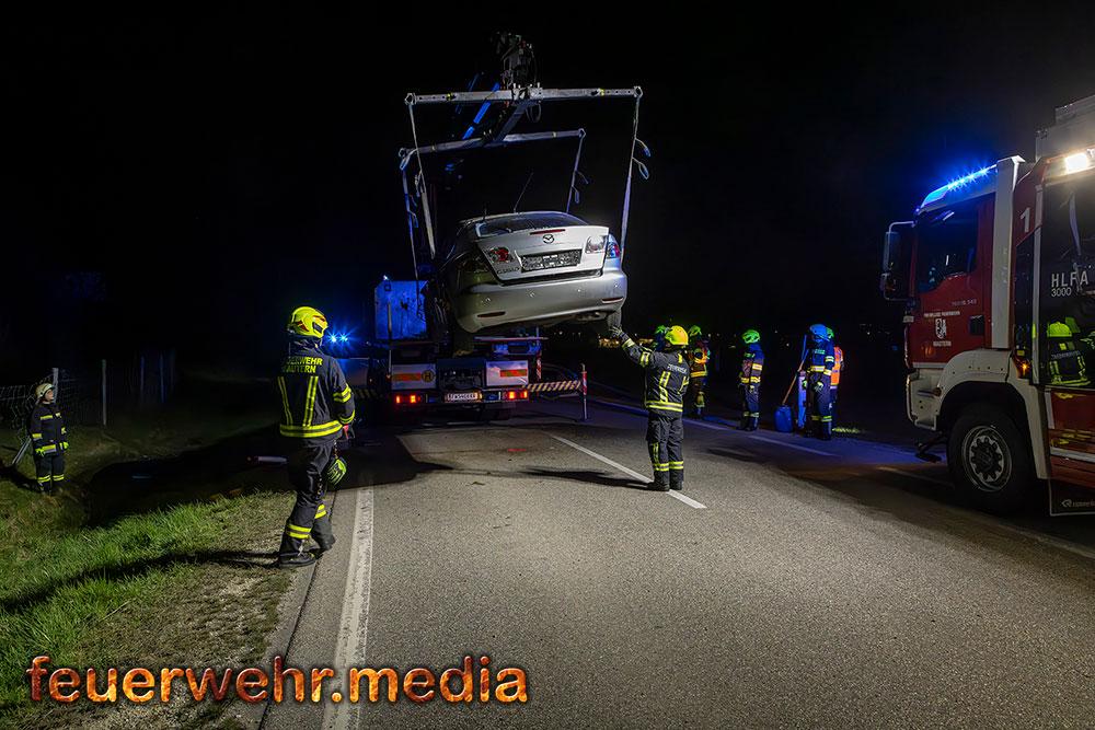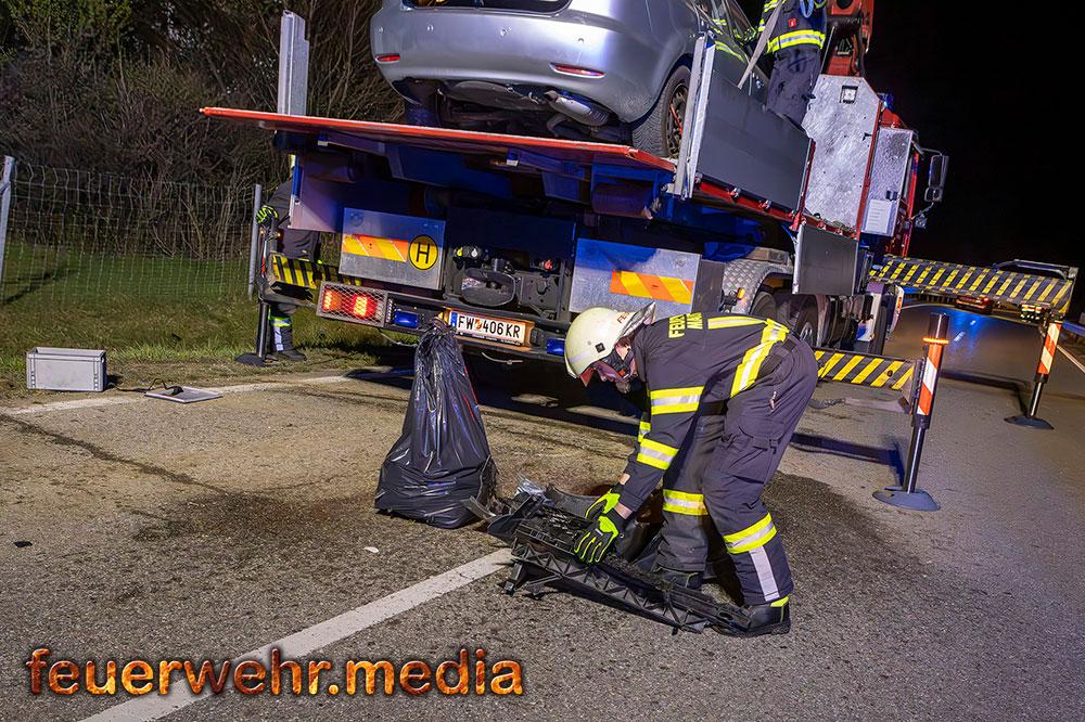 Für die Dauer der Bergungsarbeiten musste die L114 in beiden Fahrtrichtungen komplett gesperrt werden. Nach der polizeilichen Freigabe der Unfallstelle kam das Wechselladefahrzeug der Feuerwehr Mautern zum Einsatz. Mittels Kran und Hebekreuz wurde der schwer beschädigte Pkw behutsam auf das Bergeplateau verladen und anschließend zu einem geeigneten Abstellplatz abtransportiert.