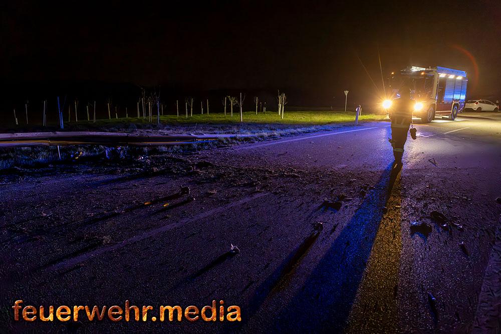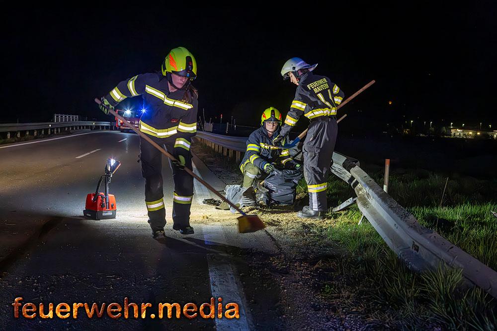 Parallel zur Bergung reinigten die eingesetzten Feuerwehrkräfte die Fahrbahn von weit verstreuten Wrackteilen und Trümmern, um die Verkehrssicherheit wiederherzustellen. Nach rund 90 Minuten konnten beide Feuerwehren den gemeinsamen Einsatz erfolgreich beenden und wieder in ihre jeweiligen Feuerwehrhäuser einrücken.
