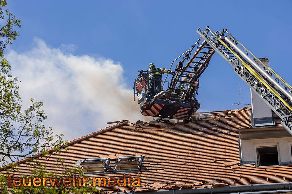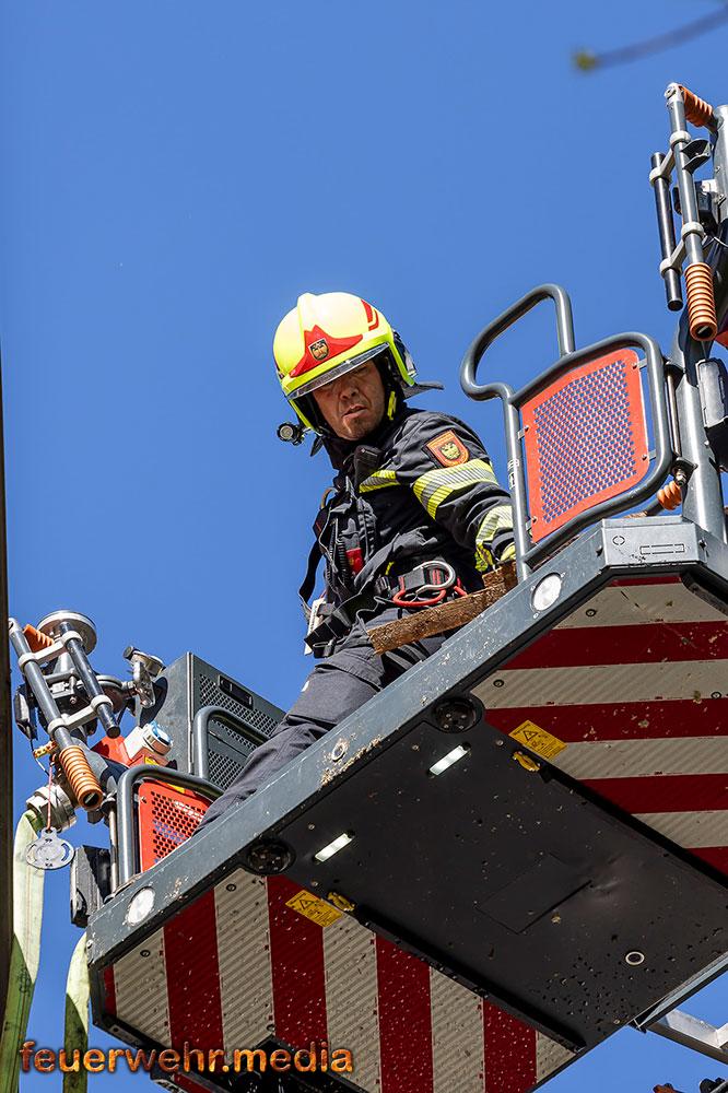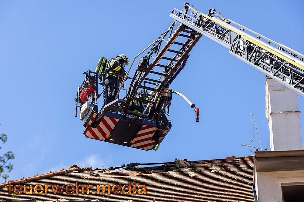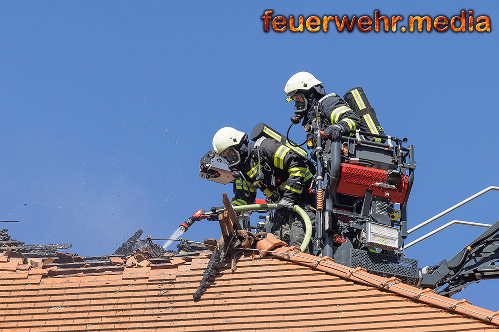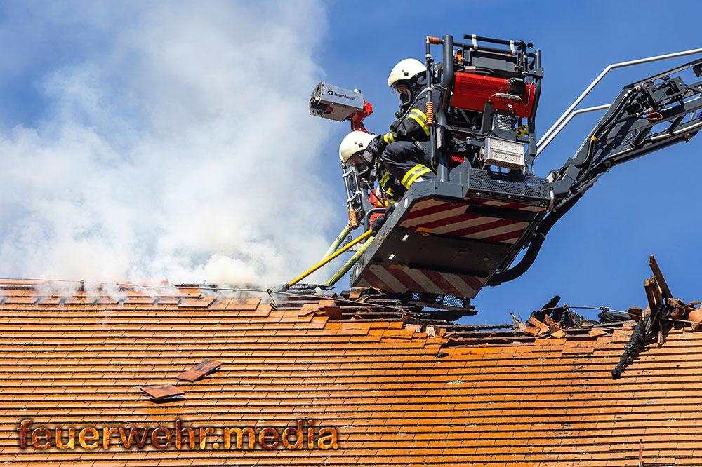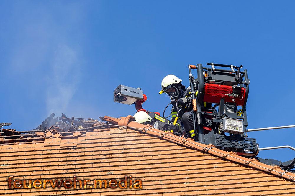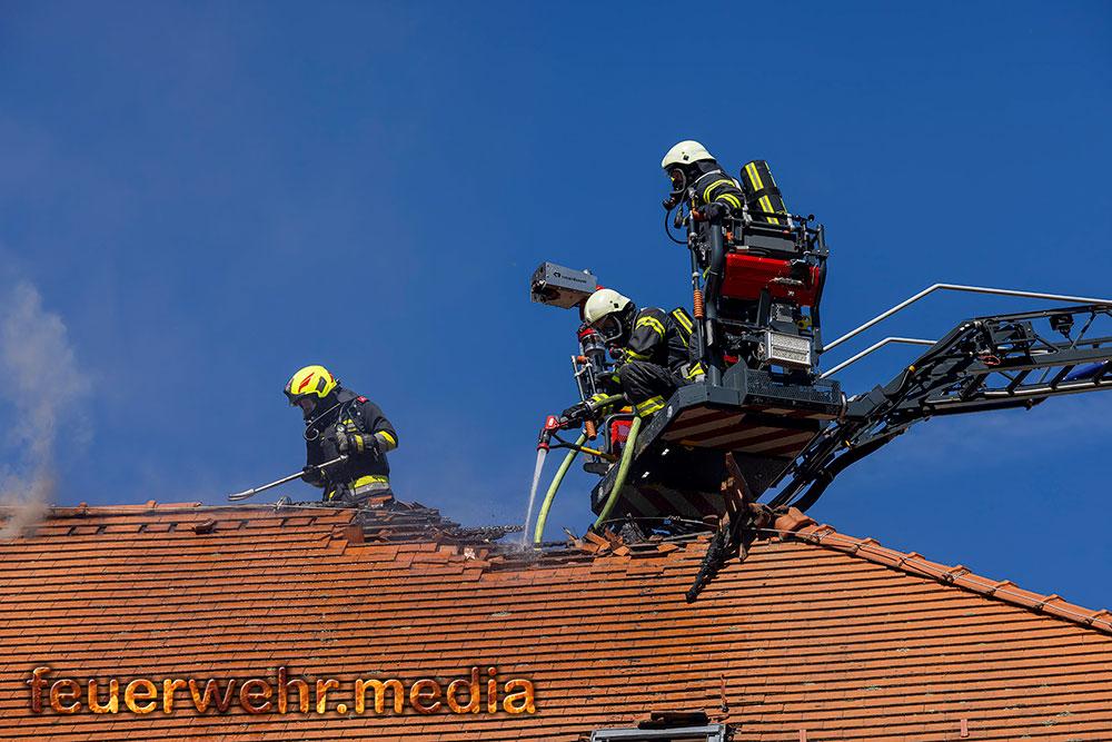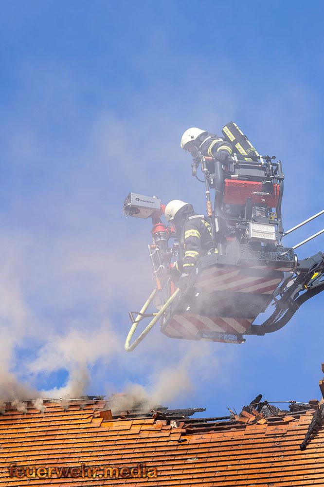 Zu den weiteren Maßnahmen vor Ort zählte das großflächige Öffnen des Daches mittels Motorkettensägen, um Glutnester freizulegen und den Brand gezielt zu bekämpfen. Dieses Vorgehen zeigte rasch Wirkung, sodass der Brand schließlich unter Kontrolle gebracht und abgelöscht werden konnte.