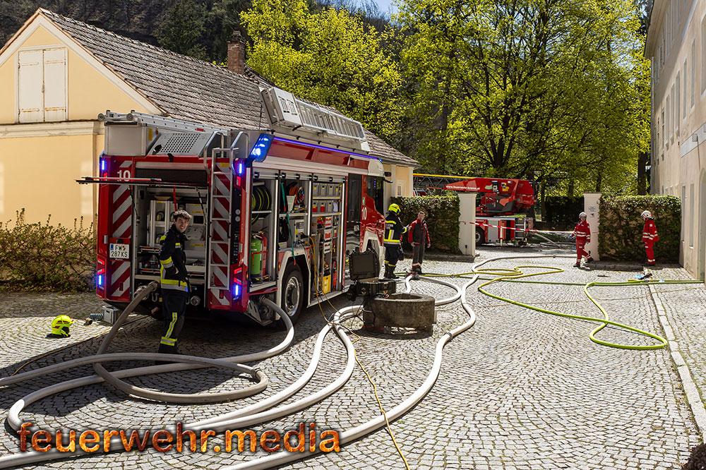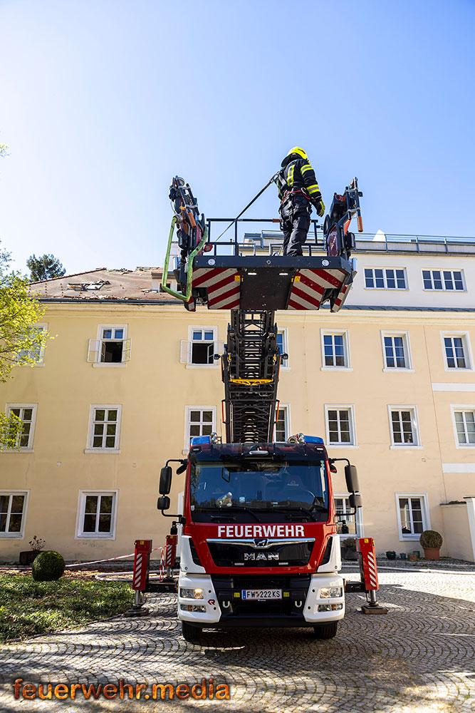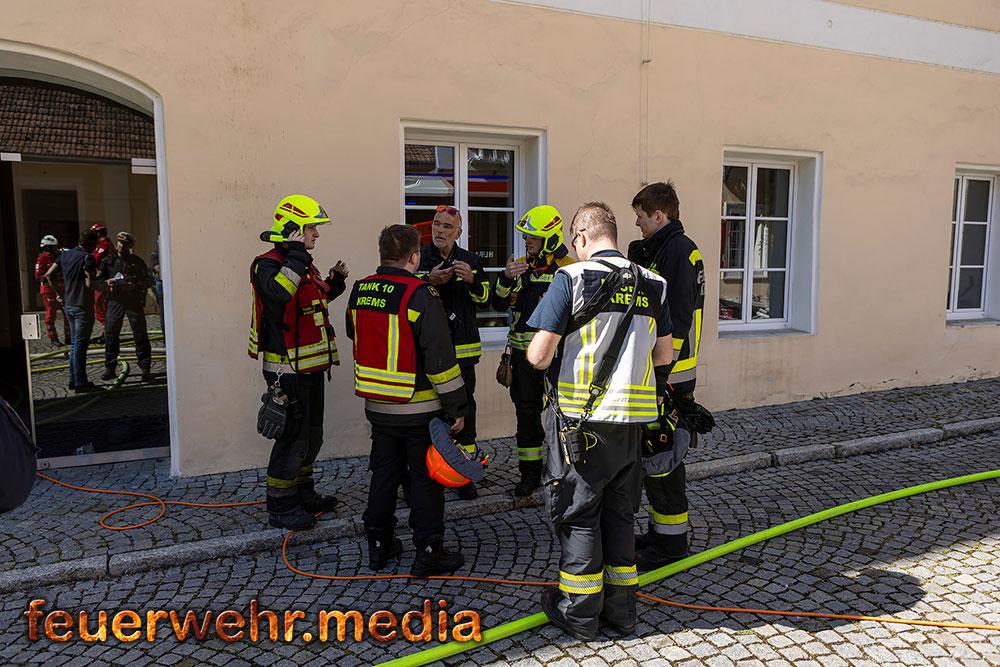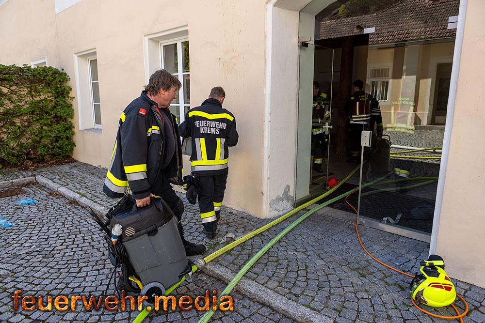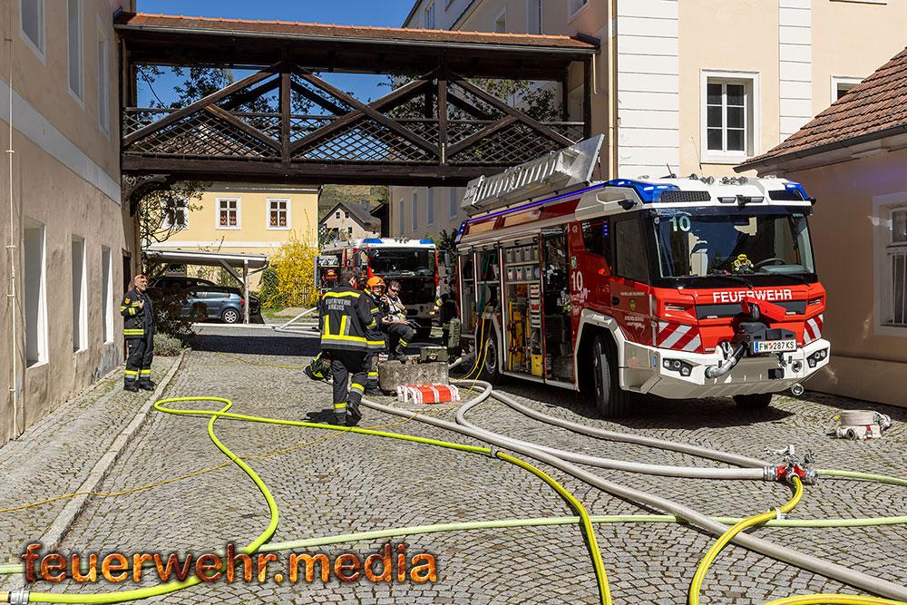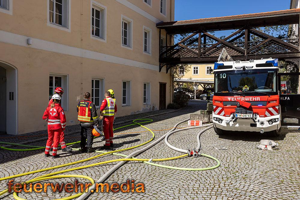 Während der Einsatzleiter die Erkundung durchführte, bereitete ein Atemschutztrupp im Innenhof des Areals eine Löschleitung vor. Rasch gingen die ersten Einsatzkräfte unter Atemschutz in das Dachgeschoss vor, um den Brand zu lokalisieren. Dies gestaltete sich aufgrund der massiven Rauchentwicklung jedoch als schwierig. Daher ließ der Einsatzleiter umgehend die Alarmstufe erhöhen. Es wurden alle Feuerwachen der Feuerwehr Krems zum Brandeinsatz nachalarmiert.
