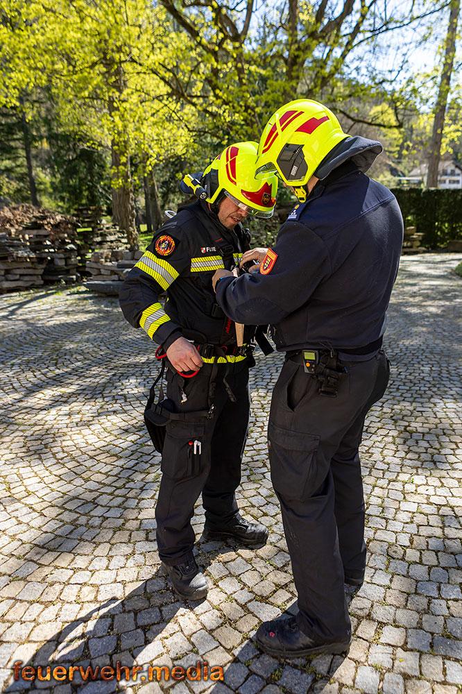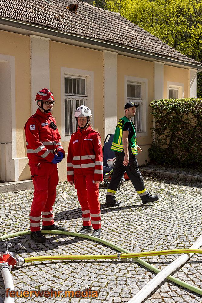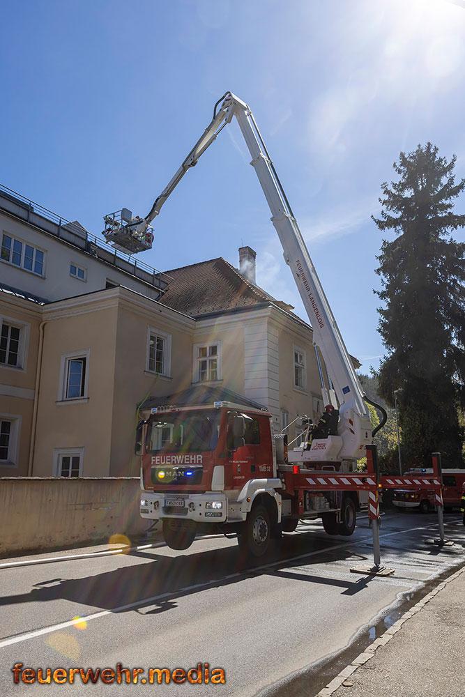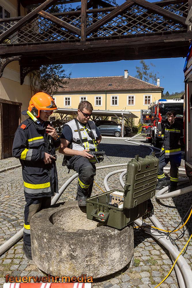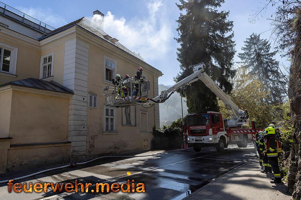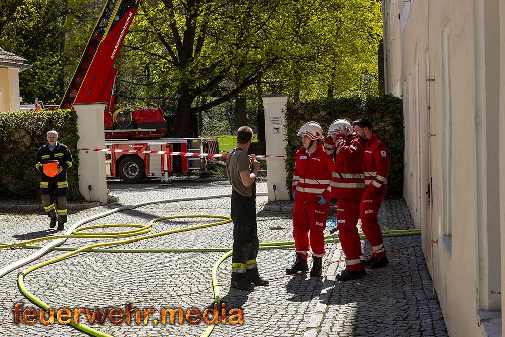 Während der Einsatzleiter die Erkundung durchführte, bereitete ein Atemschutztrupp im Innenhof des Areals eine Löschleitung vor. Rasch gingen die ersten Einsatzkräfte unter Atemschutz in das Dachgeschoss vor, um den Brand zu lokalisieren. Dies gestaltete sich aufgrund der massiven Rauchentwicklung jedoch als schwierig. Daher ließ der Einsatzleiter umgehend die Alarmstufe erhöhen. Es wurden alle Feuerwachen der Feuerwehr Krems zum Brandeinsatz nachalarmiert.