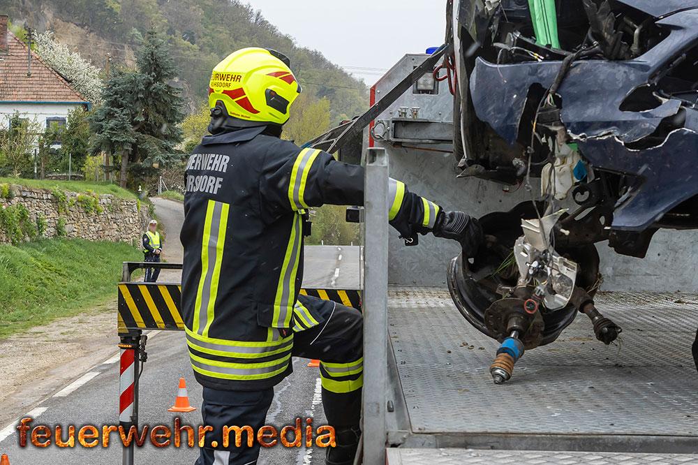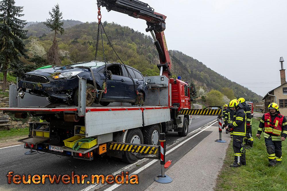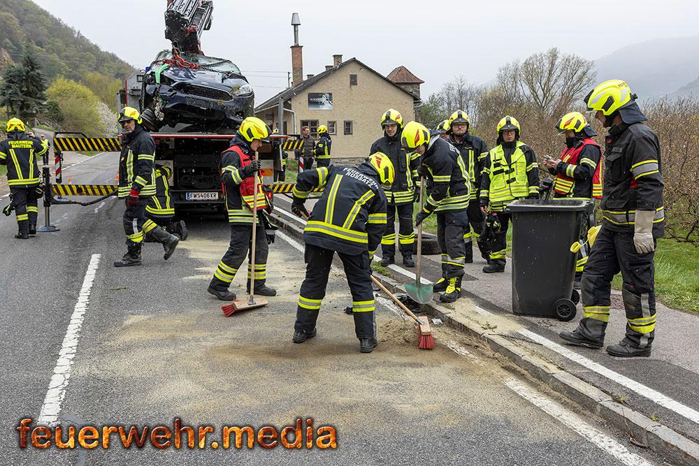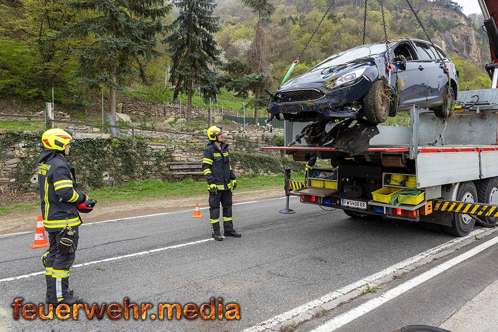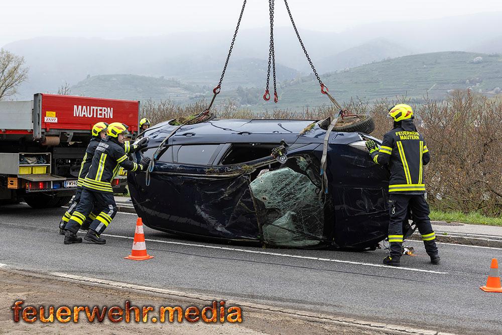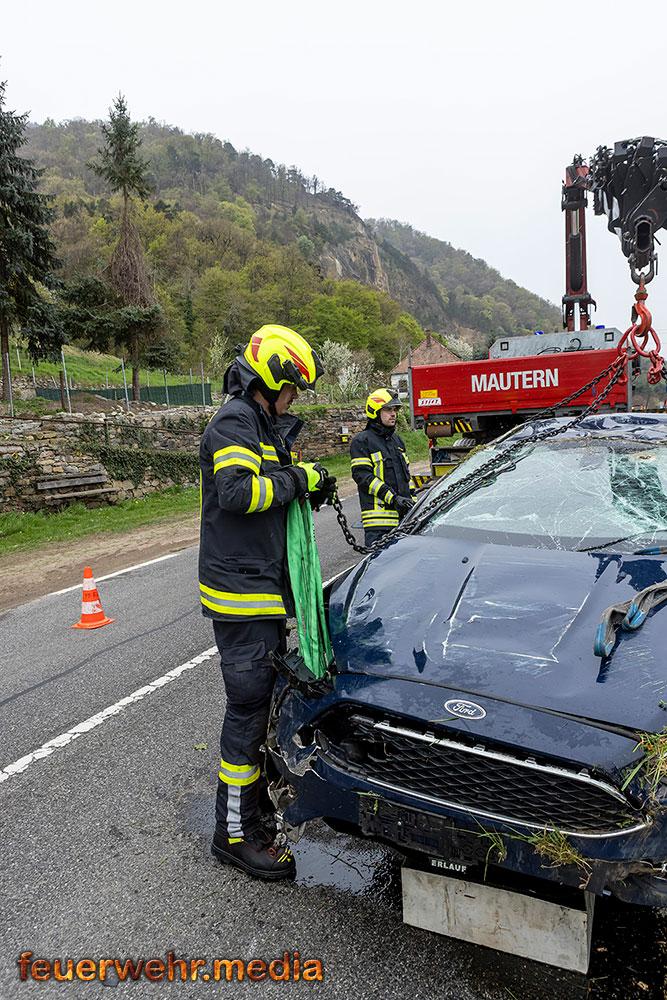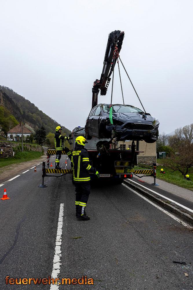 Nach der polizeilichen Unfallaufnahme übernahm die Feuerwehr Mautern gemeinsam mit den anderen Feuerwehren die Fahrzeugbergung. Mittels Kran wurde der Pkw behutsam aus dem Marillengarten zurück auf die Straße gehoben und wieder auf die Räder gestellt. Anschließend wurde das Wrack auf das Wechselladefahrzeug verladen und zu einem geeigneten Abstellplatz transportiert. Parallel dazu banden die Einsatzkräfte ausgelaufene Betriebsmittel und reinigten die Fahrbahn von Trümmerteilen.