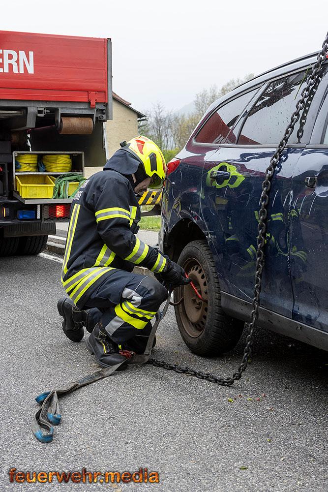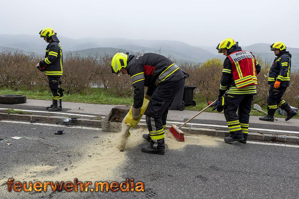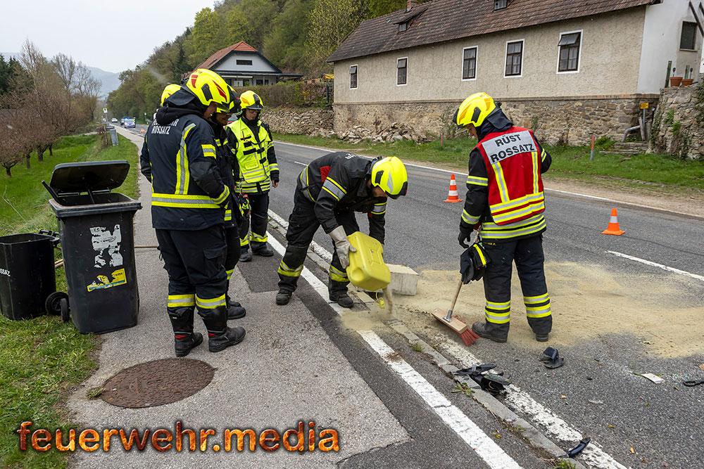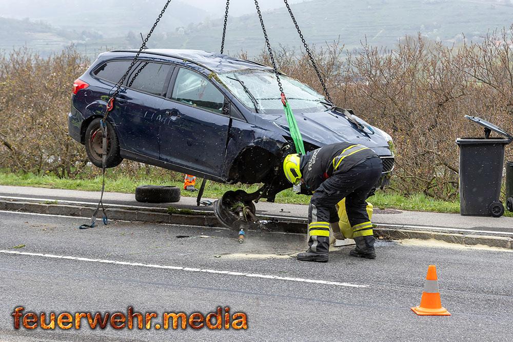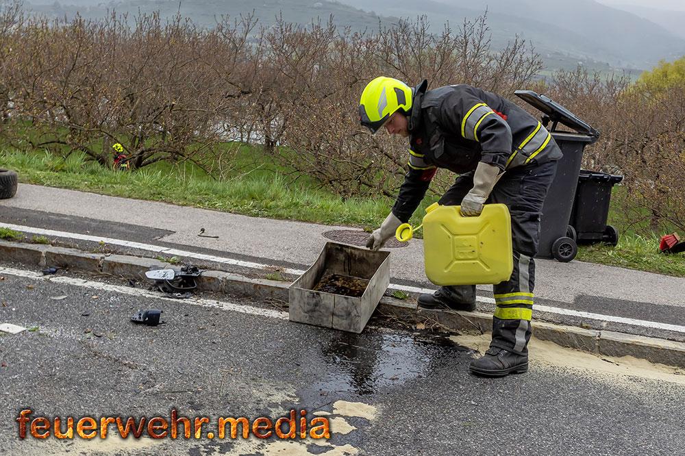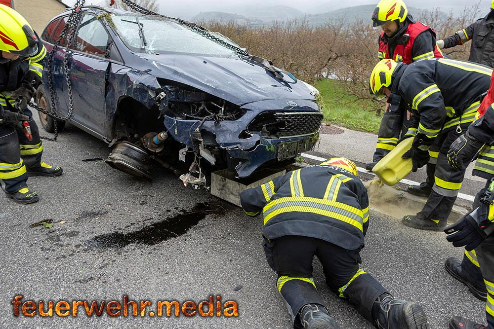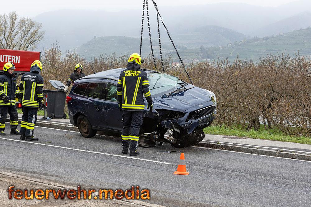 Nach der polizeilichen Unfallaufnahme übernahm die Feuerwehr Mautern gemeinsam mit den anderen Feuerwehren die Fahrzeugbergung. Mittels Kran wurde der Pkw behutsam aus dem Marillengarten zurück auf die Straße gehoben und wieder auf die Räder gestellt. Anschließend wurde das Wrack auf das Wechselladefahrzeug verladen und zu einem geeigneten Abstellplatz transportiert. Parallel dazu banden die Einsatzkräfte ausgelaufene Betriebsmittel und reinigten die Fahrbahn von Trümmerteilen.