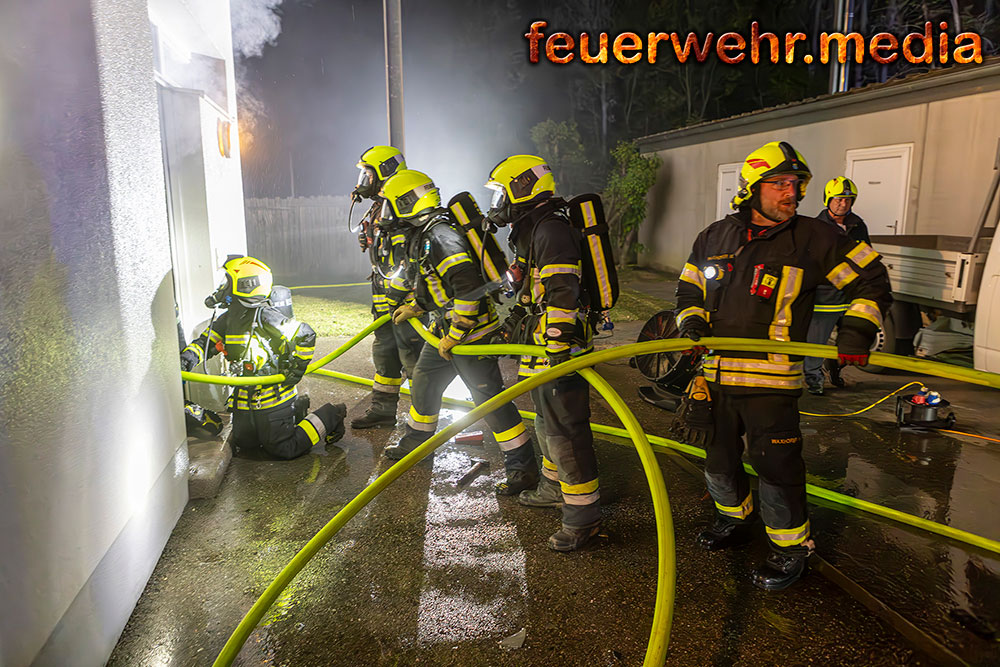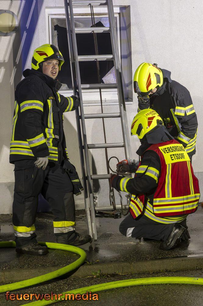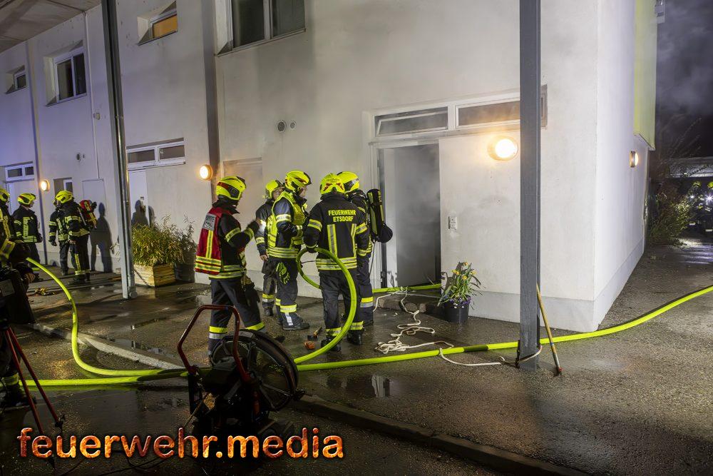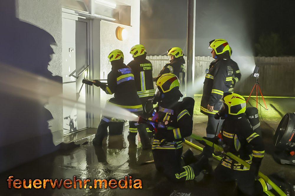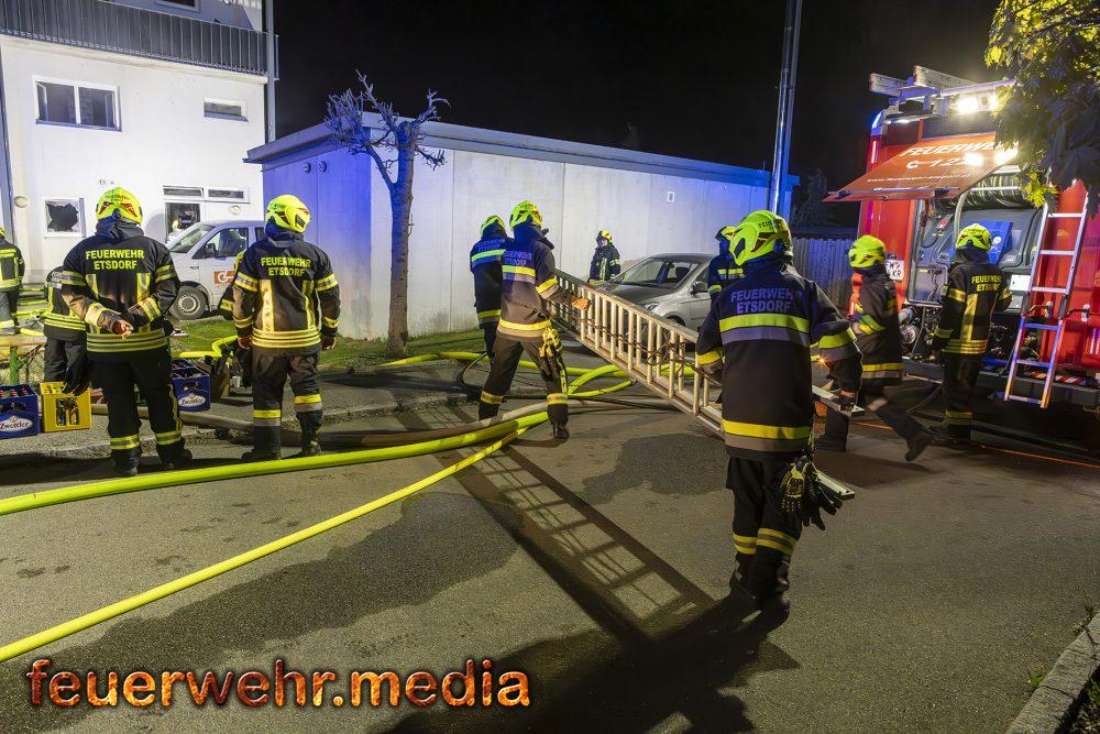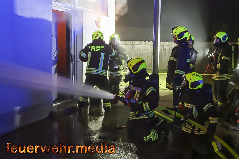Die Feuerwehr Etsdorf startete sofort einen Außenangriff an der Rückseite des Gebäudes, während parallel ein Innenangriff über die Eingangstür vorgetragen wurde. Die Feuerwehr Hadersdorf unterstützte die Brandbekämpfung auf der Gebäuderückseite maßgeblich.