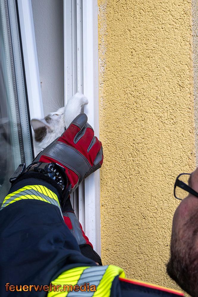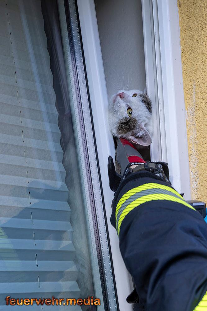 Noch vor Eintreffen der Einsatzkräfte bewies eine Anzeigerin große Zivilcourage und Instinkt: Um den Druck auf den Körper des Tieres zu minimieren und ein weiteres Abrutschen in den engen Fensterspalt zu verhindern, schob sie eine Sitzbank unter das Fenster um zu dem Tier zu gelangen. Indem sie die Katze händisch nach oben stützte, sicherte sie dem Tier wertvolle Minuten.